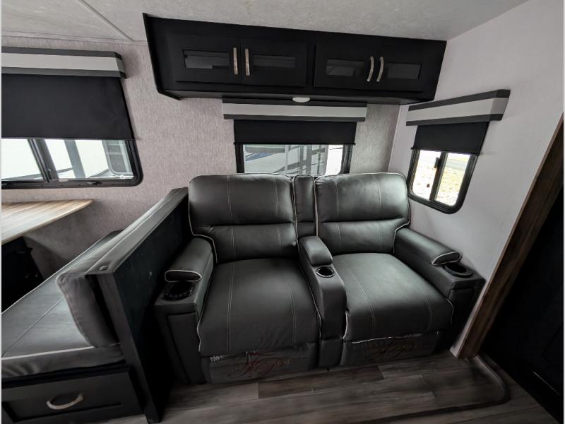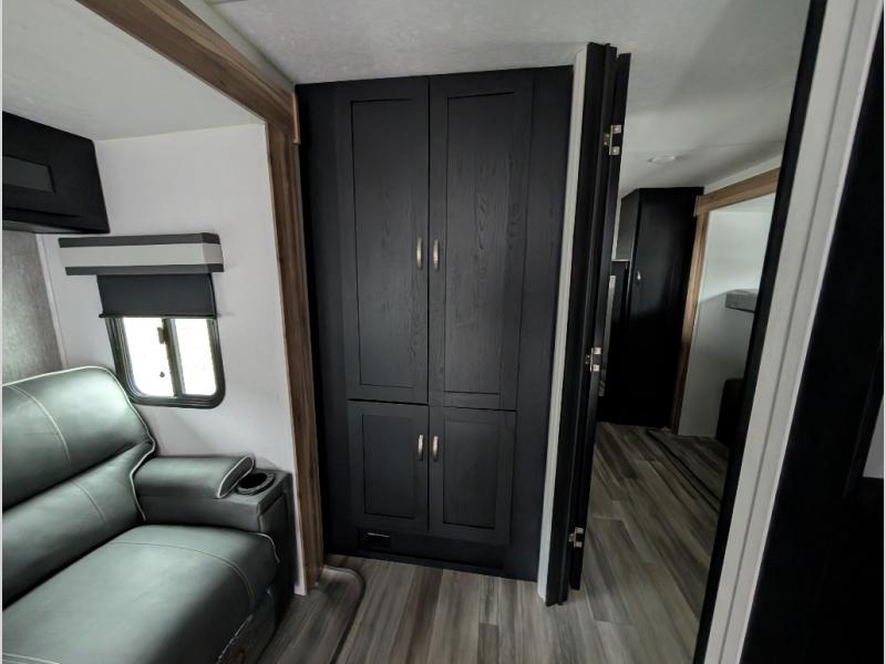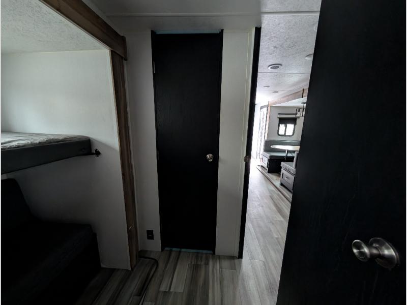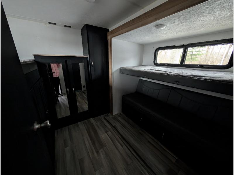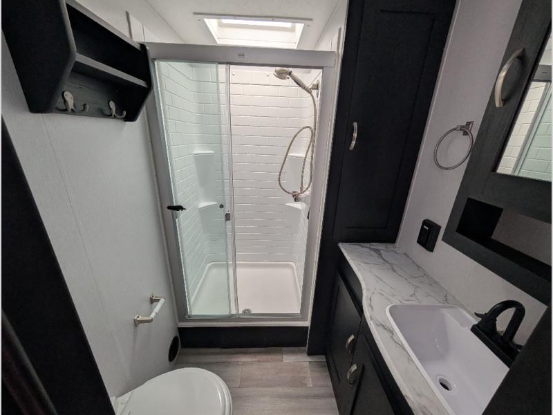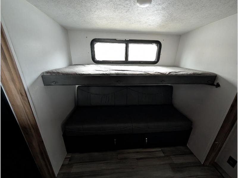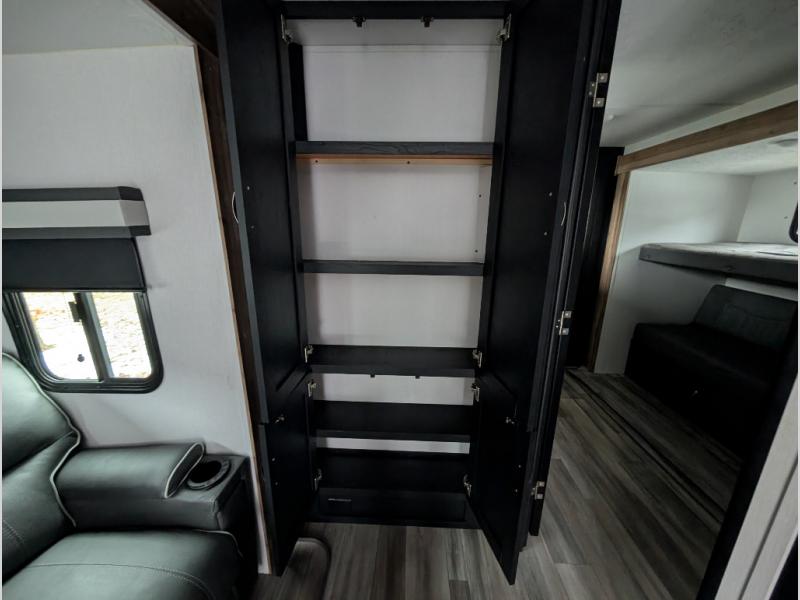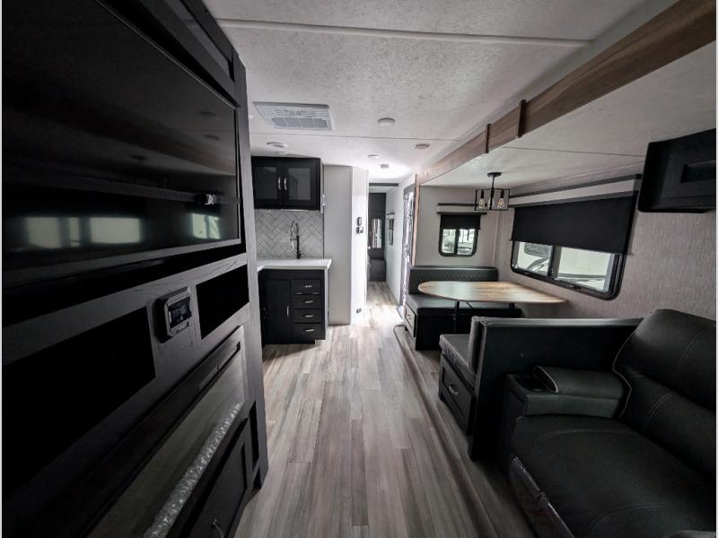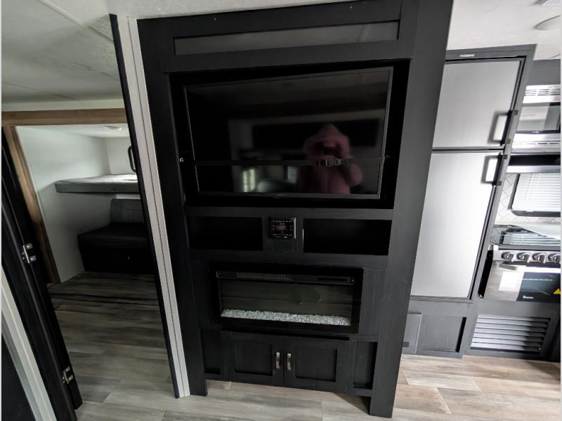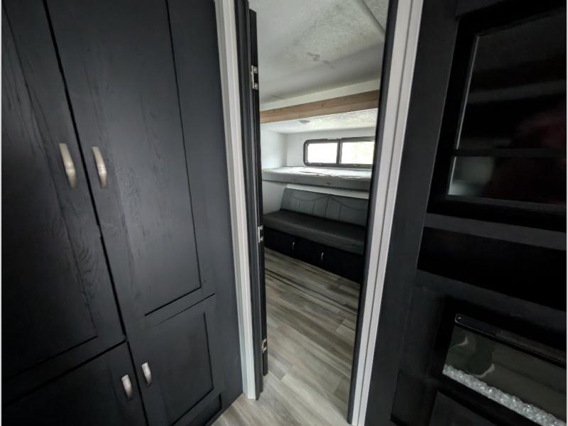 Whether you camp to explore outdoors or relax inside with friends and family, this trailer will offer many conveniences of home as well as privacy when needed! You will have your own front bedroom with a space saving sliding door, a walk-around queen bed with vaulted underbed storage, and the full bathroom is just a few steps away with access from the hallway. Your friends will appreciate having a private bunkhouse suite with a half bath, a slide out flip-up bunk with a roll-over sofa below, plus another upper bunk and wardrobes plus countertop storage. The main living and kitchen area offers a slide out hide-a-bed sofa or choose a theater seat option, and a booth dinette, plus there is an LED TV and fireplace to enjoy. And the chef will have two choices, cook inside with full amenities or outside on the full camp kitchen while others relax under the two power awnings.
