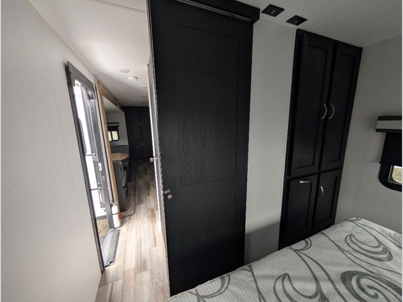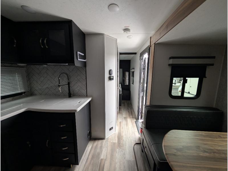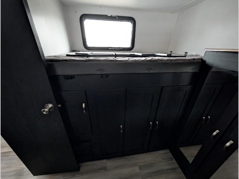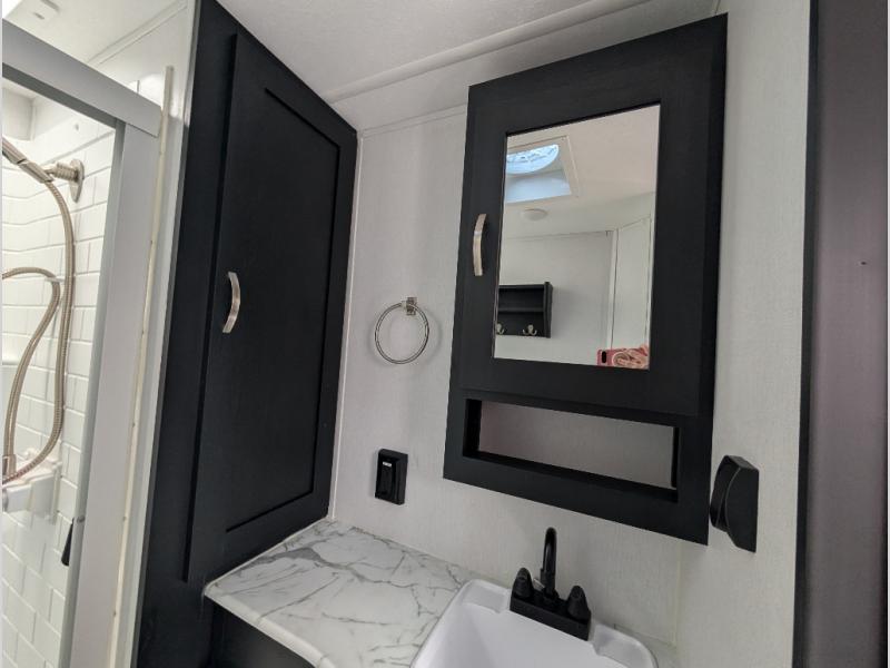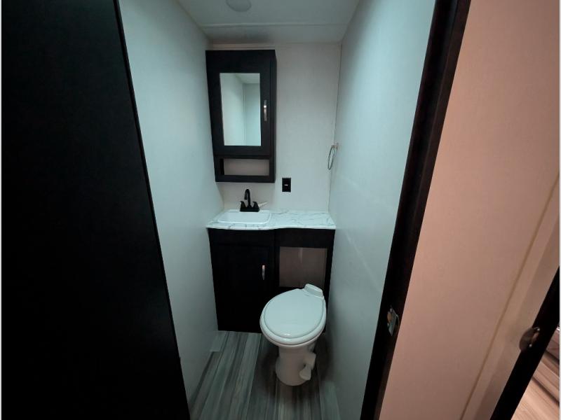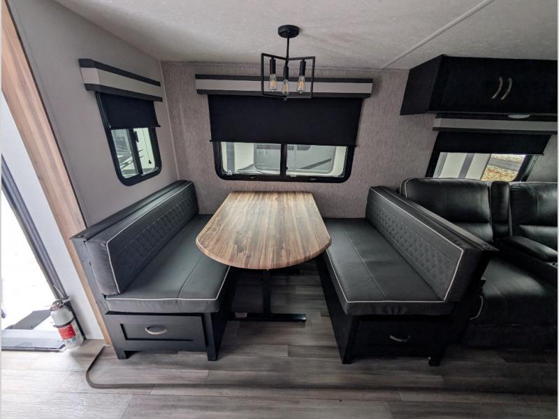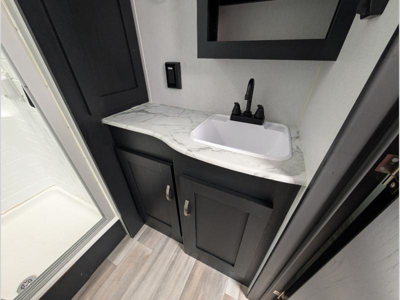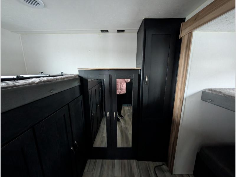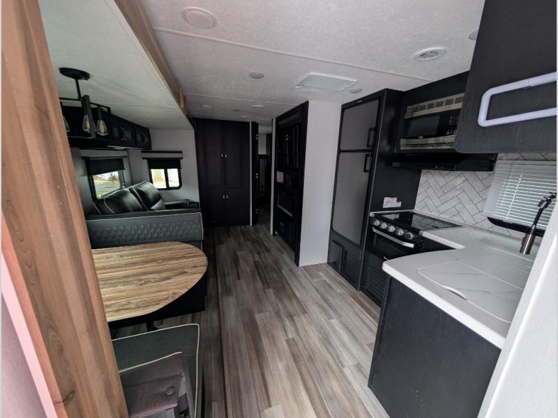 Whether you camp to explore outdoors or relax inside with friends and family, this trailer will offer many conveniences of home as well as privacy when needed! You will have your own front bedroom with a space saving sliding door, a walk-around queen bed with vaulted underbed storage, and the full bathroom is just a few steps away with access from the hallway. Your friends will appreciate having a private bunkhouse suite with a half bath, a slide out flip-up bunk with a roll-over sofa below, plus another upper bunk and wardrobes plus countertop storage. The main living and kitchen area offers a slide out hide-a-bed sofa or choose a theater seat option, and a booth dinette, plus there is an LED TV and fireplace to enjoy. And the chef will have two choices, cook inside with full amenities or outside on the full camp kitchen while others relax under the two power awnings.