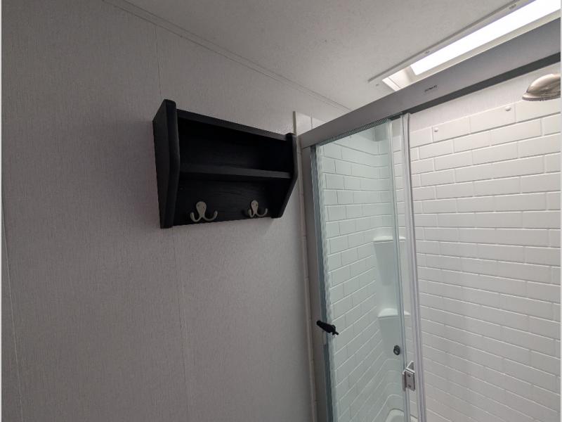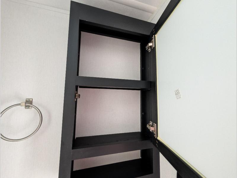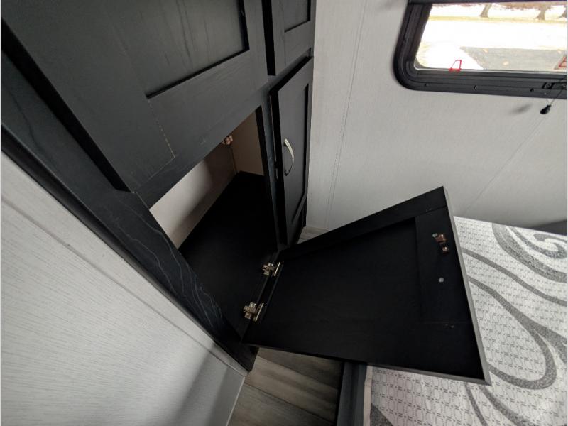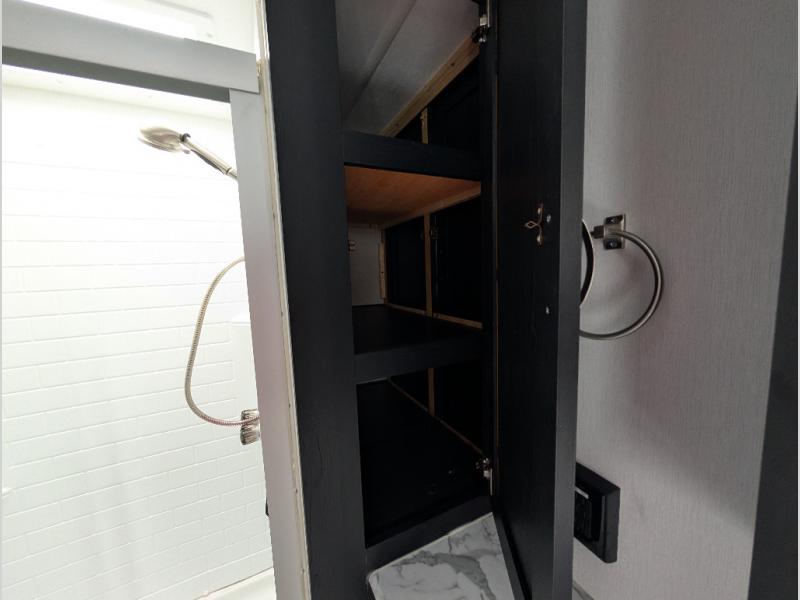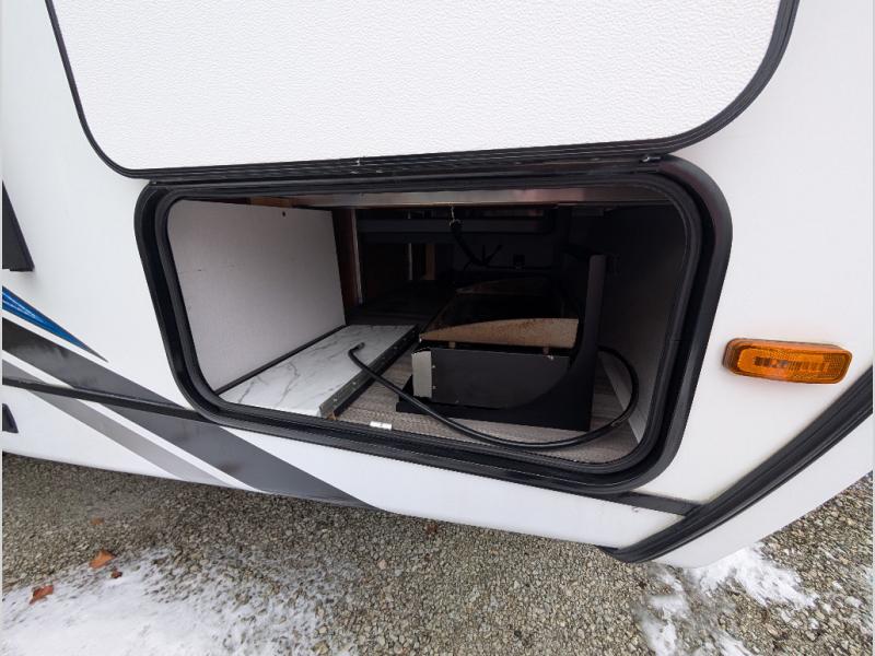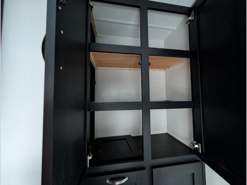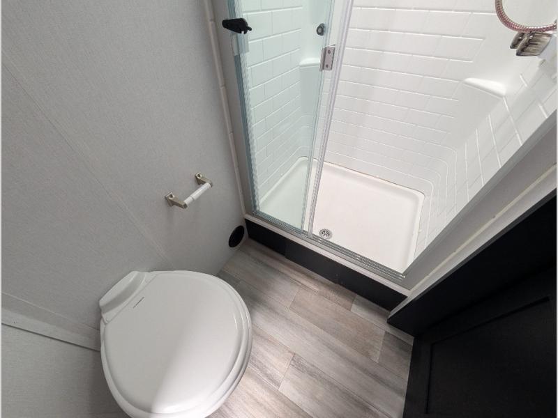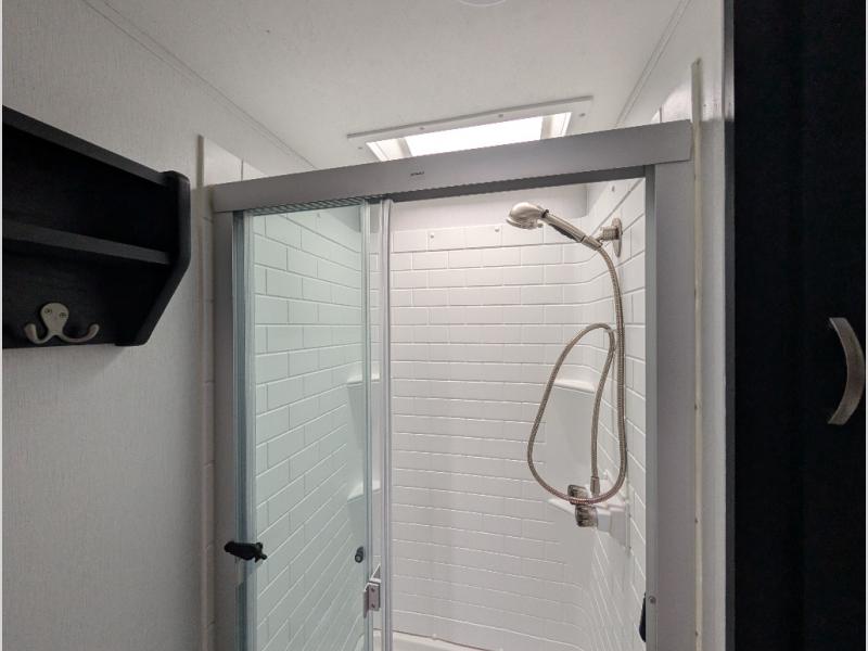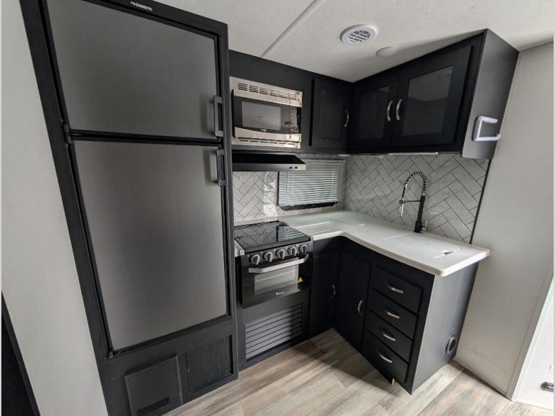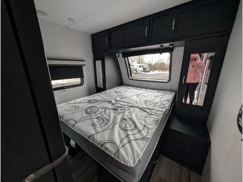 Whether you camp to explore outdoors or relax inside with friends and family, this trailer will offer many conveniences of home as well as privacy when needed! You will have your own front bedroom with a space saving sliding door, a walk-around queen bed with vaulted underbed storage, and the full bathroom is just a few steps away with access from the hallway. Your friends will appreciate having a private bunkhouse suite with a half bath, a slide out flip-up bunk with a roll-over sofa below, plus another upper bunk and wardrobes plus countertop storage. The main living and kitchen area offers a slide out hide-a-bed sofa or choose a theater seat option, and a booth dinette, plus there is an LED TV and fireplace to enjoy. And the chef will have two choices, cook inside with full amenities or outside on the full camp kitchen while others relax under the two power awnings.