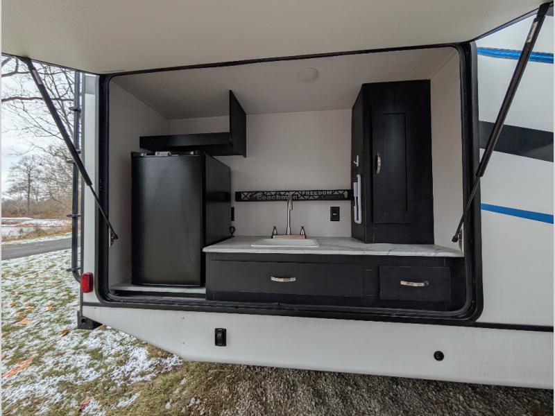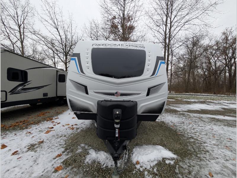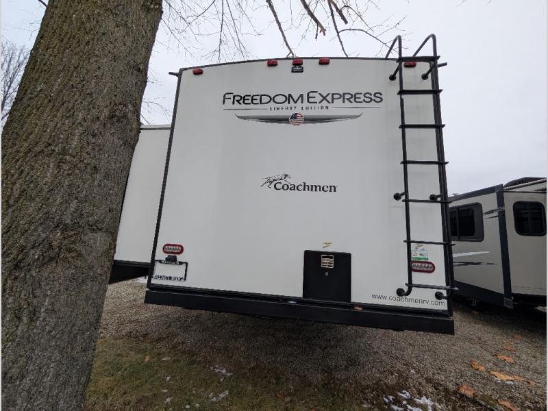With any Coachmen Freedom Express Liberty Edition travel trailer, there is aluminum cage construction, vacuum bonded interior and exterior walls with Azdel composite, a heated and enclosed underbelly for four seasons of travel, and Tufflex PVC roofing. Some other features include hidden hinge cabinetry, Carefree flooring, a porcelain toilet, and the AIR 360+ amplified omnidirectional VHF/UHF, FM and WiFi antenna with optional 4G LTE Gateway add-on. And the required Express Pack includes an exterior griddle with side table, 50 AMP service, frameless windows and a ladder to reach the roof.