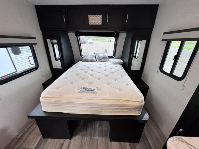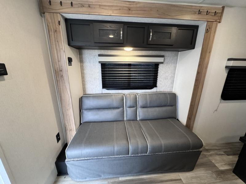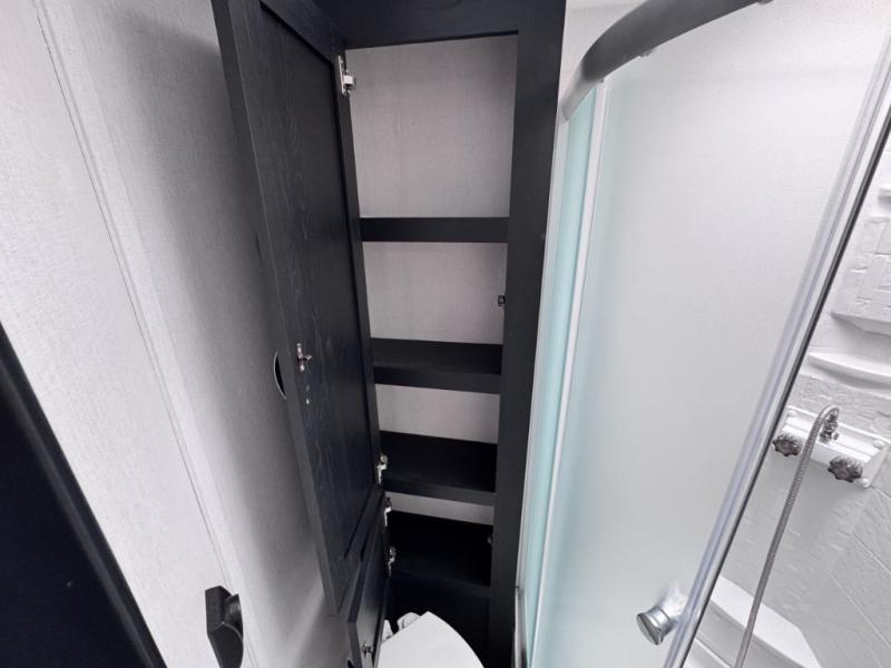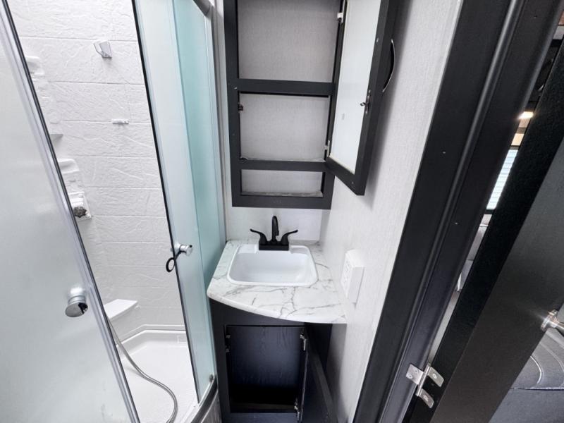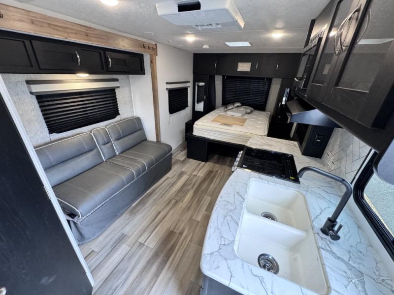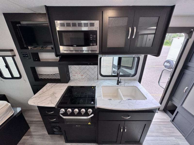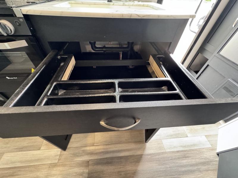 This is the perfect couple's trailer to take to the lake every other weekend. You will enjoy your own queen bed up front that includes vaulted under-bed storage for your luggage. The sofa slide out with a free-standing table provides a place to relax and dine together, and if you have an overnight guest, they can sleep here. The chef can prepare meals on the three burner cooktop or in the microwave oven, and there is a dual basin American stonecast sink for easy clean up. This model also includes a full bath with a linen closet for clean towels, and a 32" radius shower with a skylight for more standing space.