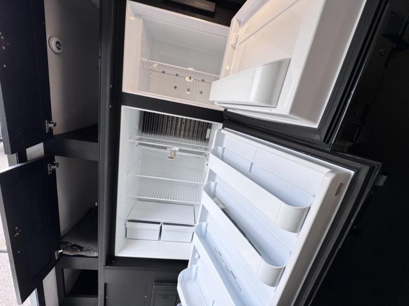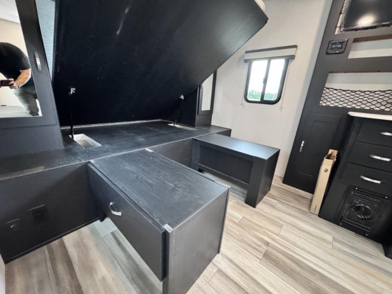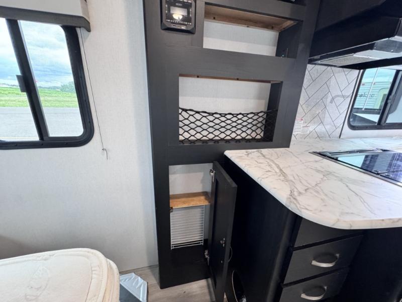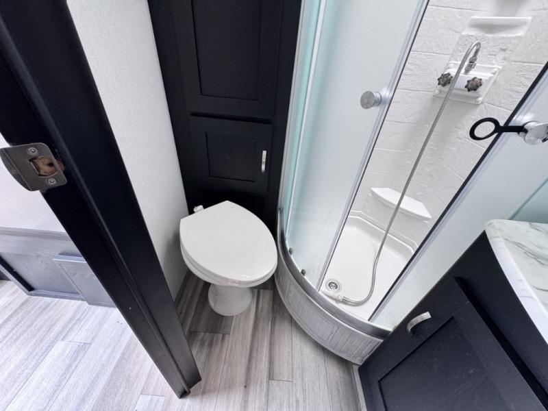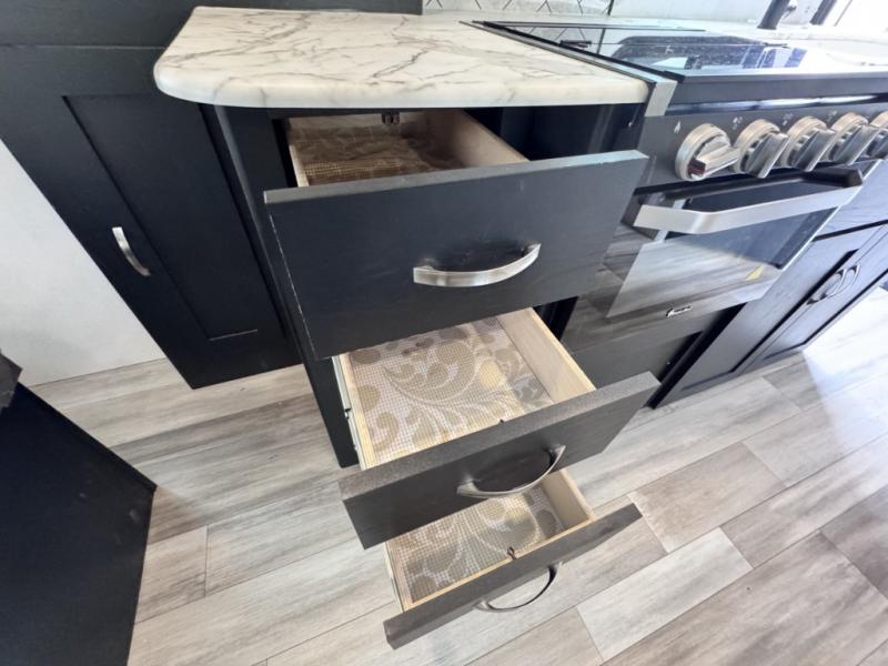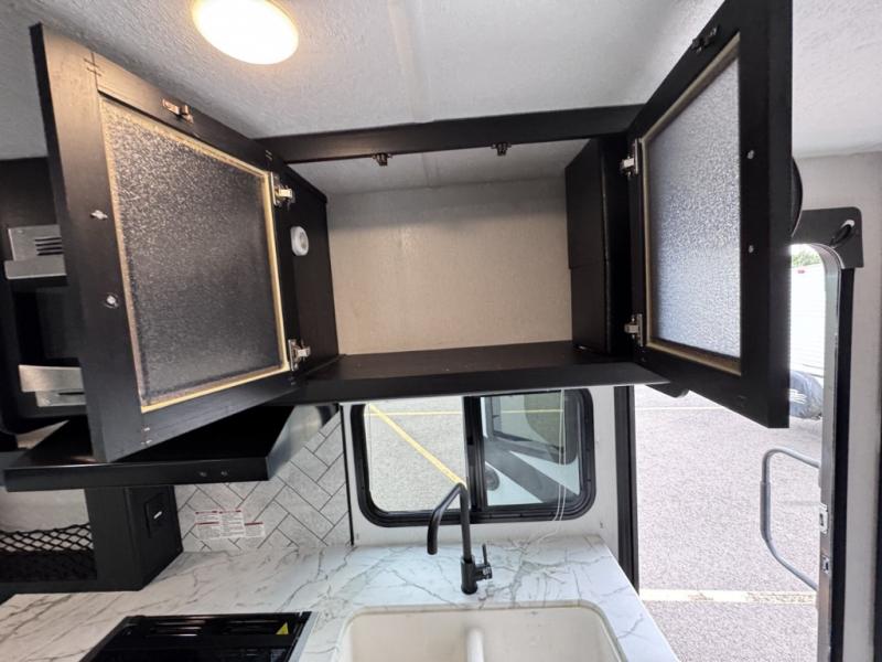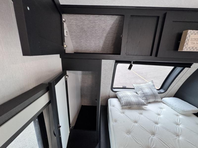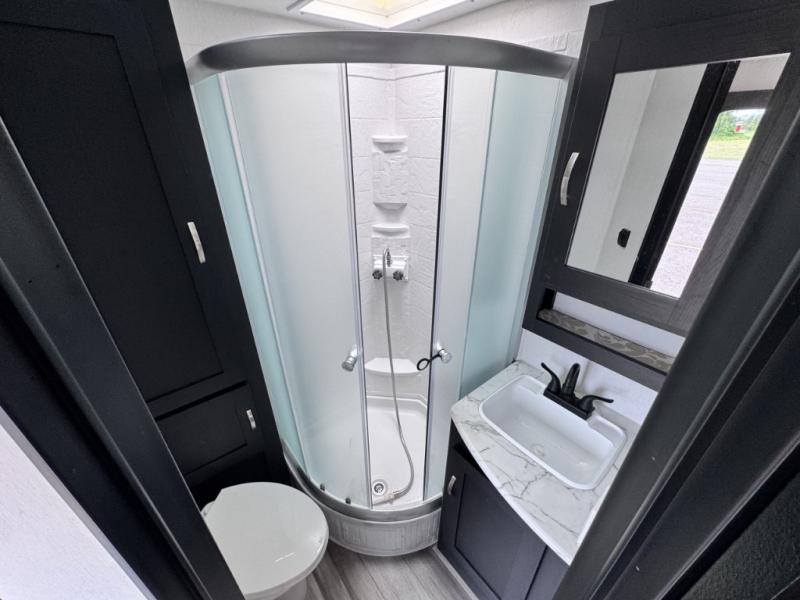 This is the perfect couple's trailer to take to the lake every other weekend. You will enjoy your own queen bed up front that includes vaulted under-bed storage for your luggage. The sofa slide out with a free-standing table provides a place to relax and dine together, and if you have an overnight guest, they can sleep here. The chef can prepare meals on the three burner cooktop or in the microwave oven, and there is a dual basin American stonecast sink for easy clean up. This model also includes a full bath with a linen closet for clean towels, and a 32" radius shower with a skylight for more standing space.