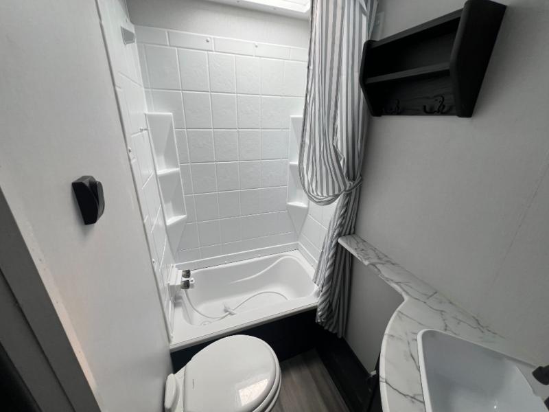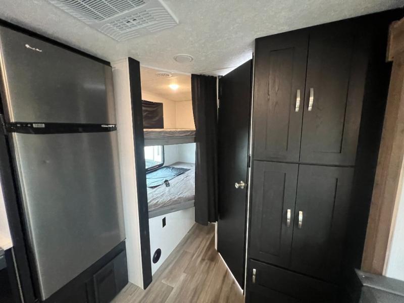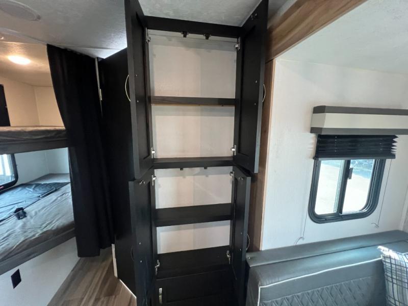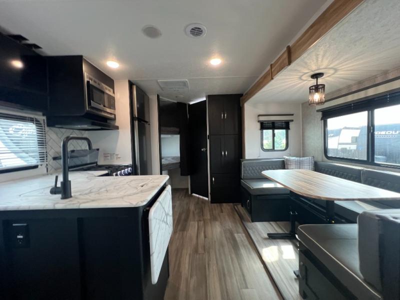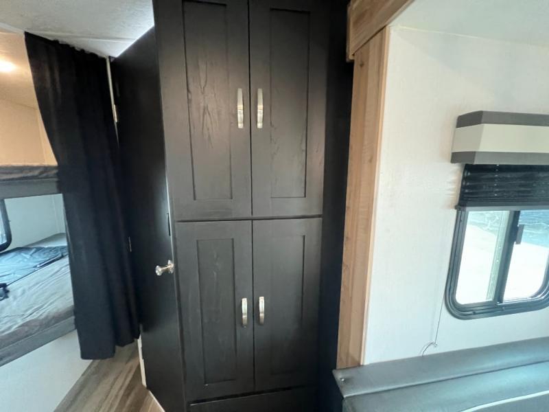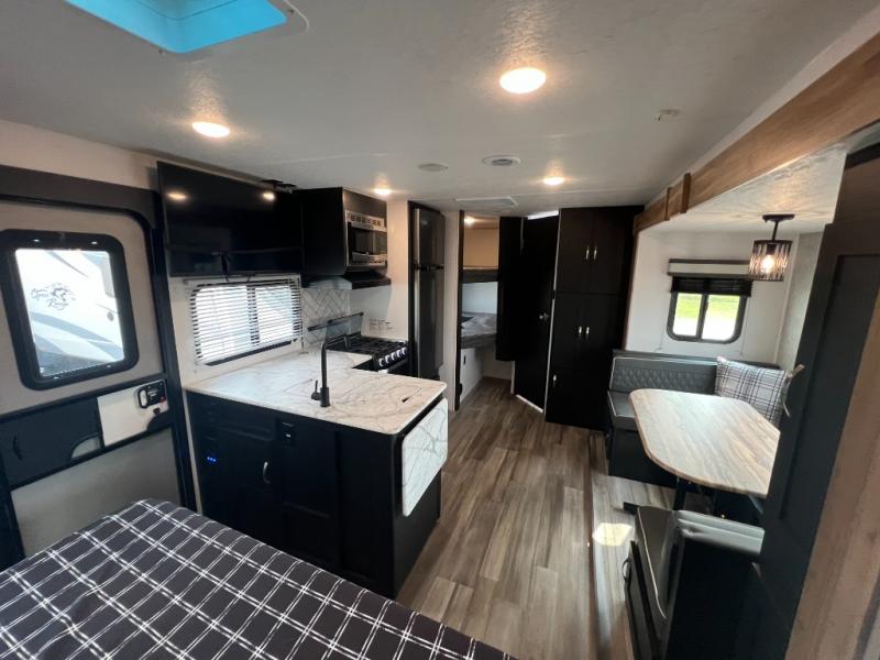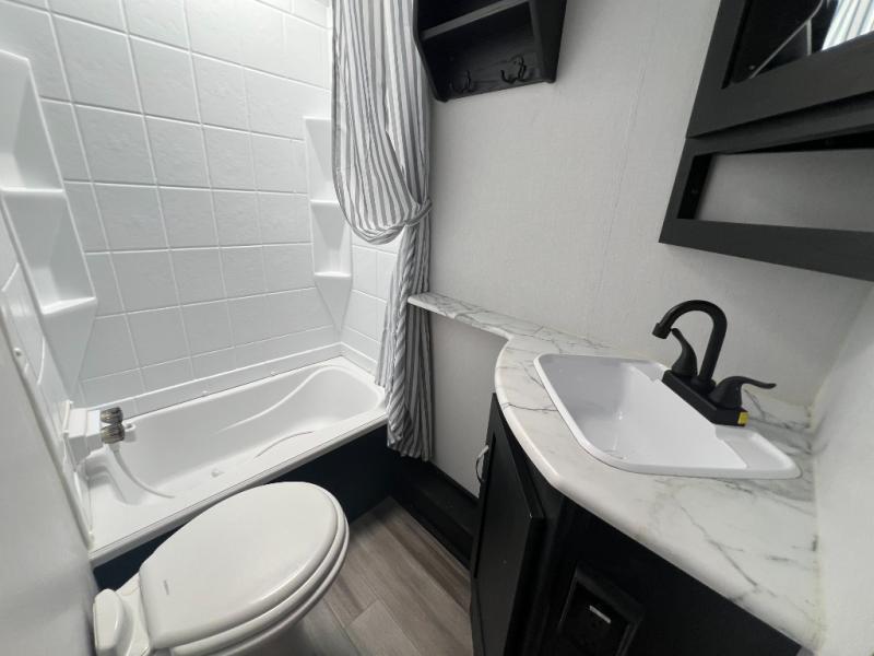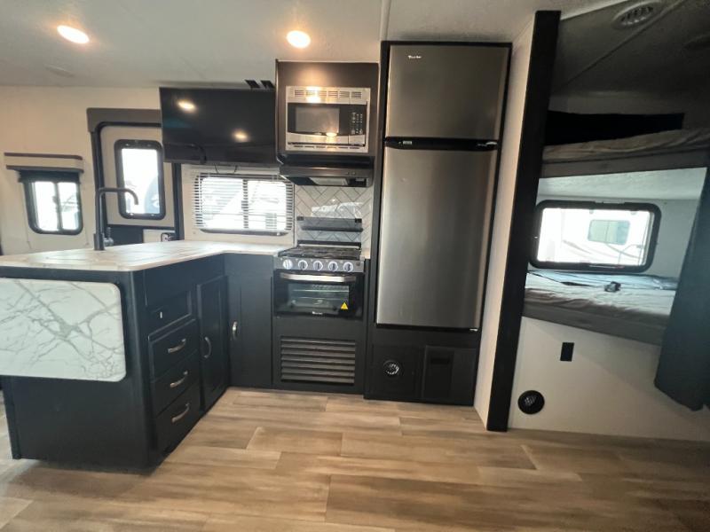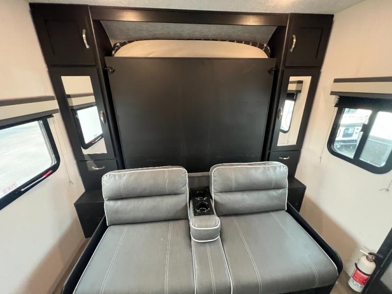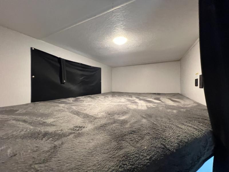 You can comfortably sleep eight in this travel trailer thanks to the double-size bunks, the U-shaped dinette, and the queen Murphy bed. You can cook breakfast for everyone on the pull-out camp kitchen before you head out for the day, and don't forget the fishing poles from the pass-through storage! This model includes a full bath with a tub/shower that will make bath time for the littles ones easier than ever. After everyone is cleaned up and dinner is put away, you may decide to make it a movie night with the LED TV!