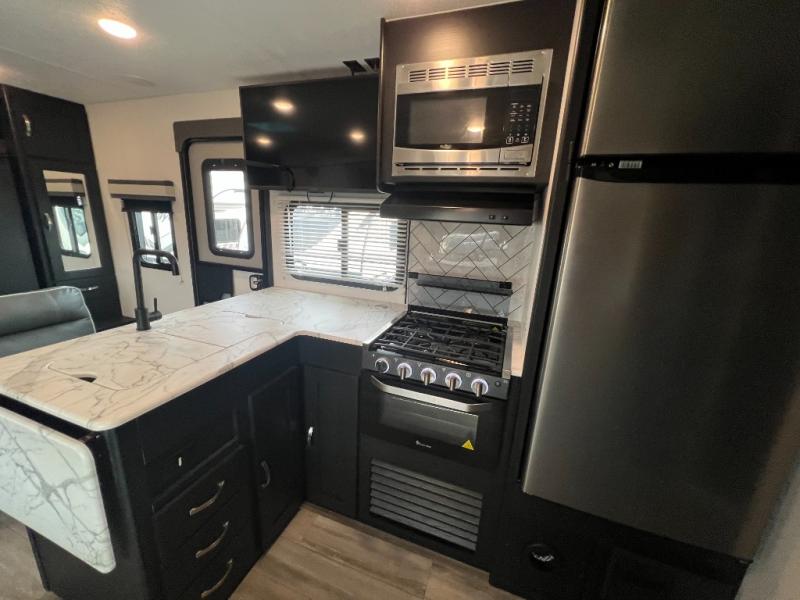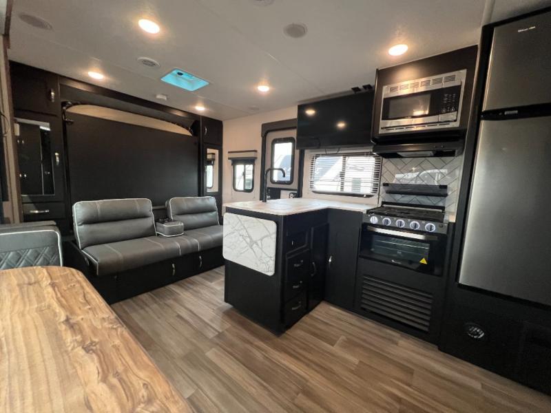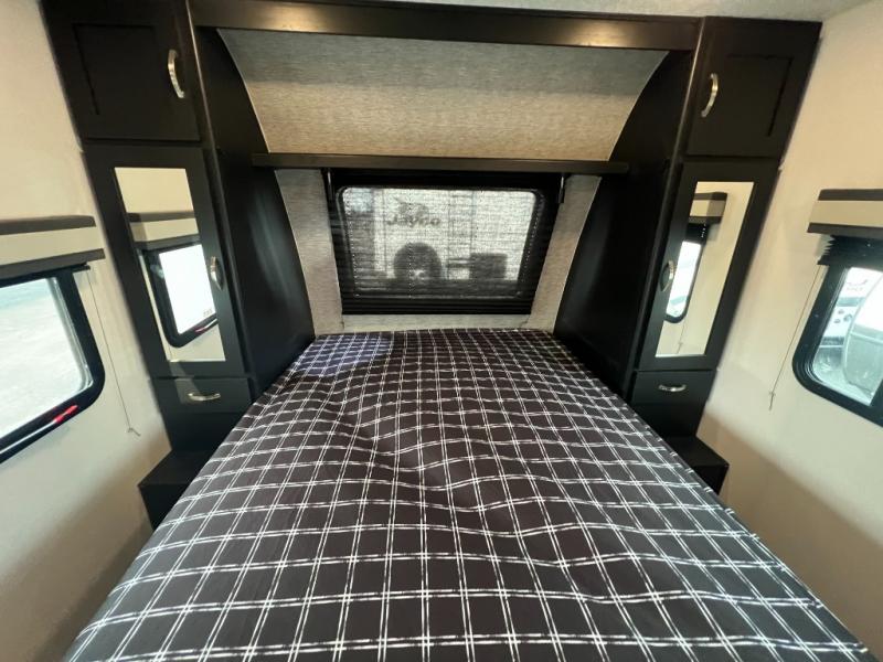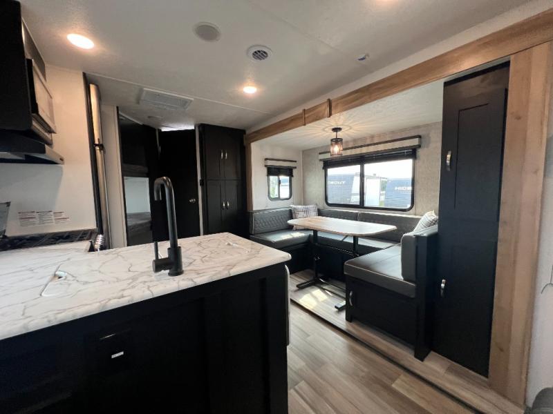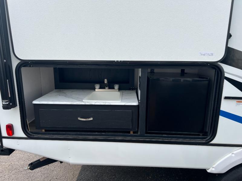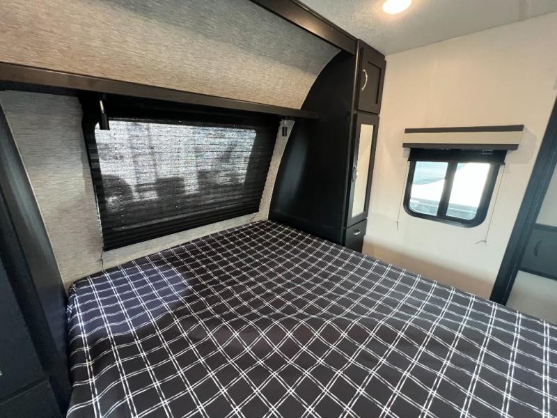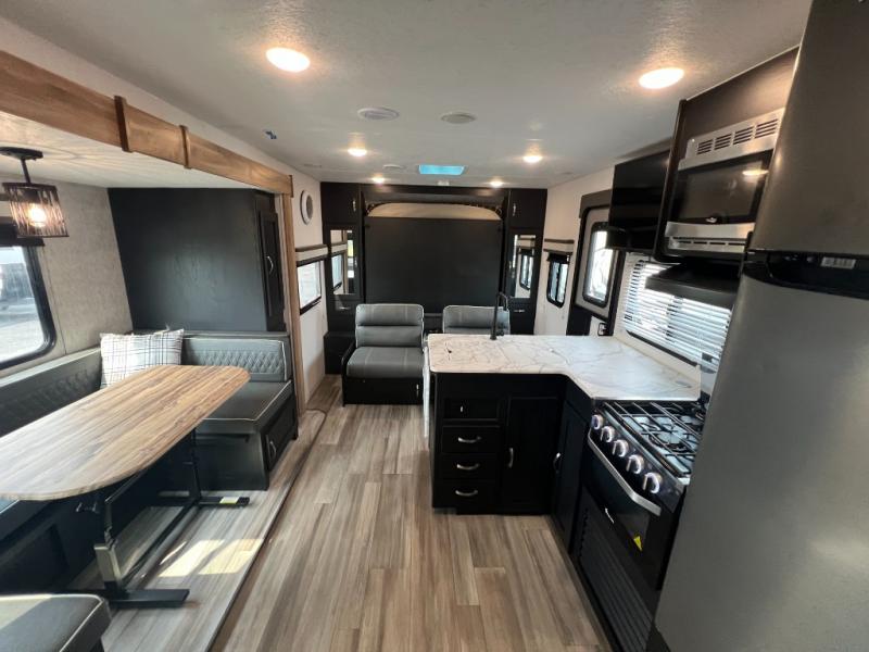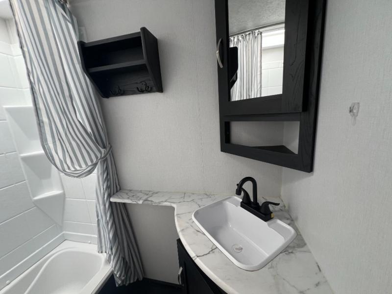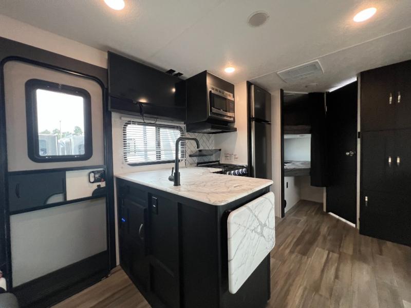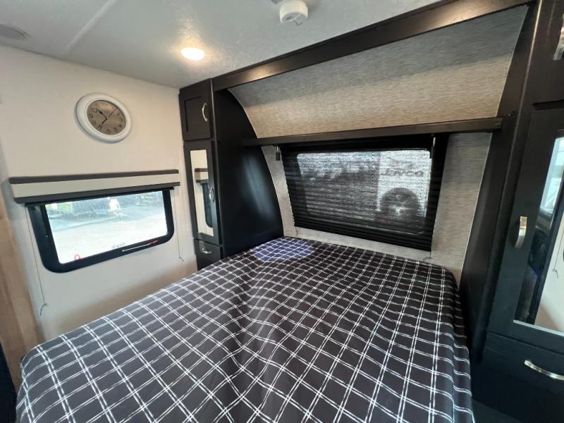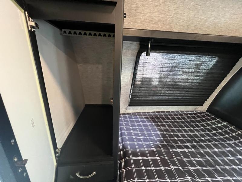 You can comfortably sleep eight in this travel trailer thanks to the double-size bunks, the U-shaped dinette, and the queen Murphy bed. You can cook breakfast for everyone on the pull-out camp kitchen before you head out for the day, and don't forget the fishing poles from the pass-through storage! This model includes a full bath with a tub/shower that will make bath time for the littles ones easier than ever. After everyone is cleaned up and dinner is put away, you may decide to make it a movie night with the LED TV!