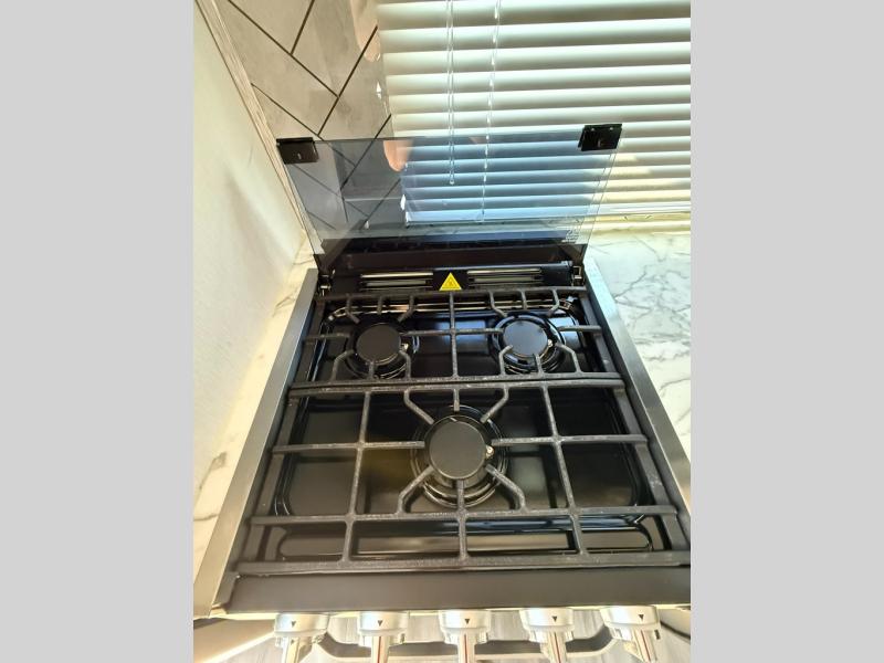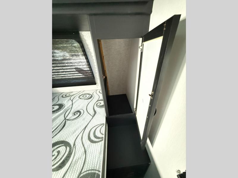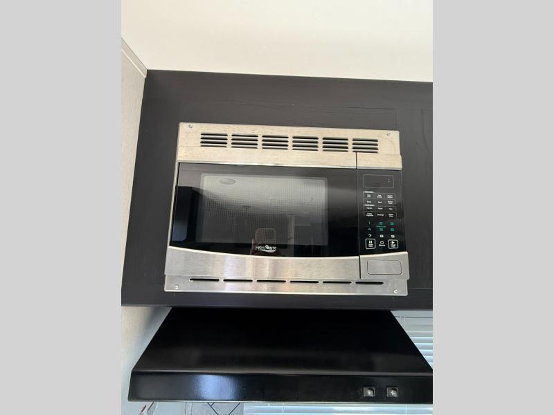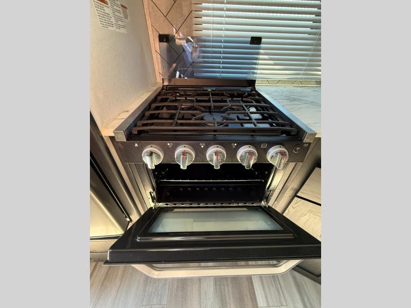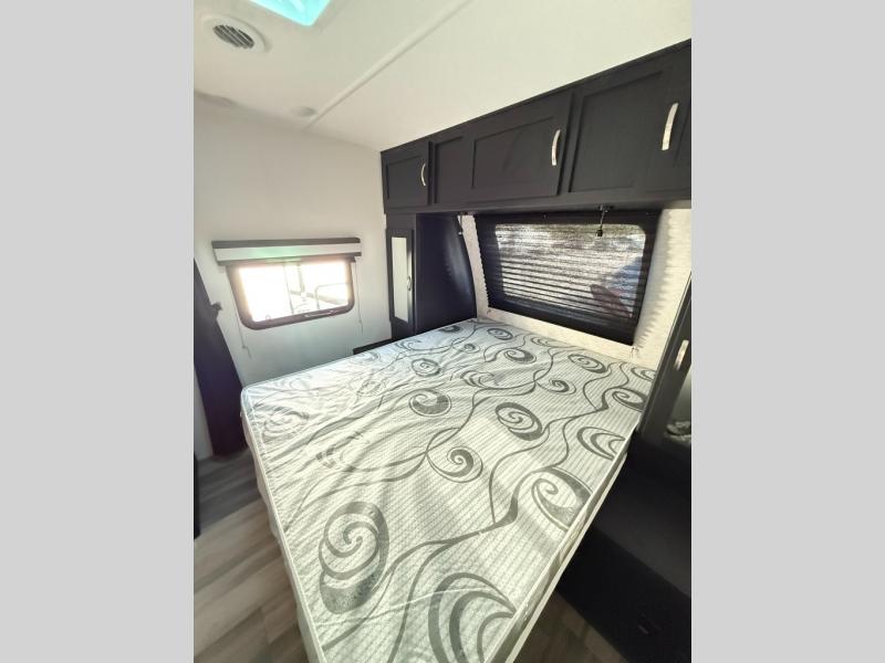 Check out this rear kitchen travel trailer that can sleep three to four each night. The front semi-private bedroom includes a privacy curtain and a queen bed with vaulted under-bed storage for your belongings. The sofa within the large slide out and the booth dinette will provide comfortable seating space, and there is an LED TV for those rainy camp days. This model also includes a three burner cooktop, a microwave oven, and an 8 cu. ft. double door refrigerator for your perishables. And don't forget about the 18' power awning with LED lights!