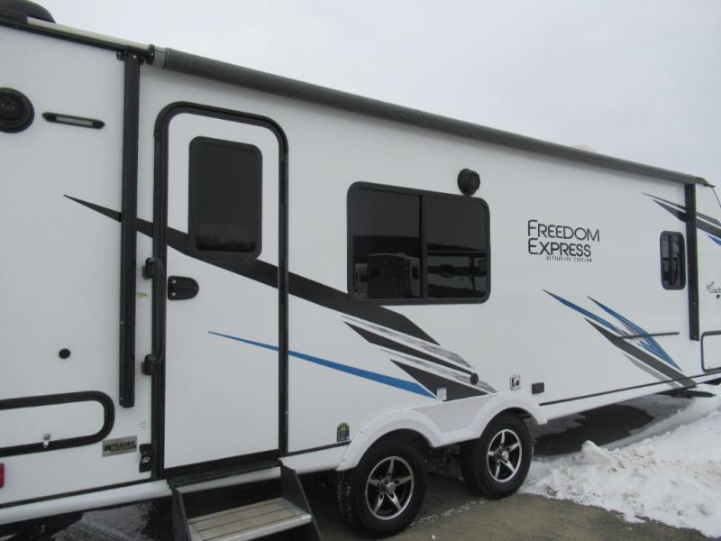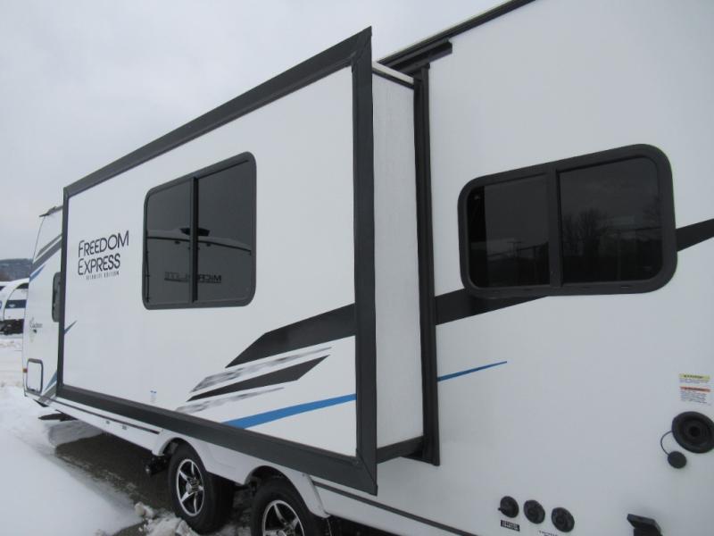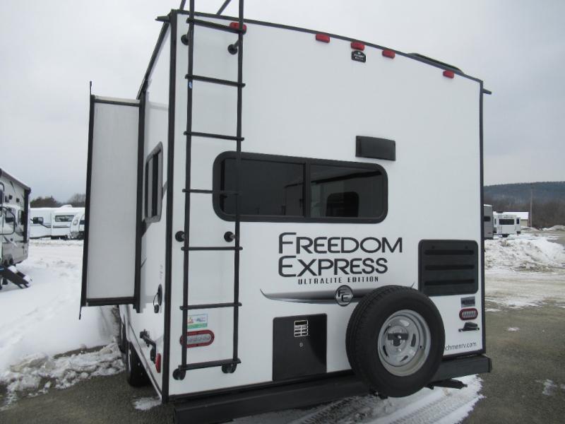With any Freedom Express Ultra Lite travel trailer by Coachmen you will appreciate quality construction materials, such as vacuum bonded walls with Azdel composite, a 3/4 gel coated fiberglass cap with an automotive glass windshield, and a heated enclosed underbelly. Each model also features Tufflex PVC roofing, front diamond plate, and E-Z Lube axles for smooth towing. You'll find Carefree flooring indoors, as well as night shades, a dual basin American stonecast sink, and hidden hinge cabinetry. The power tongue jack included with the Ultra Lite Express Pack will make set-up a breeze, and each model includes back-up camera prep and they are Freedom solar ready if you plan to go off-grid. Enjoy lightweight camping with a Freedom Express Ultra Lite travel trailer today!