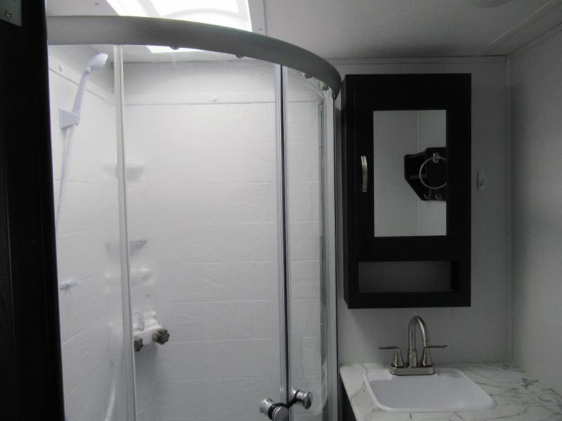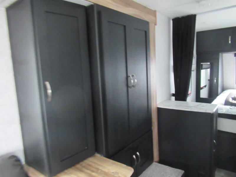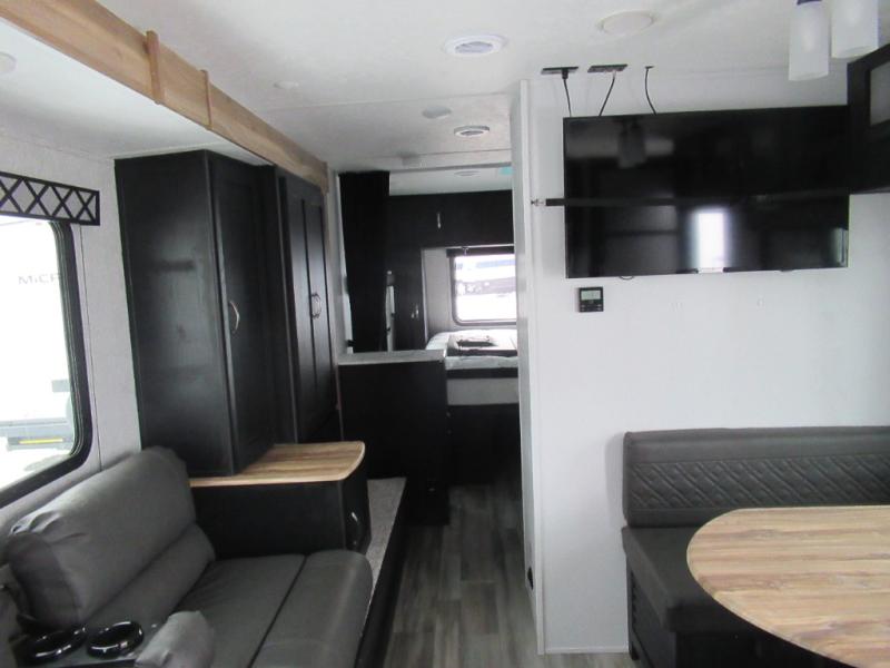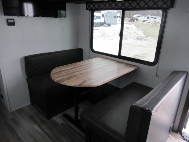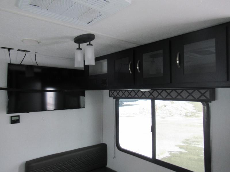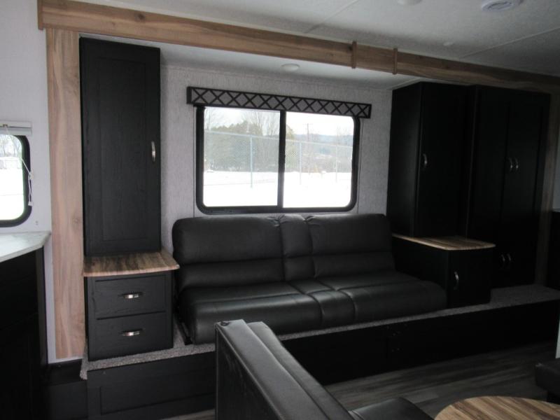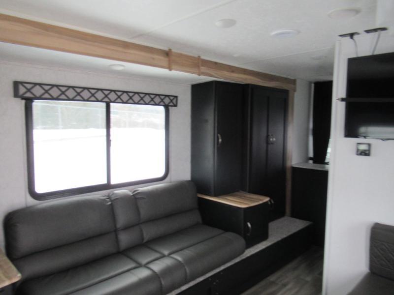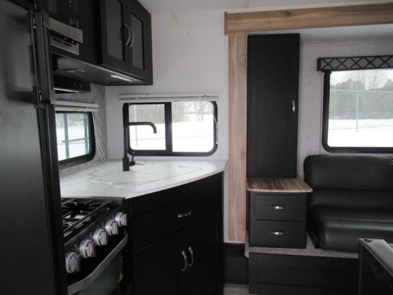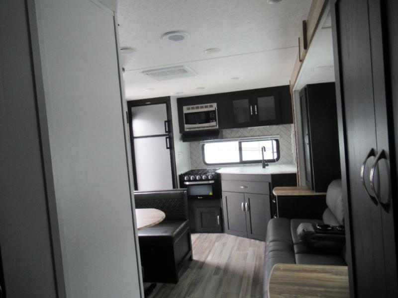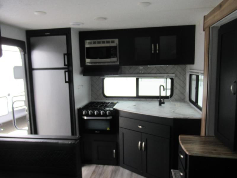 Check out this rear kitchen travel trailer that can sleep three to four each night. The front semi-private bedroom includes a privacy curtain and a queen bed with vaulted under-bed storage for your belongings. The sofa within the large slide out and the booth dinette will provide comfortable seating space, and there is an LED TV for those rainy camp days. This model also includes a three burner cooktop, a microwave oven, and an 8 cu. ft. double door refrigerator for your perishables. And don't forget about the 18' power awning with LED lights!