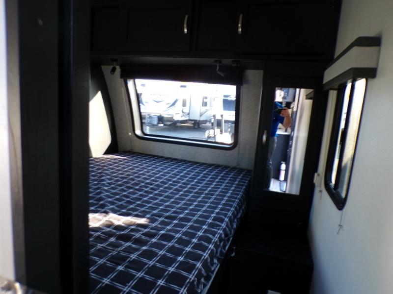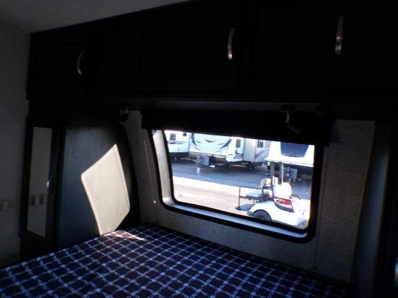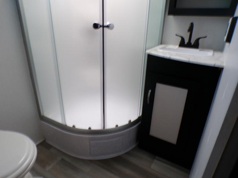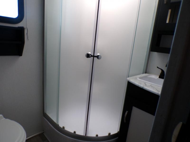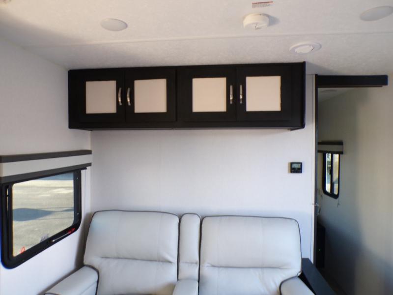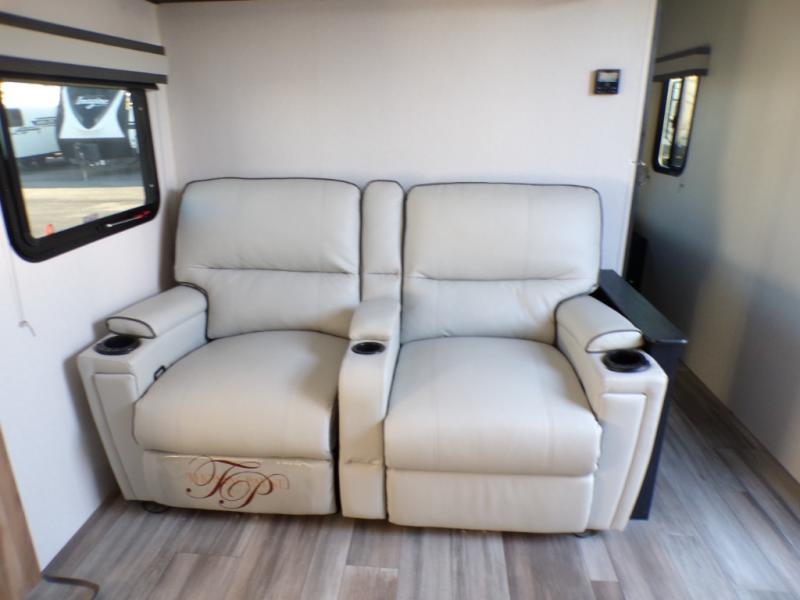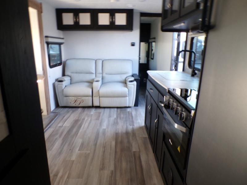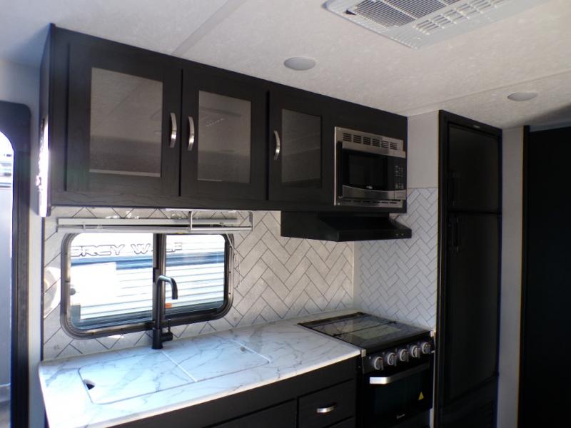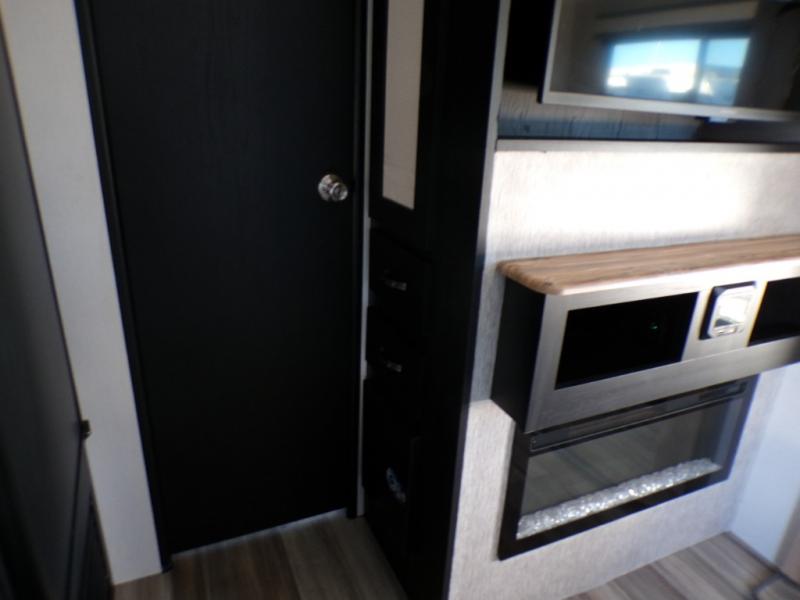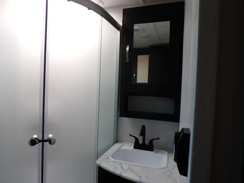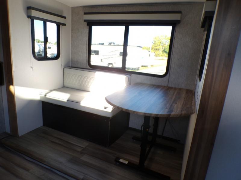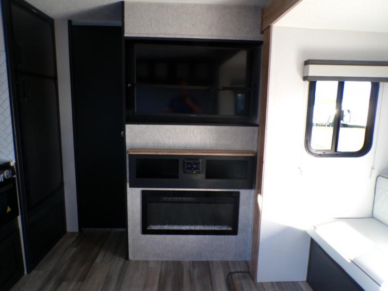 This travel trailer will feel just like home with its private bedroom and spacious full rear bath. You will appreciate the vaulted under-bed storage for extra blankets, shoes, and luggage, plus there are dual wardrobes on either side of the bed for your book and glasses. Get comfortable in the main living area on the sofa or at the booth dinette, or you can choose the optional theater seat or optional hide-a-bed sofa in place of the standard sofa. The chef of your group can prepare meals indoors or outdoors on the full camp kitchen, and check out the large 20' power awning with LED lights that will provide protection from the elements.
