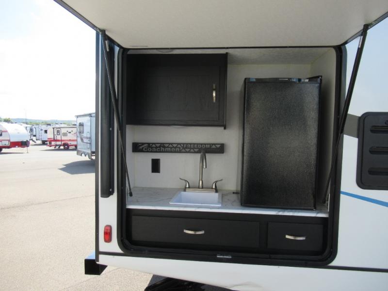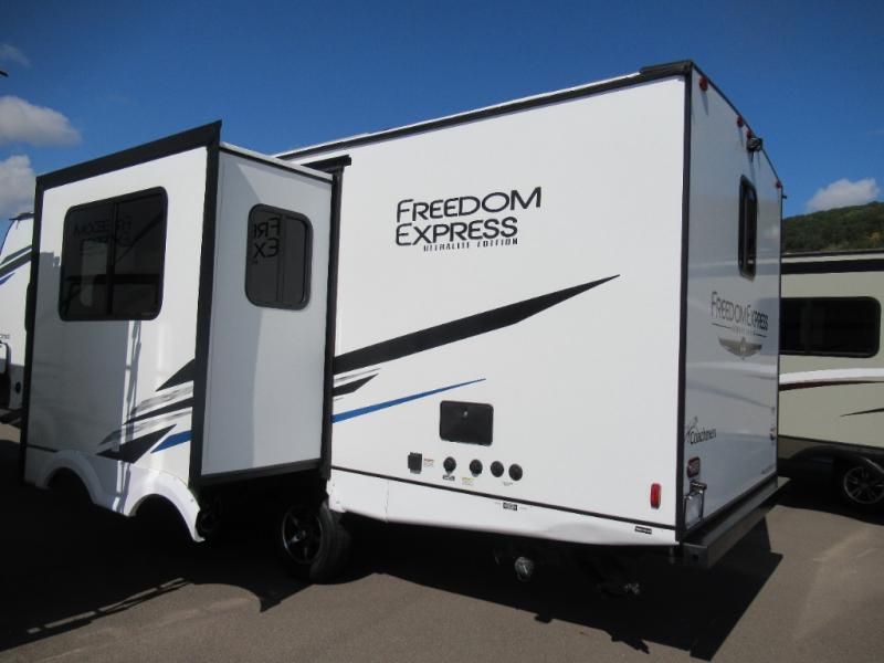 With any Freedom Express Ultra Lite travel trailer by Coachmen you will appreciate quality construction materials, such as vacuum bonded walls with Azdel composite, a 3/4 gel coated fiberglass cap with an automotive glass windshield, and a heated enclosed underbelly. Each model also features Tufflex PVC roofing, front diamond plate, and E-Z Lube axles for smooth towing. You'll find Carefree flooring indoors, as well as night shades, a dual basin American stonecast sink, and hidden hinge cabinetry. The power tongue jack included with the Ultra Lite Express Pack will make set-up a breeze, and each model includes back-up camera prep and they are Freedom solar ready if you plan to go off-grid. Enjoy lightweight camping with a Freedom Express Ultra Lite travel trailer today!