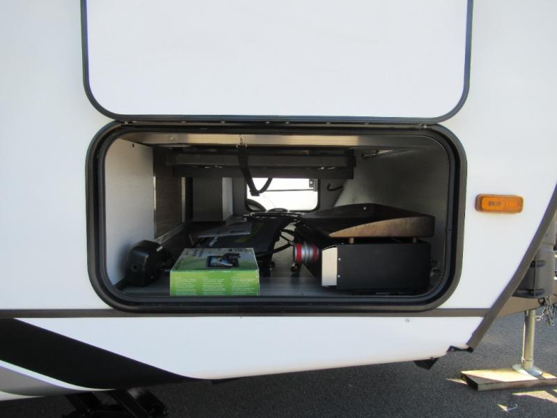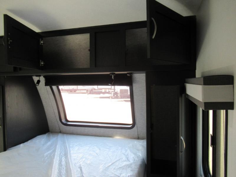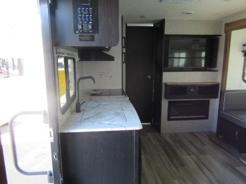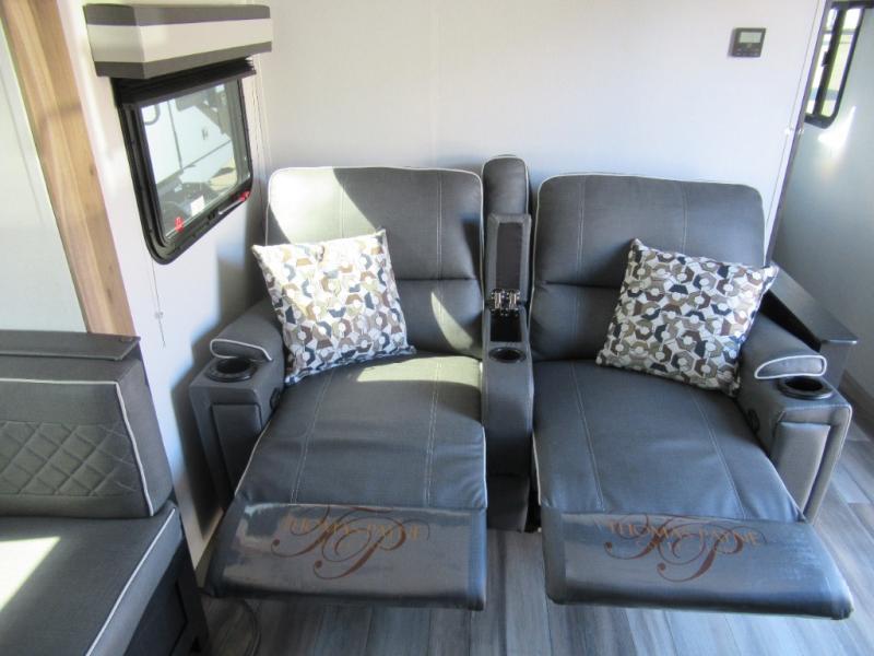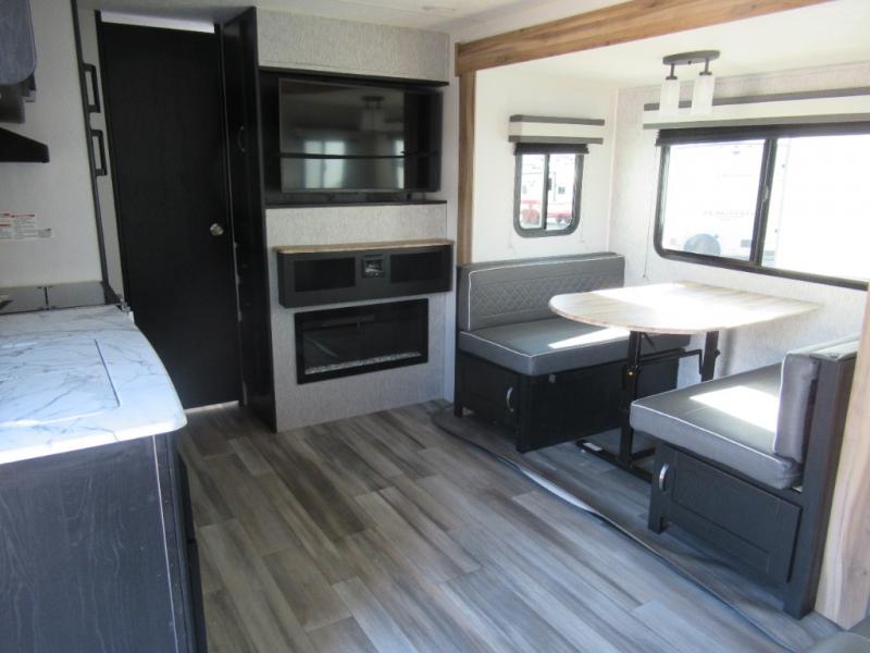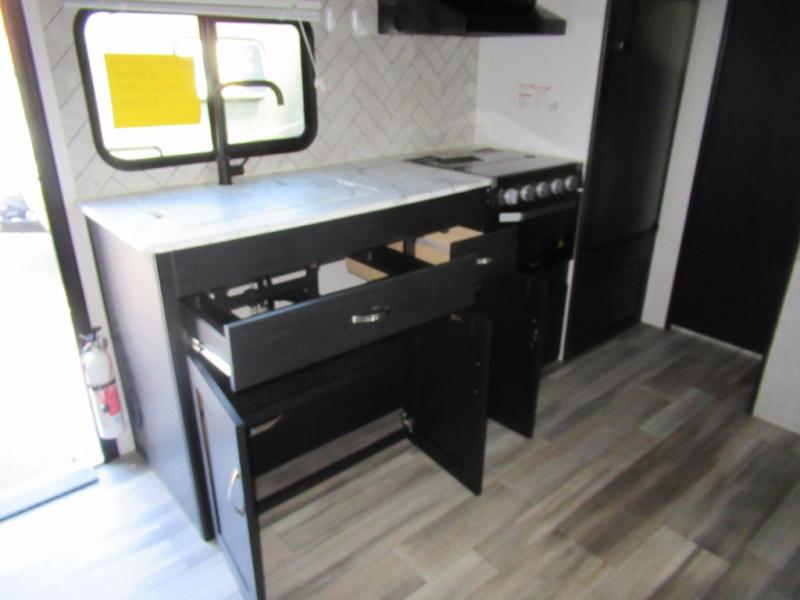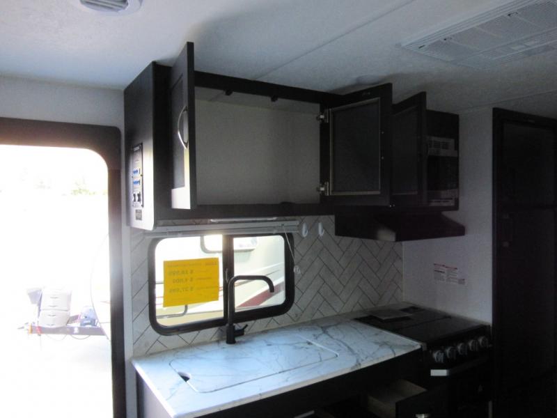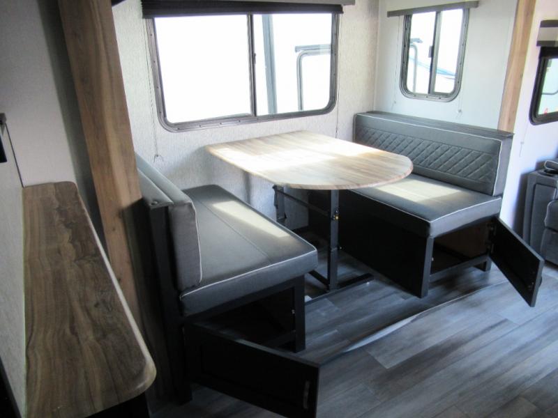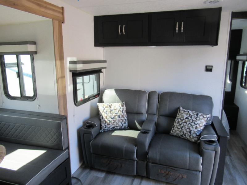 This travel trailer will feel just like home with its private bedroom and spacious full rear bath. You will appreciate the vaulted under-bed storage for extra blankets, shoes, and luggage, plus there are dual wardrobes on either side of the bed for your book and glasses. Get comfortable in the main living area on the sofa or at the booth dinette, or you can choose the optional theater seat or optional hide-a-bed sofa in place of the standard sofa. The chef of your group can prepare meals indoors or outdoors on the full camp kitchen, and check out the large 20' power awning with LED lights that will provide protection from the elements.