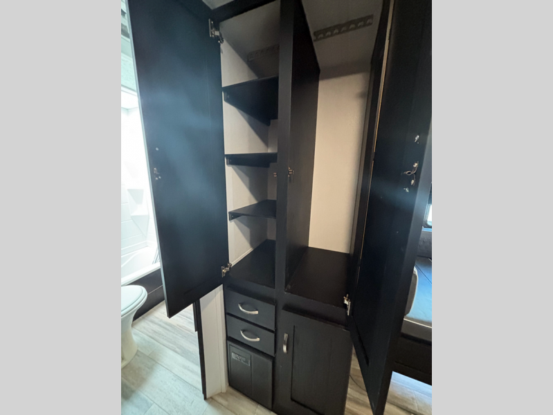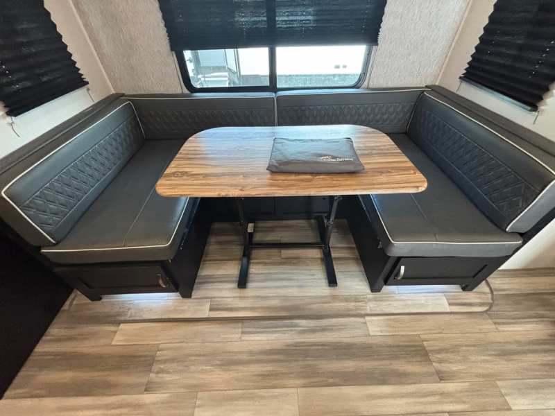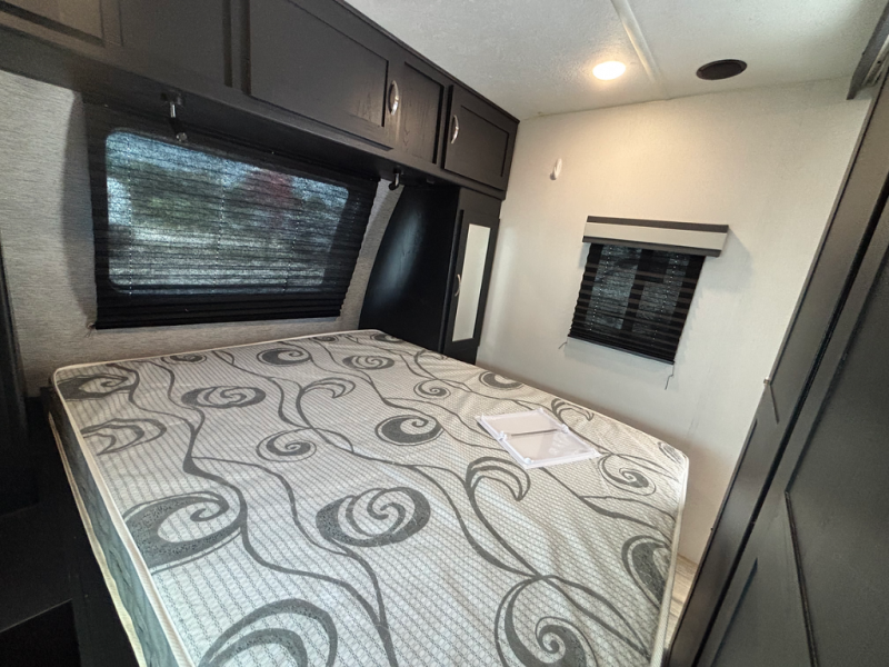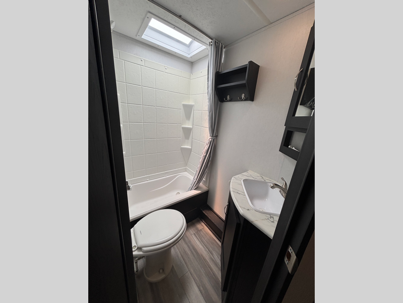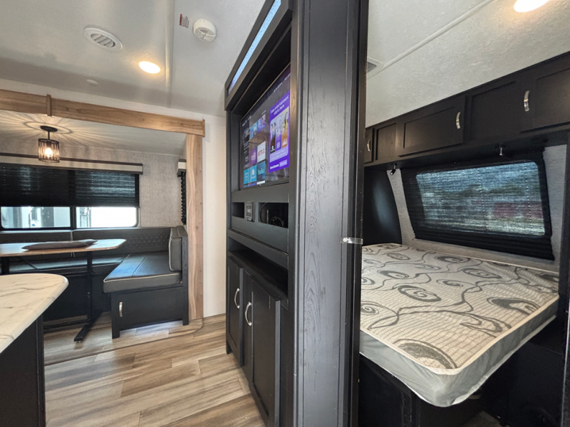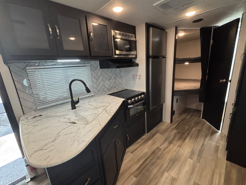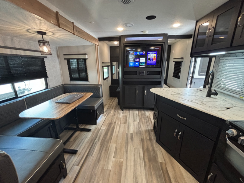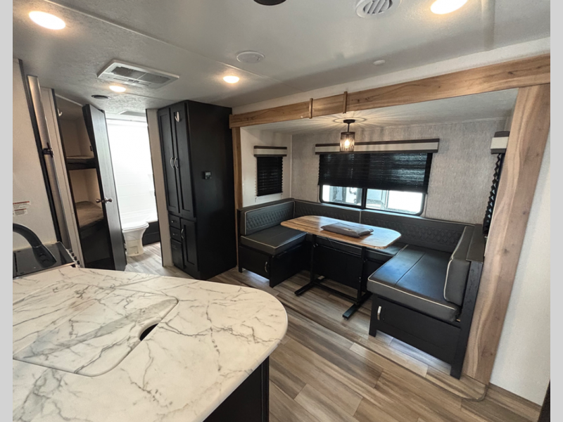 Double-size bunks make this travel trailer ready for fun! You will appreciate the front private bedroom with its queen bed and dual wardrobes, and any other guests can sleep on the U-shaped dinette. The chef of your group can cook indoors on the three burner cooktop, or outdoors on the pull-out camp kitchen. This model also includes a full bath with a tub/shower that will make bath time for the littles easier than ever, and there is plenty of storage space throughout this model for all your belongings.