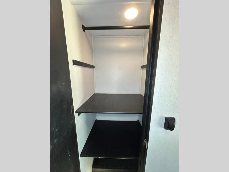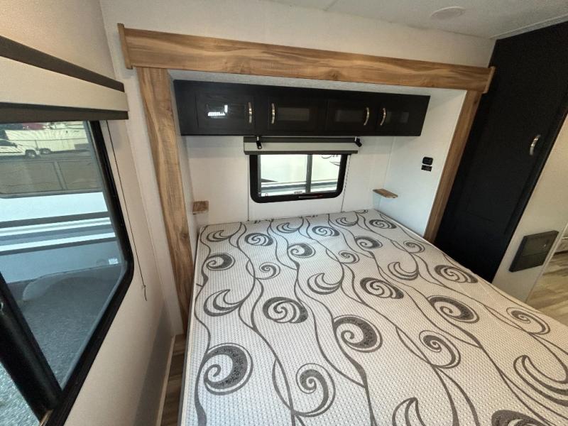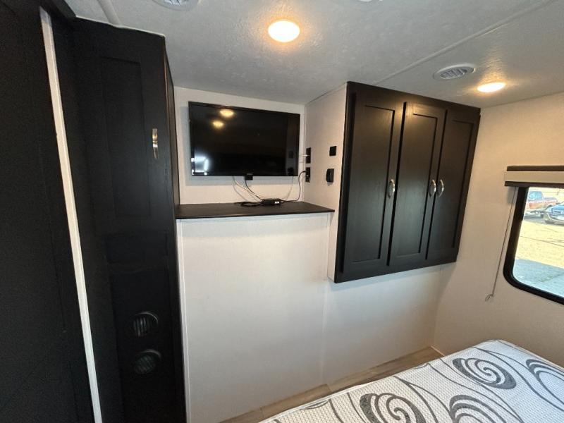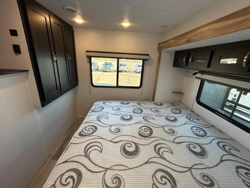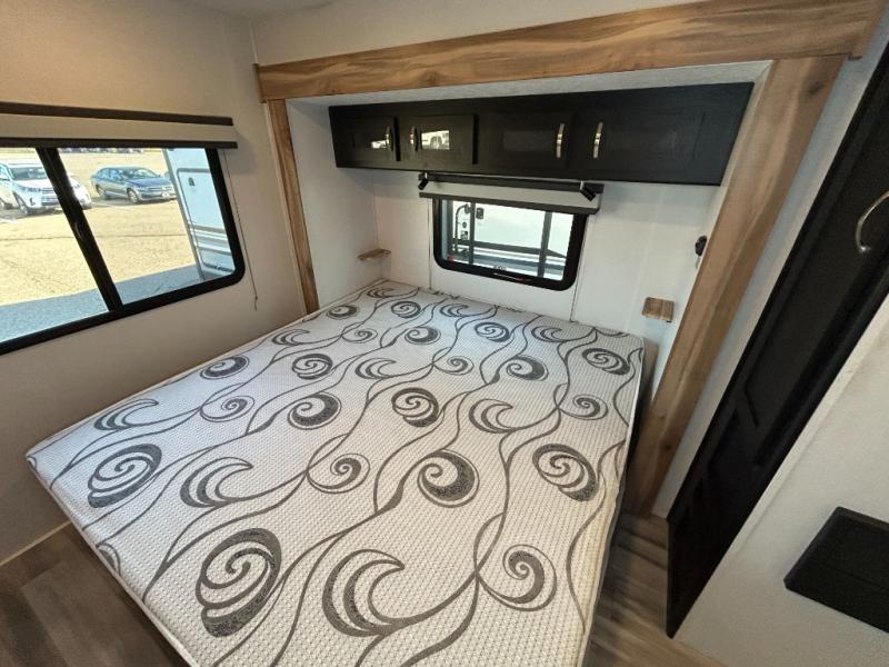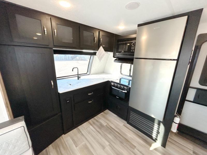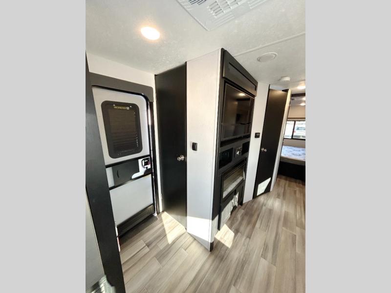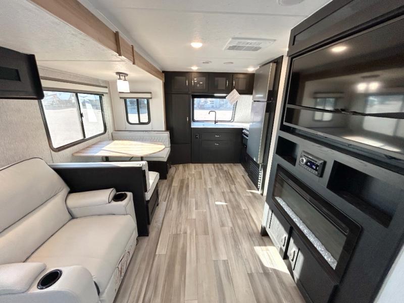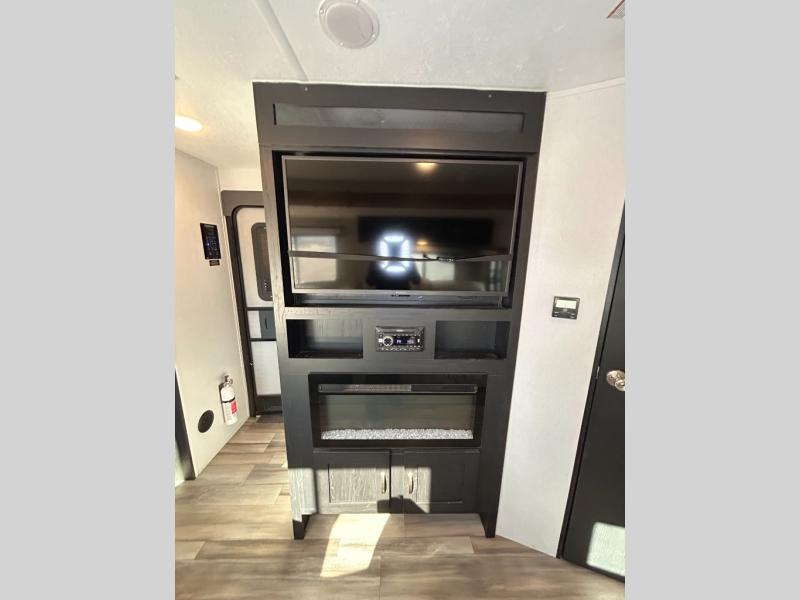 Comfort comes easy in this front kitchen travel trailer for four! You will love the rear master bedroom with its king bed slide out, spacious wardrobe, and a private entrance into the dual entry bath. There is a sofa that sits directly across from the fireplace and entertainment center, or you can choose the optional theater seat or optional hide-a-bed sofa in place of the standard sofa. The front kitchen features tons of counter space, an 8 cu. ft. double door refrigerator, plus a large pantry for dry good and snacks. There is also a pantry/closet just as you enter the trailer that will be perfect for shoes and jackets!