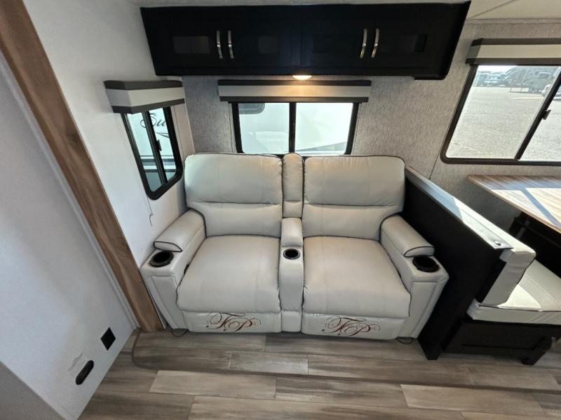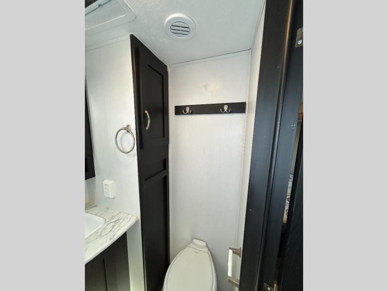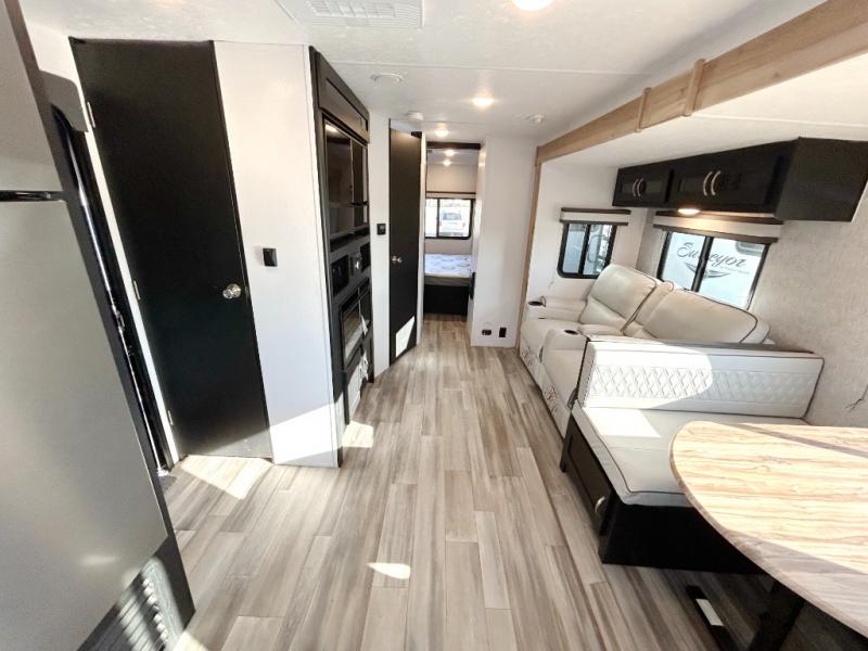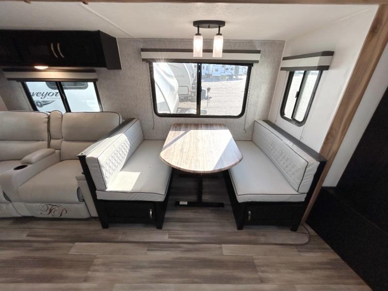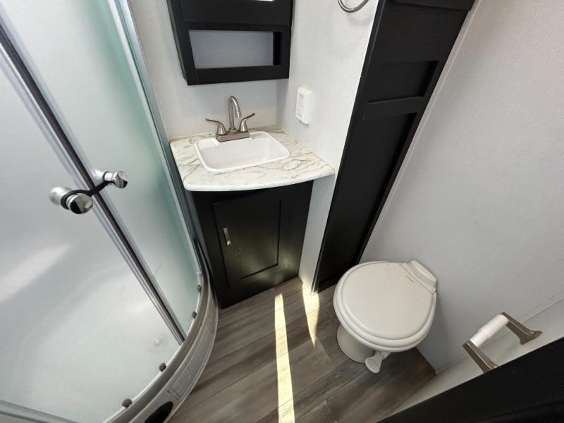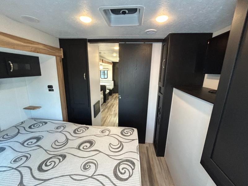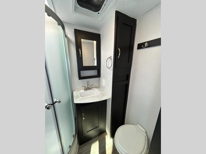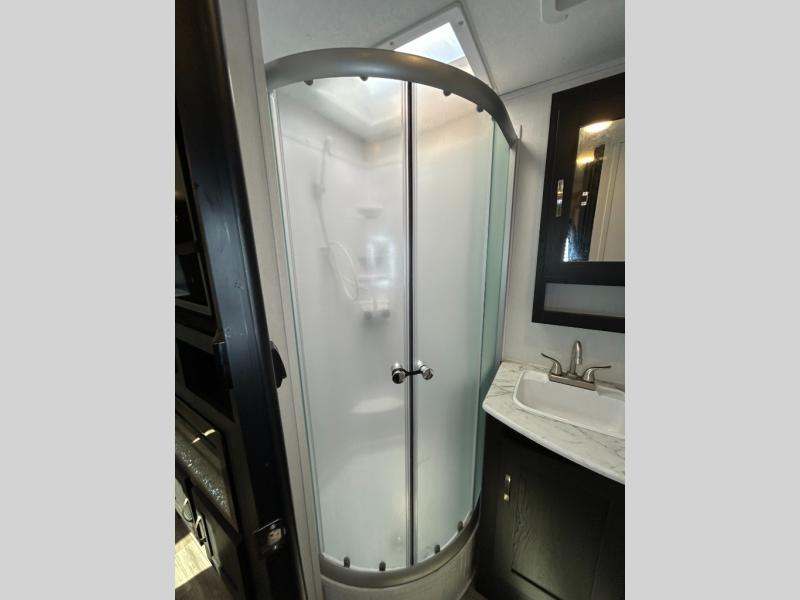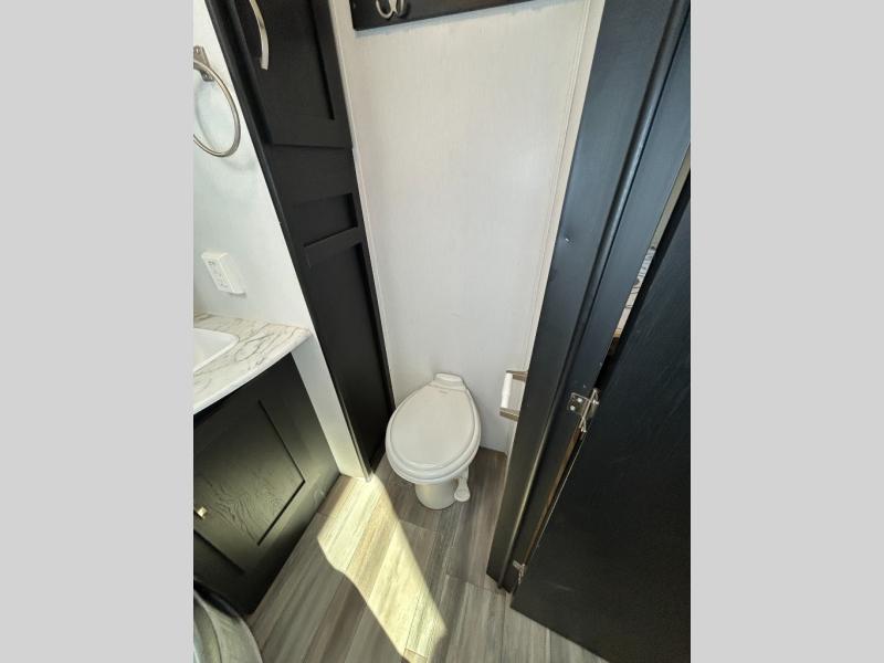 Comfort comes easy in this front kitchen travel trailer for four! You will love the rear master bedroom with its king bed slide out, spacious wardrobe, and a private entrance into the dual entry bath. There is a sofa that sits directly across from the fireplace and entertainment center, or you can choose the optional theater seat or optional hide-a-bed sofa in place of the standard sofa. The front kitchen features tons of counter space, an 8 cu. ft. double door refrigerator, plus a large pantry for dry good and snacks. There is also a pantry/closet just as you enter the trailer that will be perfect for shoes and jackets!