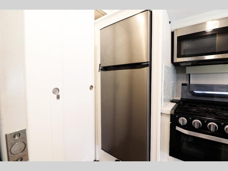 Solid surface kitchen countertops & farmhouse sink, tile backsplash, stainless 3-burner range, OTR microwave, and stainless residential refrigerator—designed for gourmet RV cooking.