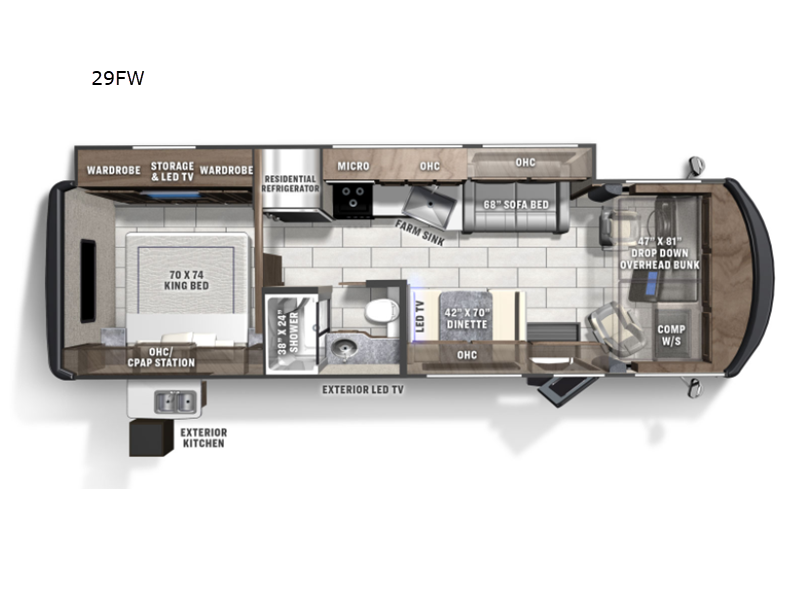 Safety & convenience: backup camera, LP leak alarm, smoke & carbon monoxide detectors, fire extinguisher.