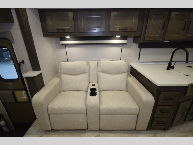 Thanks to the full-wall slide, the interior opens up to reveal an expansive living area where you and your crew can relax, dine, or entertain. Enjoy a movie night on the 50" LCD TV, kick back in the theater seating, or lounge on the sofa bed—perfect for extra guests. When the sun’s out, take the fun outdoors and catch the game on the exterior LED TV under the 20' power awning.