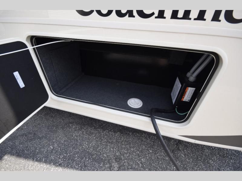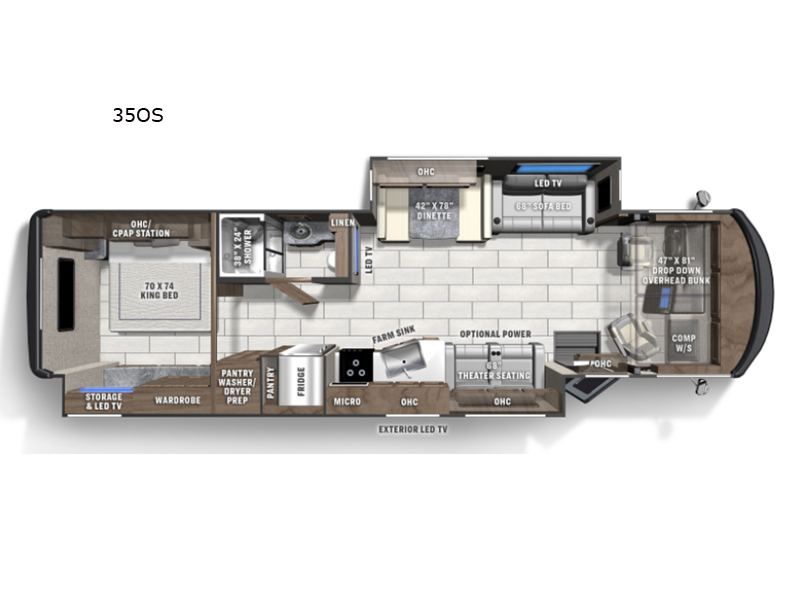 At the rear, you’ll find a private master retreat complete with a king-size bed, a spacious wardrobe, and a 32" LCD TV. The full bath offers a large glass-door shower with a skylight, extended counter space, and upscale finishes for a true residential feel. And with a built-in CPAP station, restful sleep is always within reach.