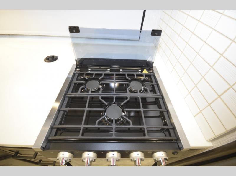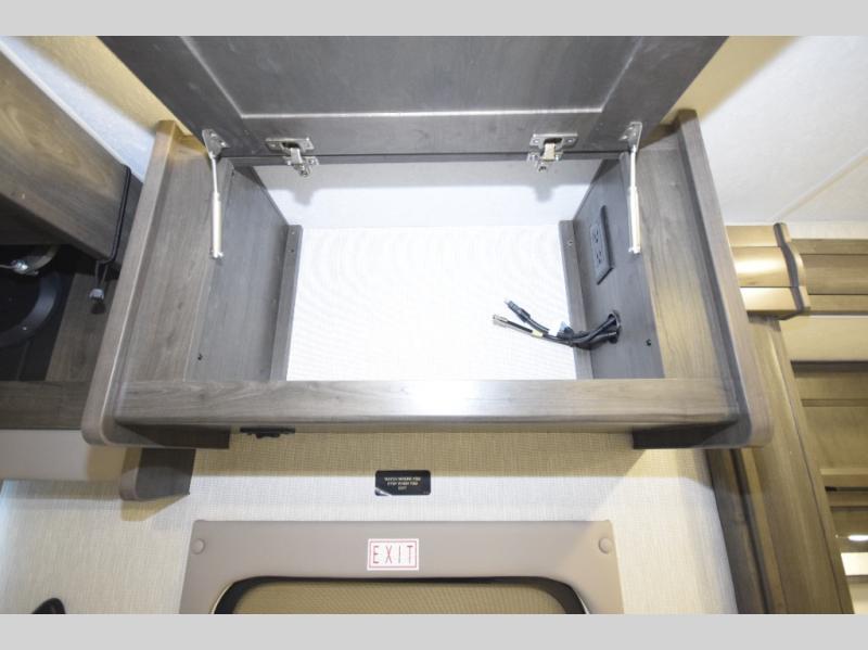 Step inside to find a beautifully designed interior, featuring hardwood cabinet doors, premium linoleum flooring, a sleek kitchen tile backsplash, and solar privacy shades throughout. The 10" touchscreen radio with Bluetooth lets you stay connected and entertained from the driver's seat, while the swivel captain’s chairs and passenger workstation make the cab area functional and fun.