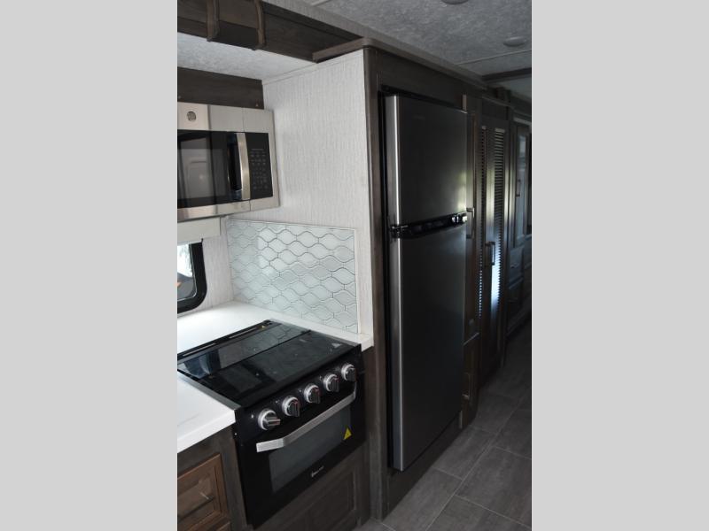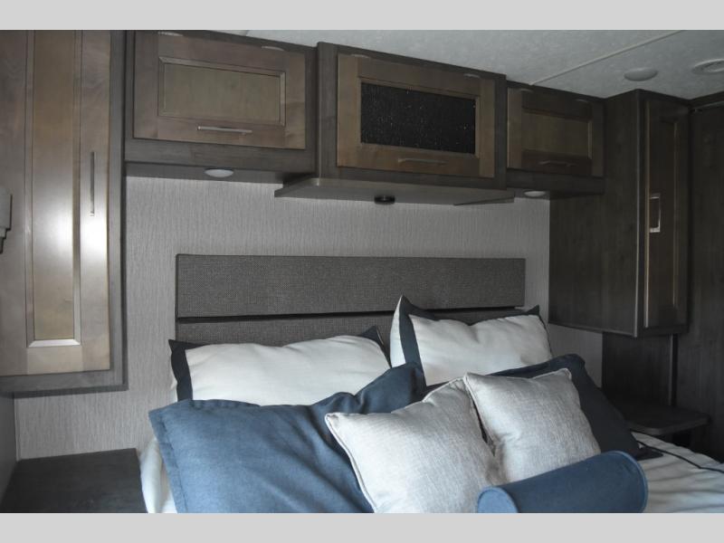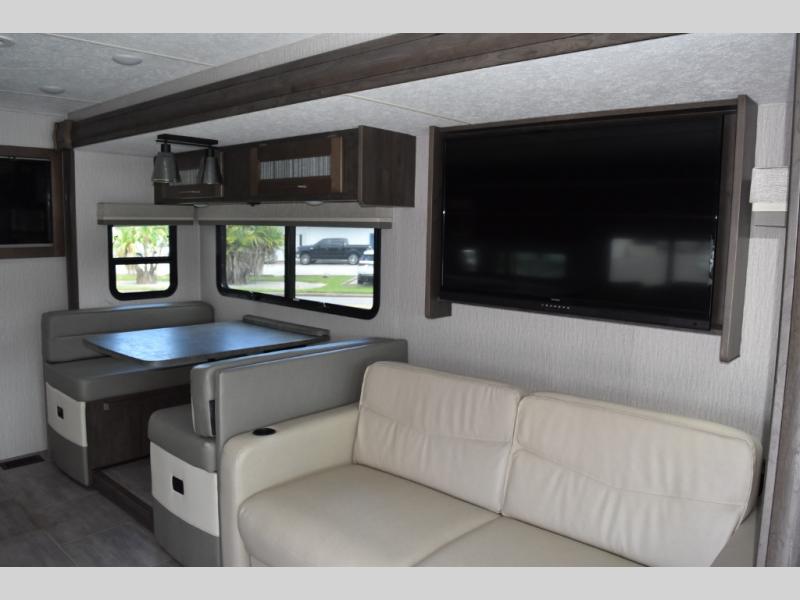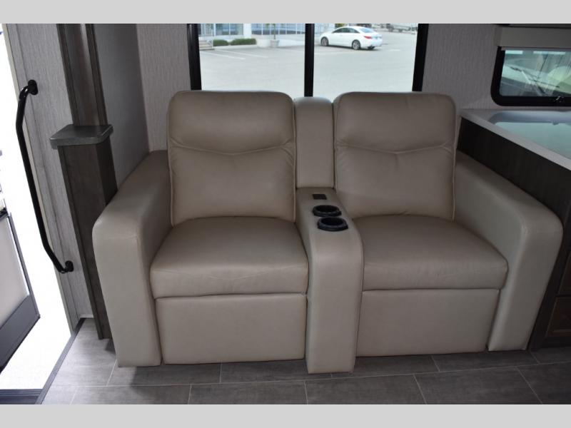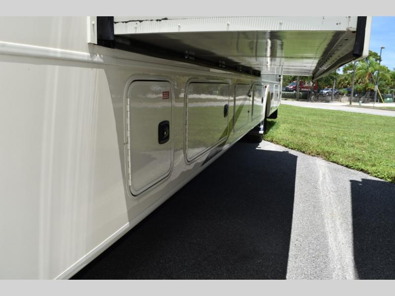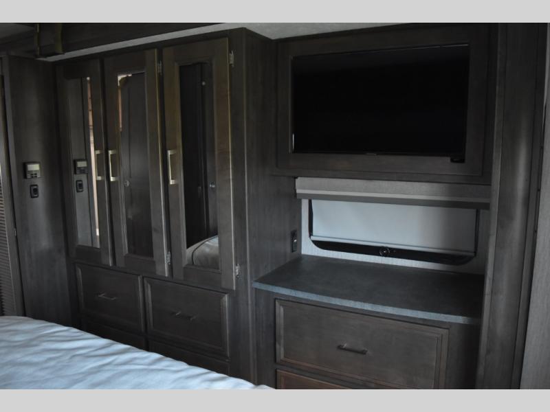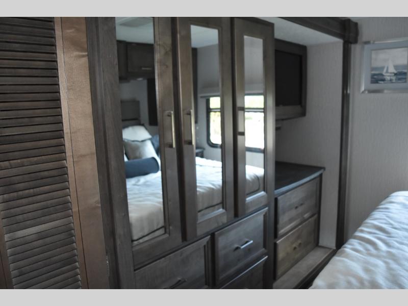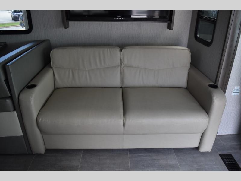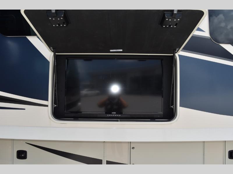 Your family will love this spacious coach for trips across the country or your local state park. The swivel captain's seats provide more seating, along with the sofa bed, theater seating and booth dinette. There is a 50" LCD TV for rainy day movies and an exterior LED TV under the 20' power awning if the weather is cooperating. The full bath includes a glass shower door, plenty of counter space, and a shower skylight for added light, and the rear bedroom will be your oasis away from it all. Here, you'll find a king bed, a wardrobe for your clothes, plus a 32" LCD TV.