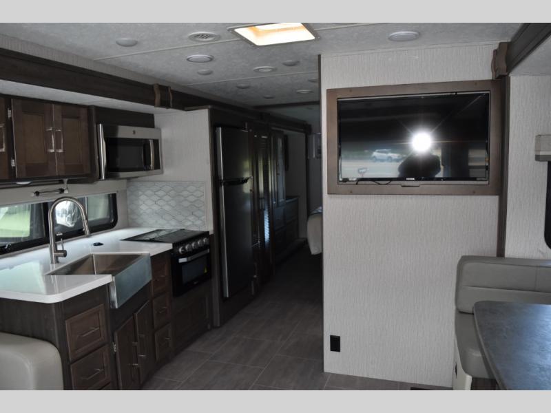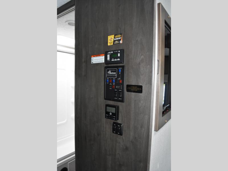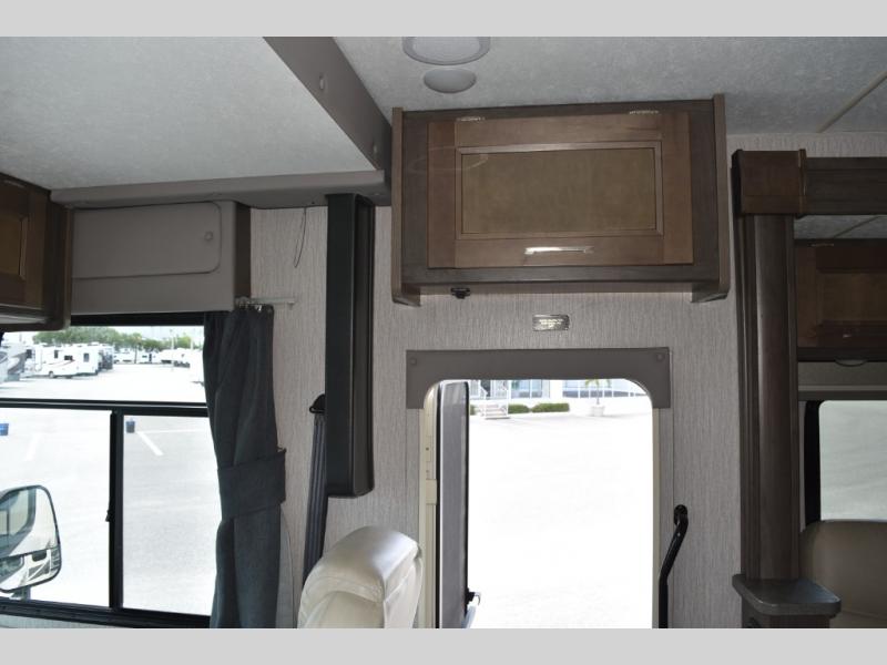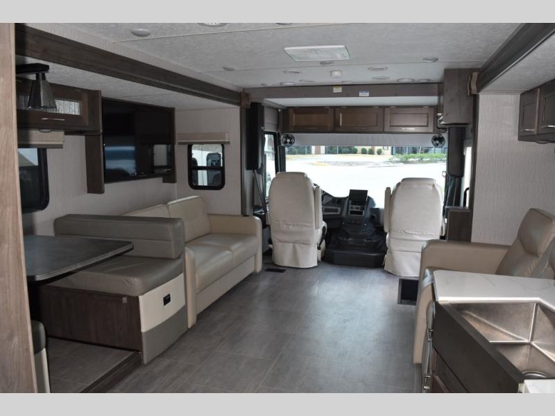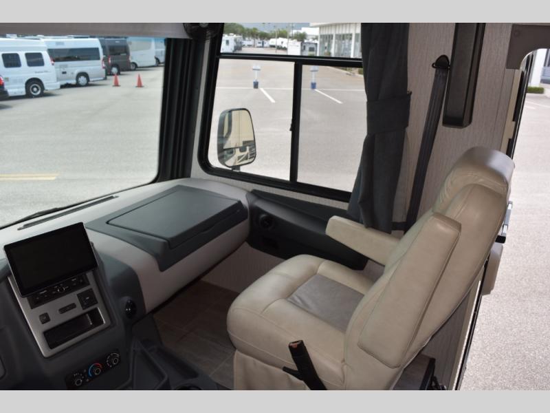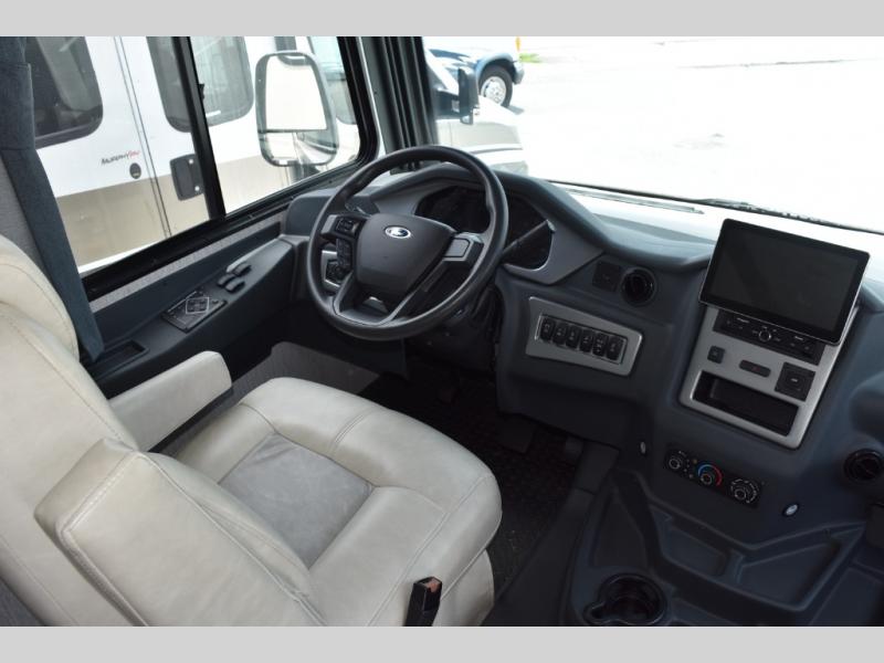 Each Mirada Class A gas motorhome by Coachmen is constructed with a crowned, laminated fiberglass roof with Azdel Superlite composite for added durability, along with high gloss "Oyster" gelcoat sidewalls. There is a 7.3L V8 engine on a Ford F53 chassis for power you can feel, and a 10" touch screen radio with AM/FM radio with Bluetooth capability. The 5.5 kW gas generator, dual coach batteries, and 100W solar panel with a controller will meet all your power needs, and the automatic leveling jacks make setting up camp a breeze. Head inside to find premium linoleum throughout, hardwood cabinet doors, kitchen tile backsplash, and solar privacy shades throughout to name a few comforts. The open road is yours for the taking in a Mirada Class A gas motorhome!