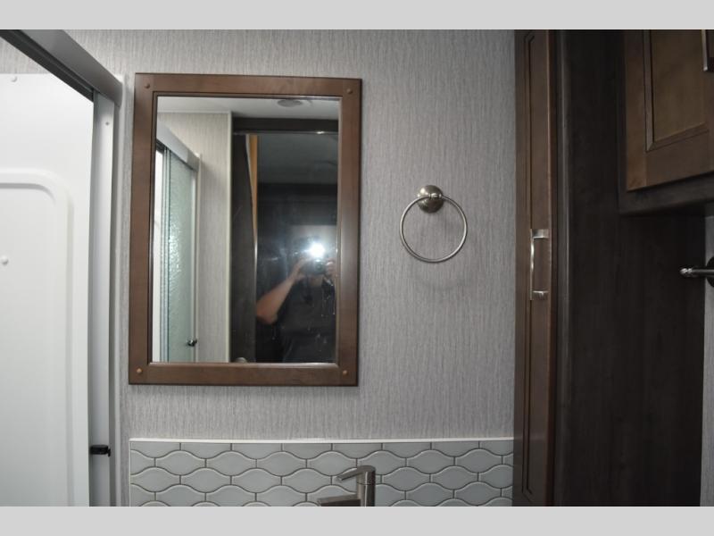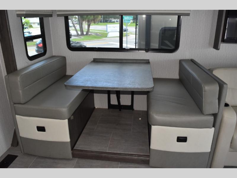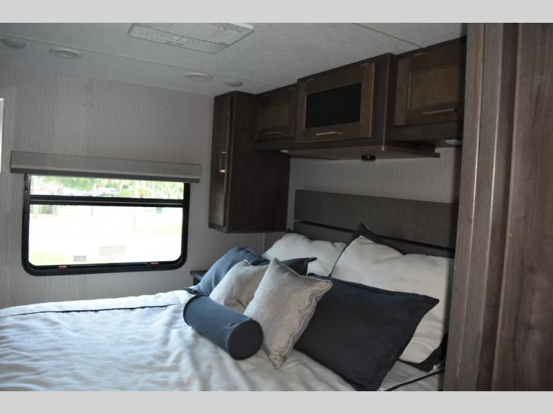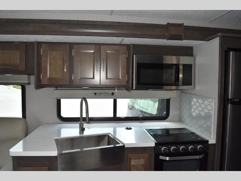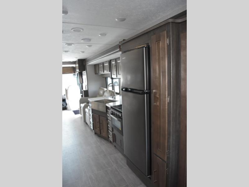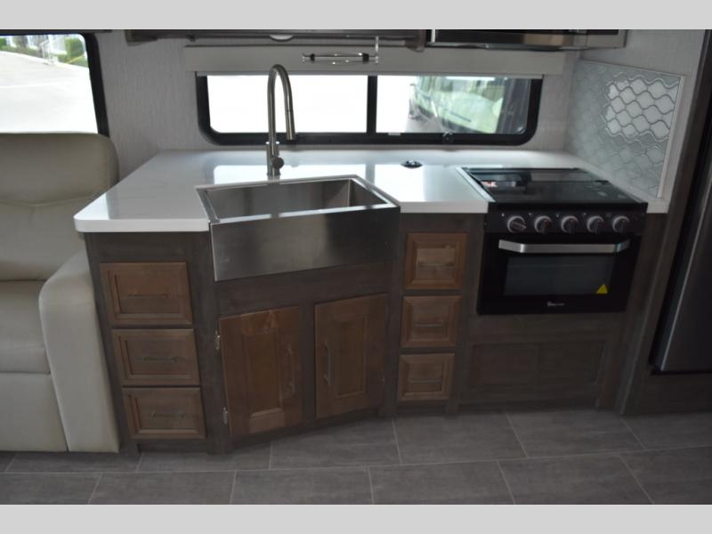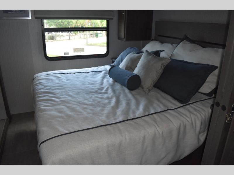 Each Mirada Class A gas motorhome by Coachmen is constructed with a crowned, laminated fiberglass roof with Azdel Superlite composite for added durability, along with high gloss "Oyster" gelcoat sidewalls. There is a 7.3L V8 engine on a Ford F53 chassis for power you can feel, and a 10" touch screen radio with AM/FM radio with Bluetooth capability. The 5.5 kW gas generator, dual coach batteries, and 100W solar panel with a controller will meet all your power needs, and the automatic leveling jacks make setting up camp a breeze. Head inside to find premium linoleum throughout, hardwood cabinet doors, kitchen tile backsplash, and solar privacy shades throughout to name a few comforts. The open road is yours for the taking in a Mirada Class A gas motorhome!