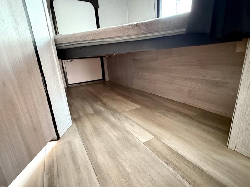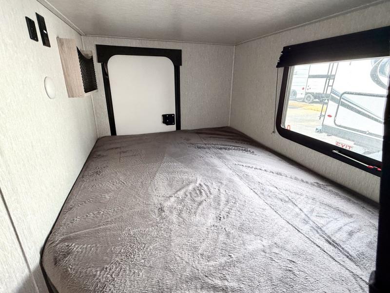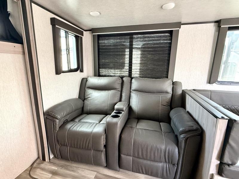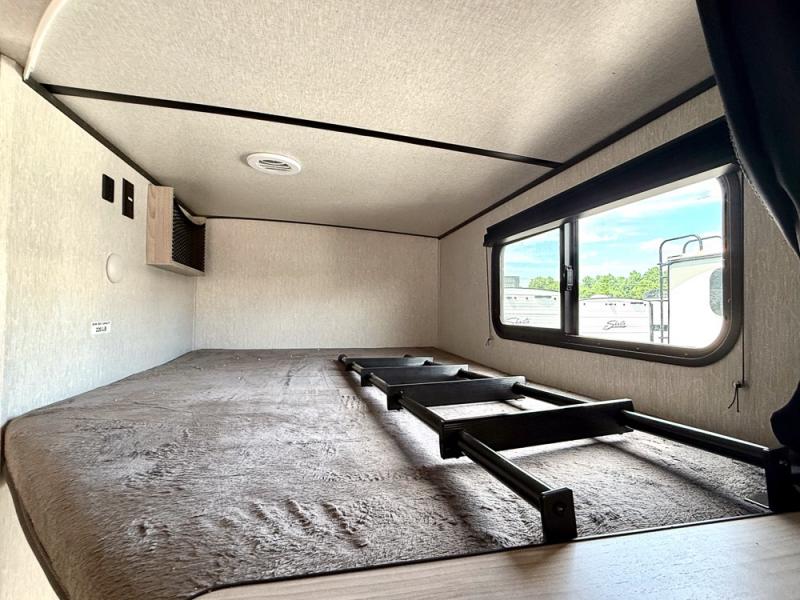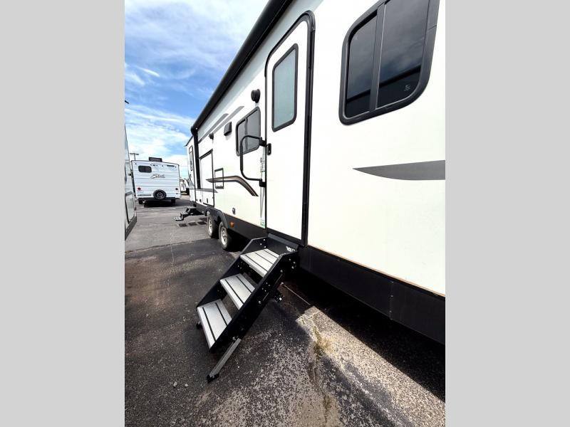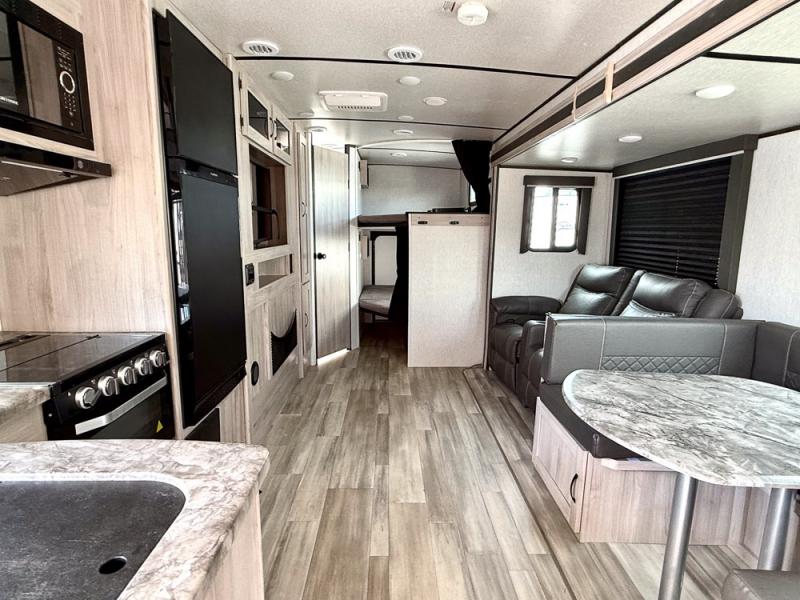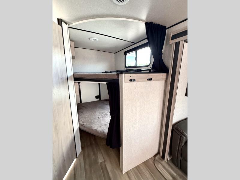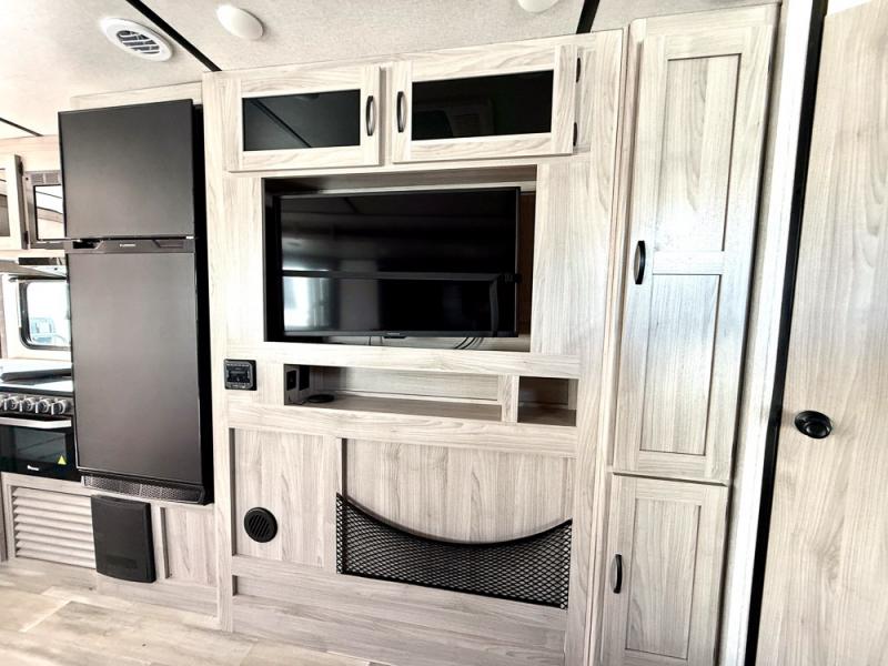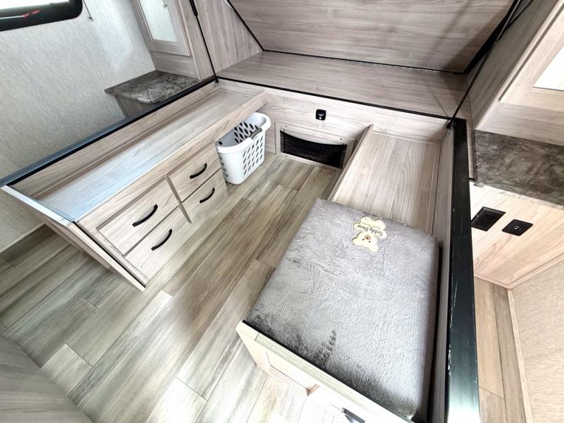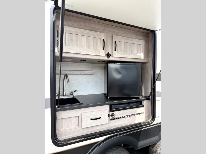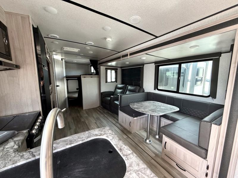 This is a popular bunk trailer for a larger family thanks to having the convenience of dual entry doors allowing access to the main living and kitchen area and near the front bedroom, and into the full bathroom for a quick in and out when playing outside. The bathroom also includes a hamper. The Stor-More cargo door allows you to place items from the exterior to the interior under the lower flip bunk for safe travels to your destinations and back home. The kids will surely love the convenience centers when playing or sleeping in a bunk. There is a sofa and U-shaped slide including a pet center for relaxing and feeding your pet. The kitchen includes full amenities plus a pantry to store lots of goodies for everyone. Along the exterior, the outside camp kitchen will come in handy when you have everyone at the campsite for dinner and the power awning offers some protection from the elements.