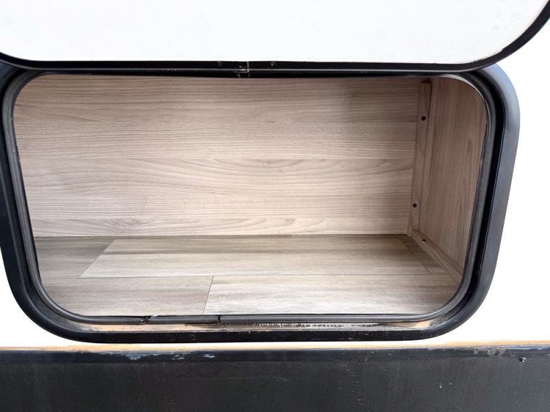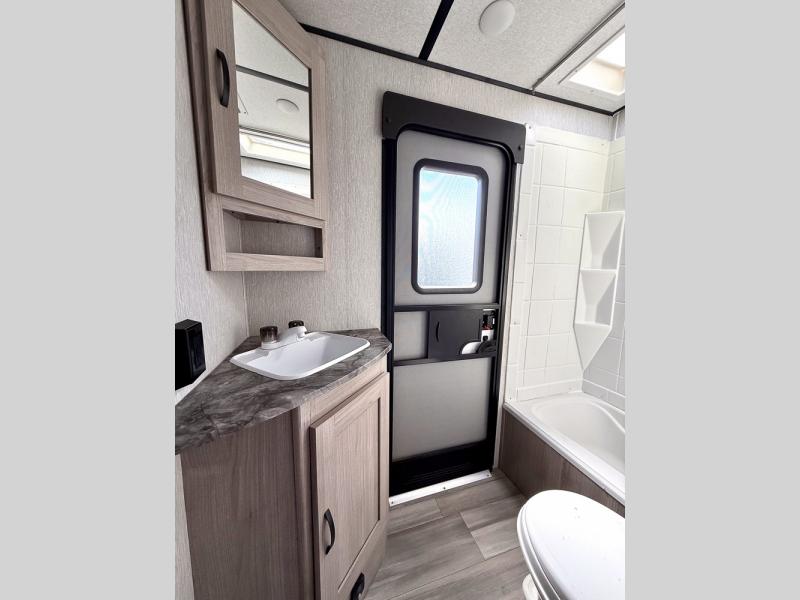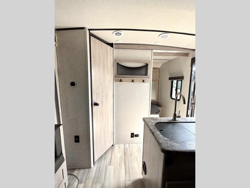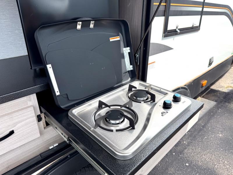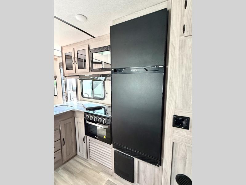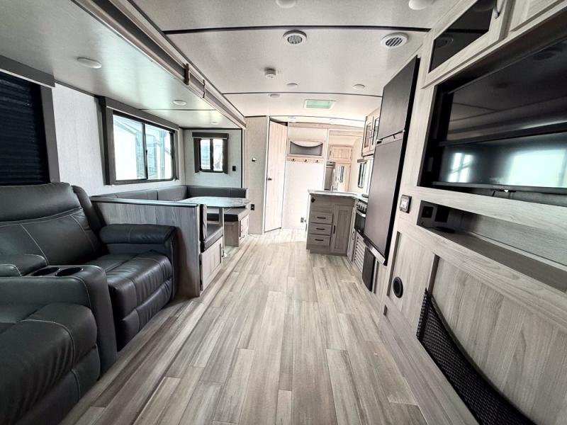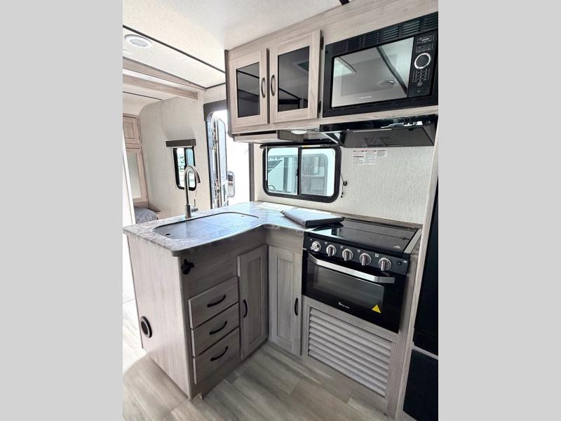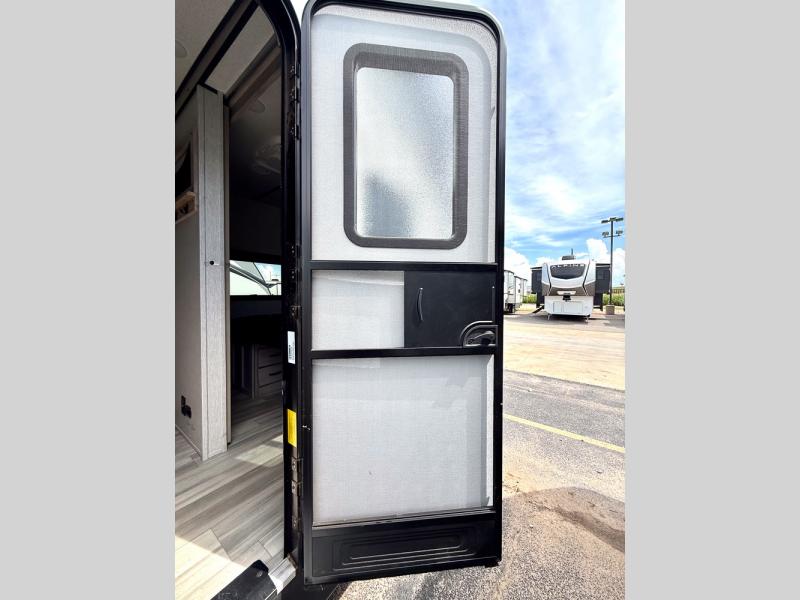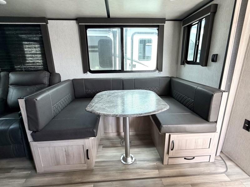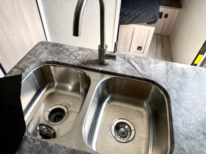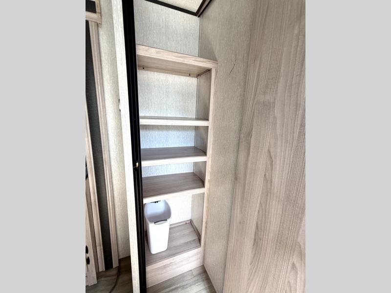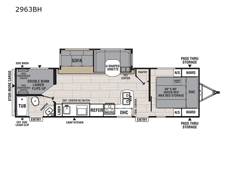 This is a popular bunk trailer for a larger family thanks to having the convenience of dual entry doors allowing access to the main living and kitchen area and near the front bedroom, and into the full bathroom for a quick in and out when playing outside. The bathroom also includes a hamper. The Stor-More cargo door allows you to place items from the exterior to the interior under the lower flip bunk for safe travels to your destinations and back home. The kids will surely love the convenience centers when playing or sleeping in a bunk. There is a sofa and U-shaped slide including a pet center for relaxing and feeding your pet. The kitchen includes full amenities plus a pantry to store lots of goodies for everyone. Along the exterior, the outside camp kitchen will come in handy when you have everyone at the campsite for dinner and the power awning offers some protection from the elements.