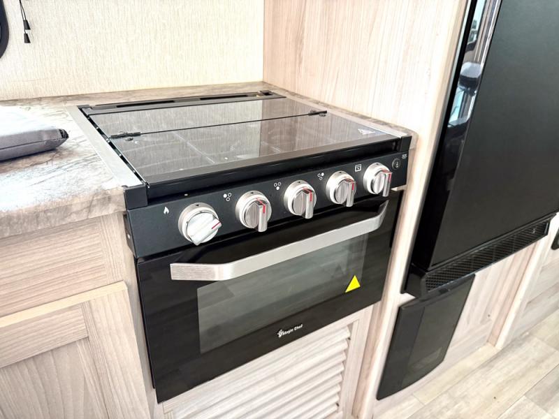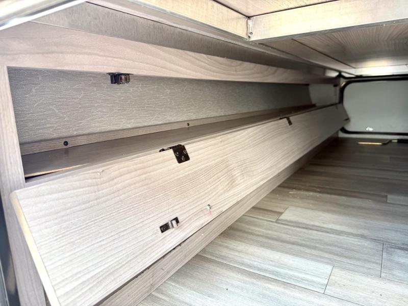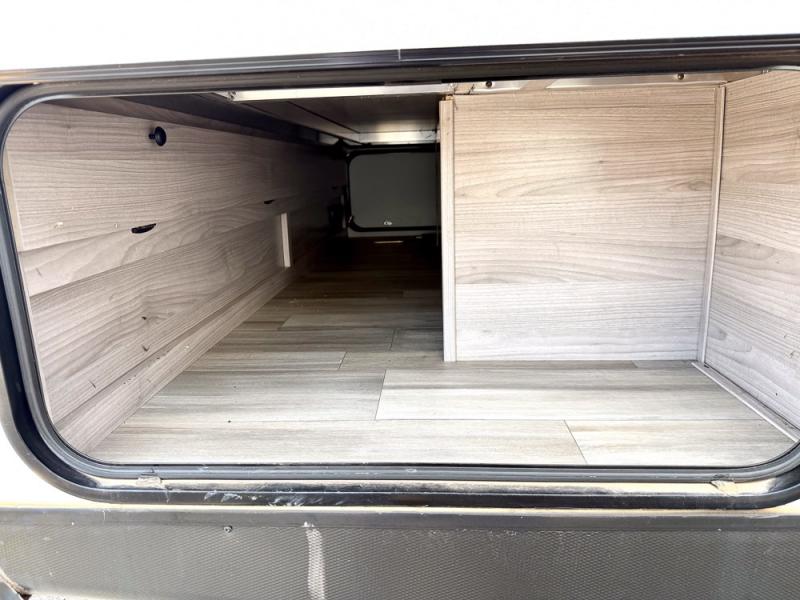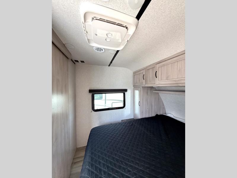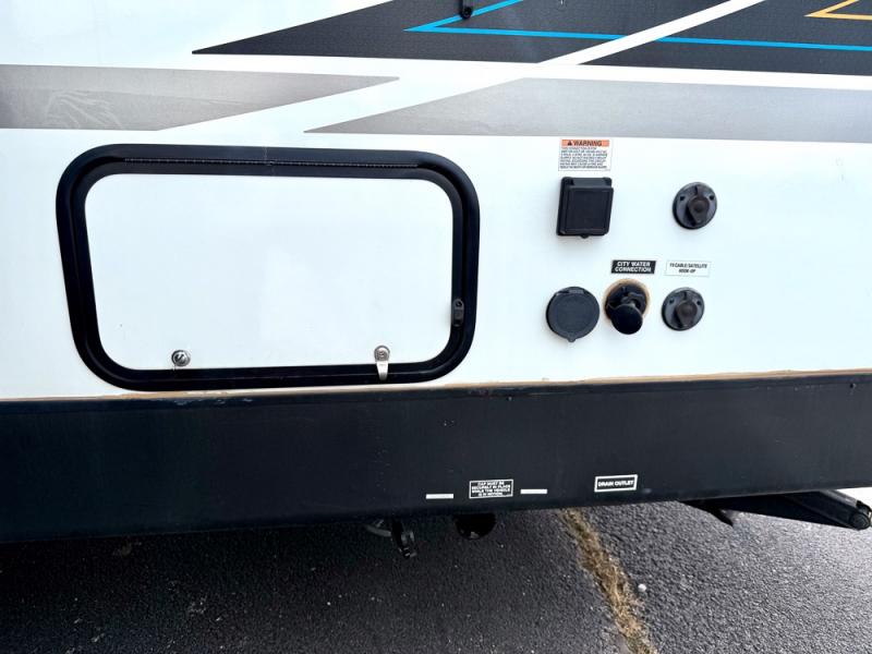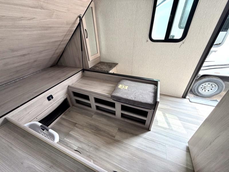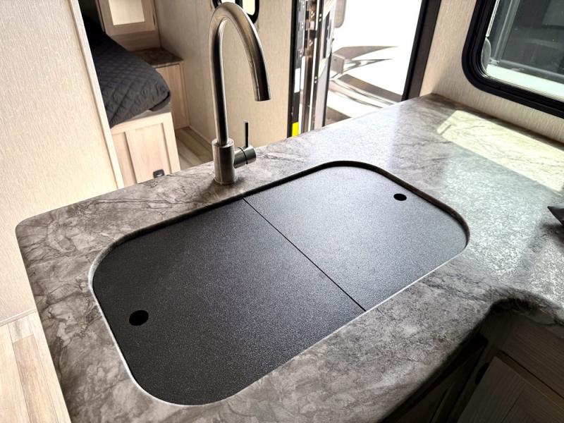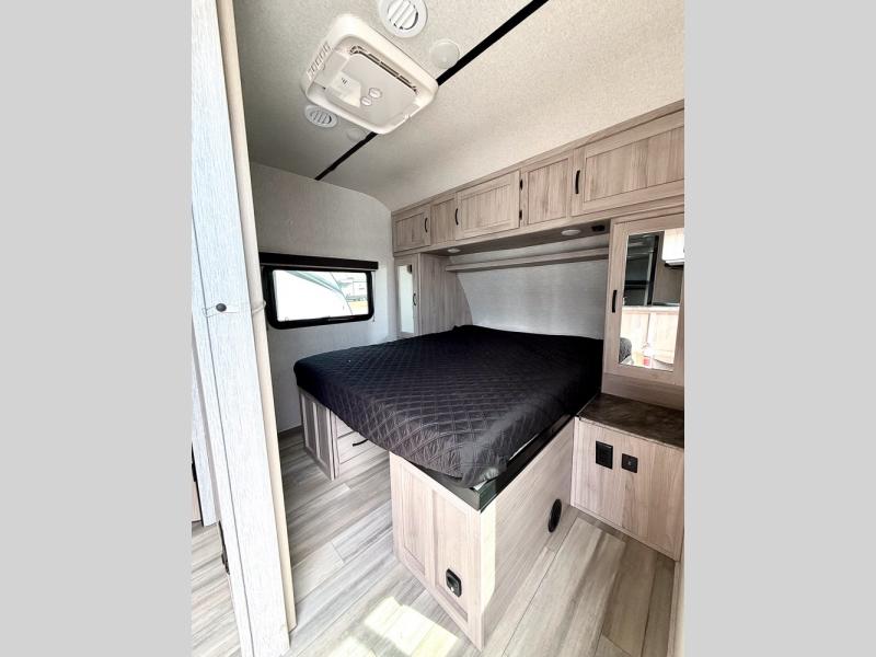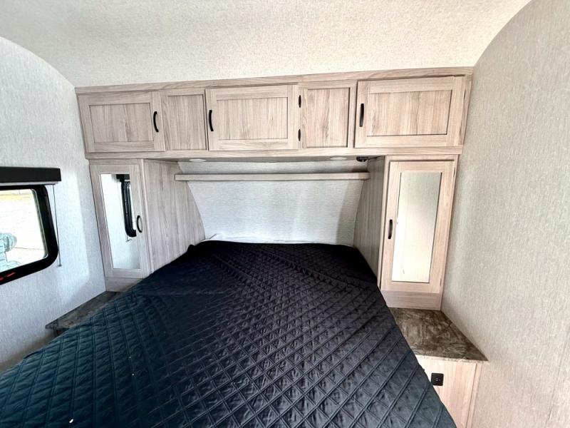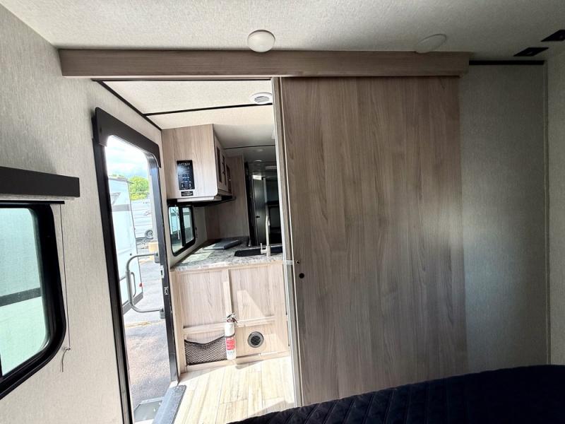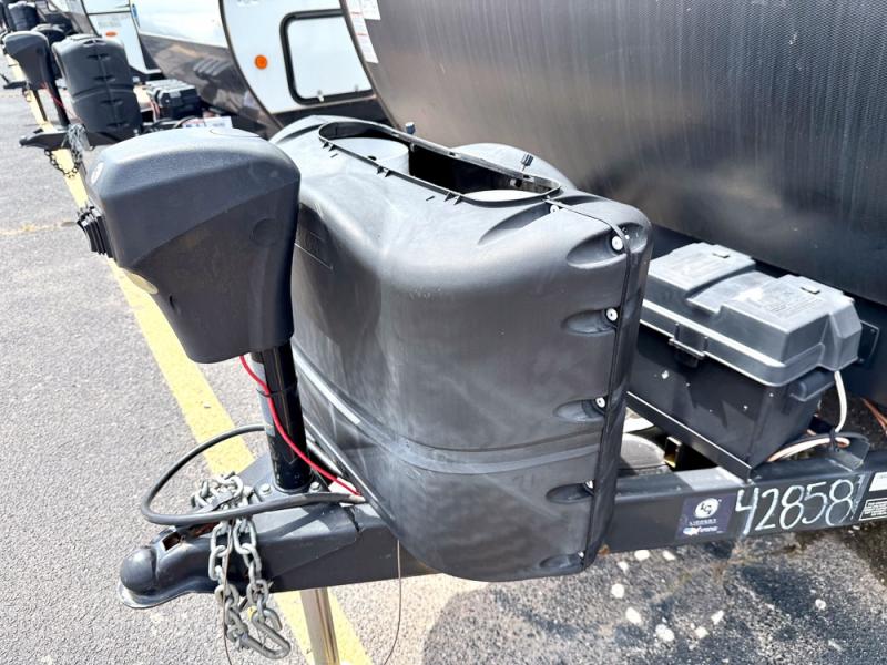 This is a popular bunk trailer for a larger family thanks to having the convenience of dual entry doors allowing access to the main living and kitchen area and near the front bedroom, and into the full bathroom for a quick in and out when playing outside. The bathroom also includes a hamper. The Stor-More cargo door allows you to place items from the exterior to the interior under the lower flip bunk for safe travels to your destinations and back home. The kids will surely love the convenience centers when playing or sleeping in a bunk. There is a sofa and U-shaped slide including a pet center for relaxing and feeding your pet. The kitchen includes full amenities plus a pantry to store lots of goodies for everyone. Along the exterior, the outside camp kitchen will come in handy when you have everyone at the campsite for dinner and the power awning offers some protection from the elements.