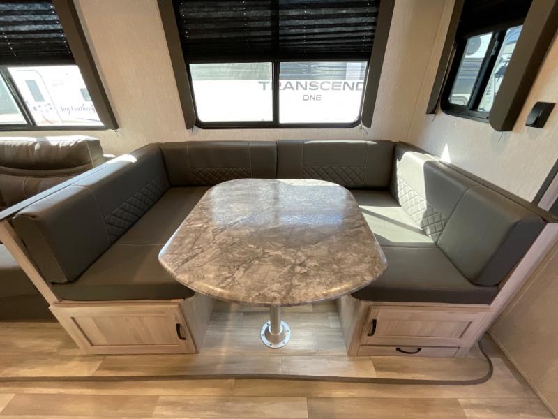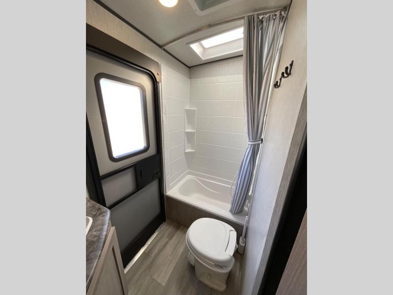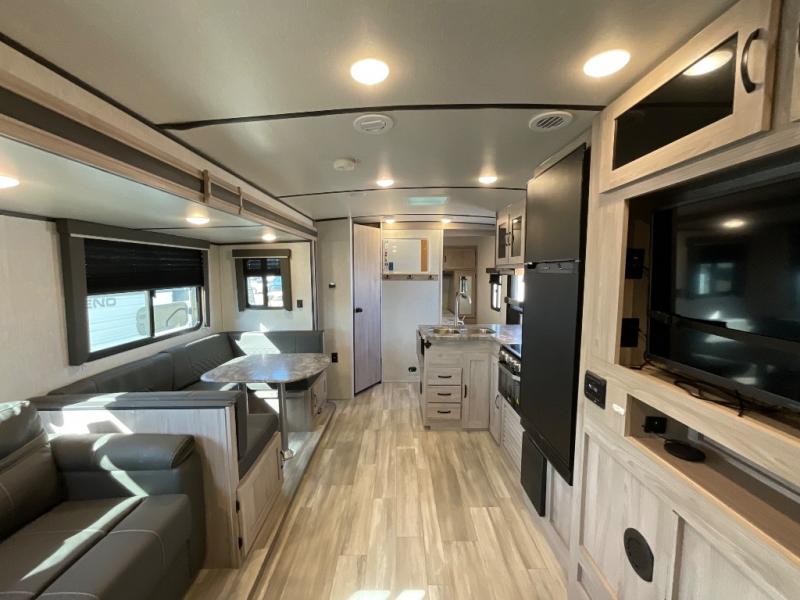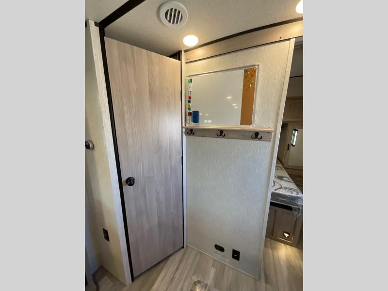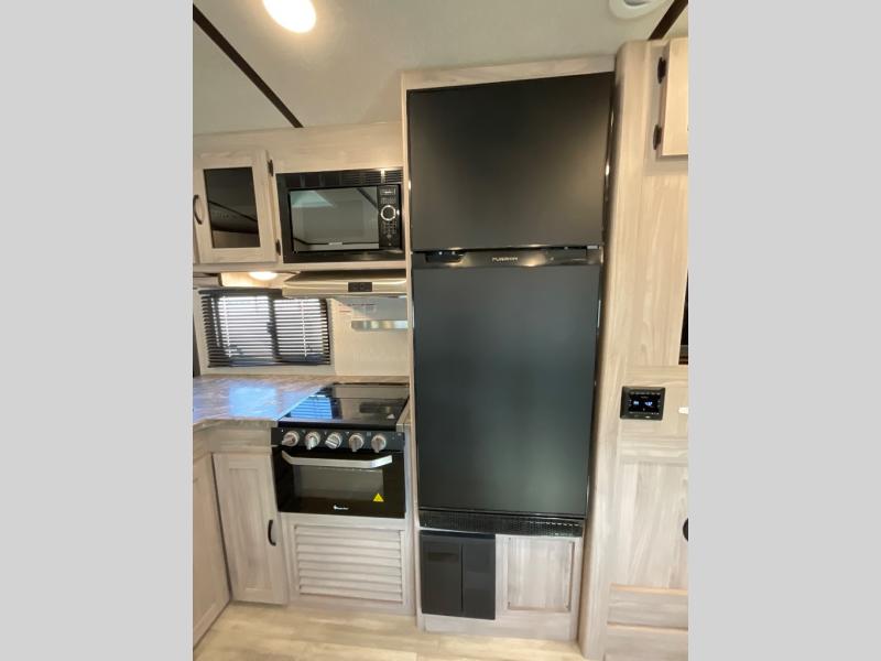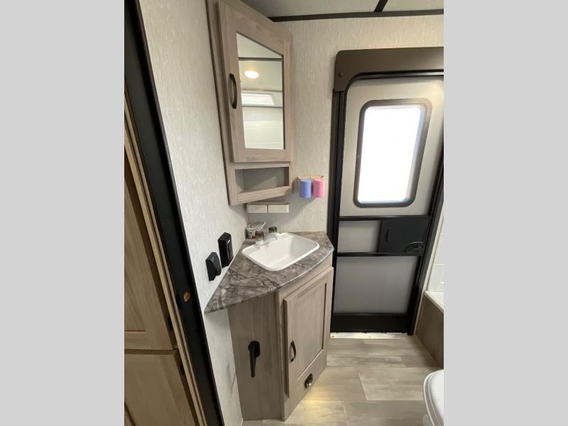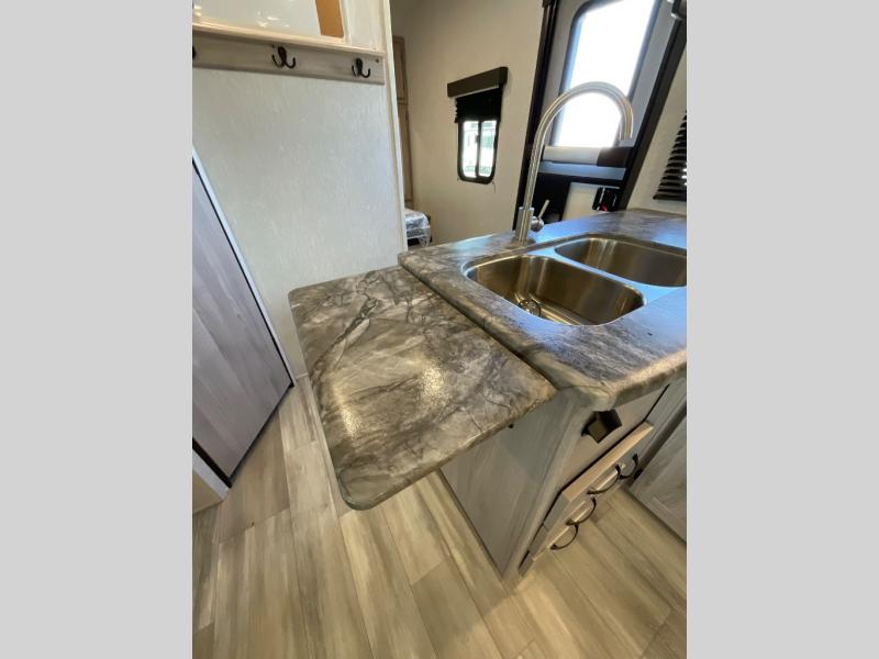 This is a popular bunk trailer for a larger family thanks to having the convenience of dual entry doors allowing access to the main living and kitchen area and near the front bedroom, and into the full bathroom for a quick in and out when playing outside. The bathroom also includes a hamper. The Stor-More cargo door allows you to place items from the exterior to the interior under the lower flip bunk for safe travels to your destinations and back home. The kids will surely love the convenience centers when playing or sleeping in a bunk. There is a sofa and U-shaped slide including a pet center for relaxing and feeding your pet. The kitchen includes full amenities plus a pantry to store lots of goodies for everyone. Along the exterior, the outside camp kitchen will come in handy when you have everyone at the campsite for dinner and the power awning offers some protection from the elements.