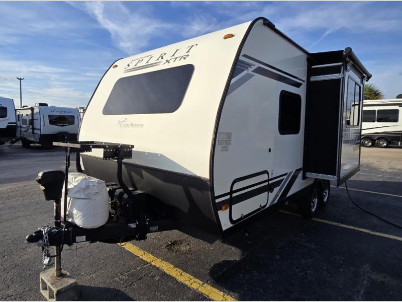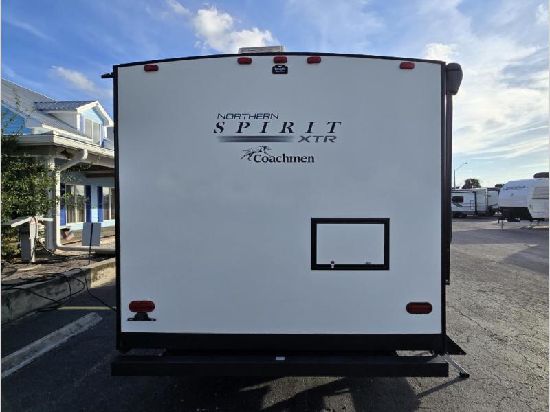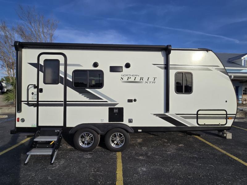 With any Northern Spirit XTR travel trailer by Coachmen you will enjoy years of use thanks to the solid construction that includes Azdel composite panels, a Tufflex PVC roof membrane, and laminated sidewalls. The panoramic front window will allow natural light in and make the area feel more open, and the "Twice Cool" dual ducted A/C unit will keep you cool during those summer camping months. Each model is pet friendly thanks to the exterior dog wash and dog leash clip, and the heated and enclosed underbelly will help extend your camping season. These travel trailers include ample storage space, including a pass-through storage with a motion activated light and Max Bed Storage on all models except 2146BHX that includes a versatile Murphy bed instead. Enjoy a little eXTRa with the Northern Spirit XTR travel trailers!
