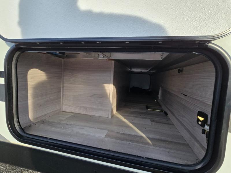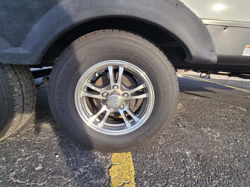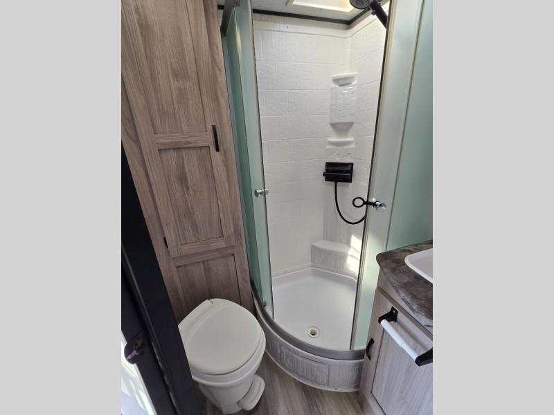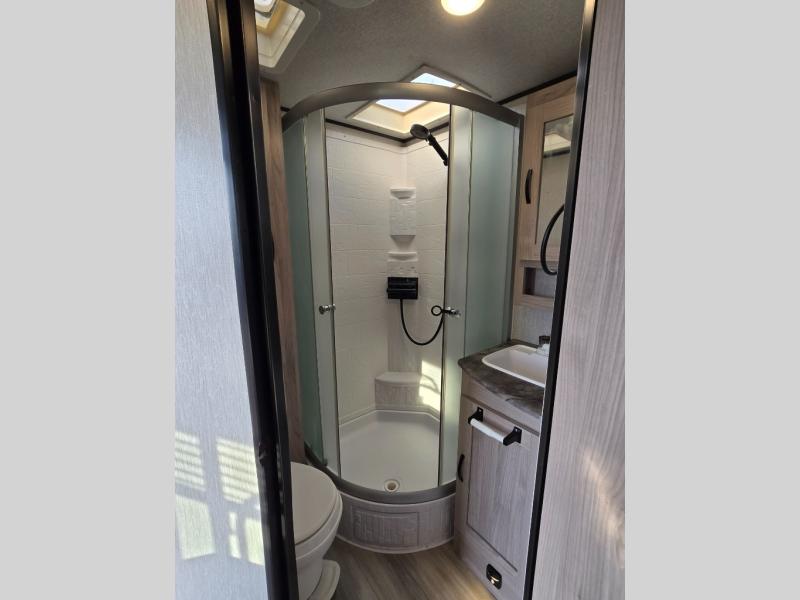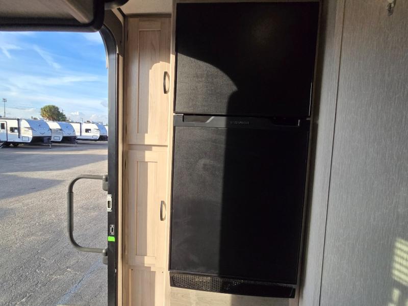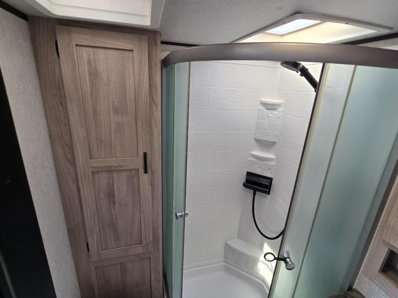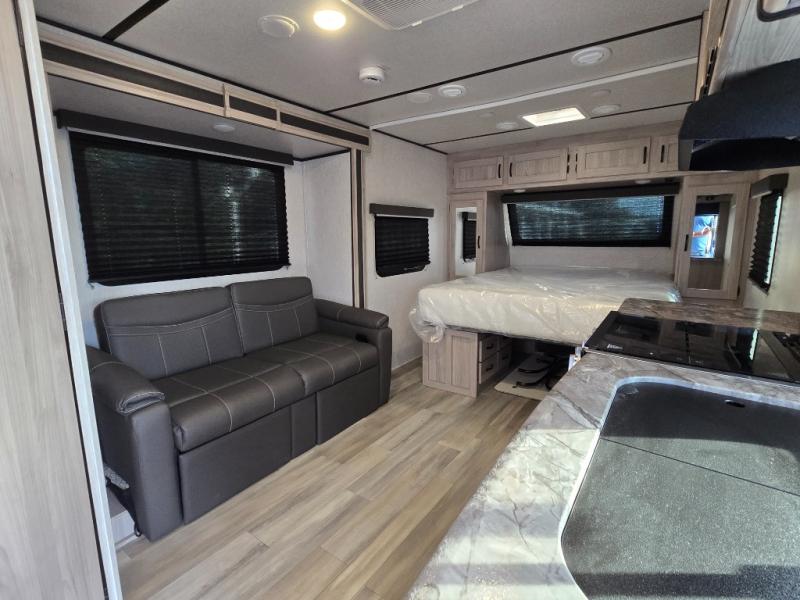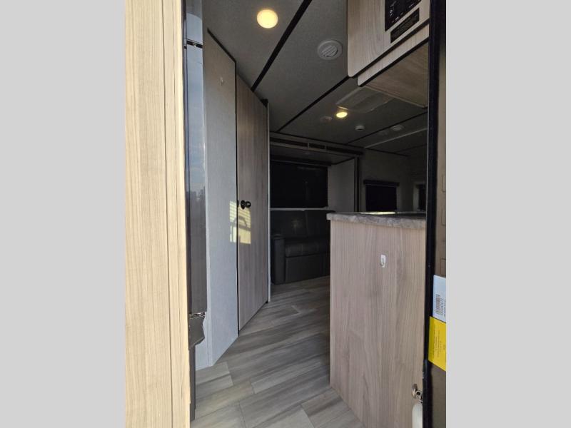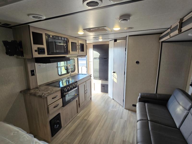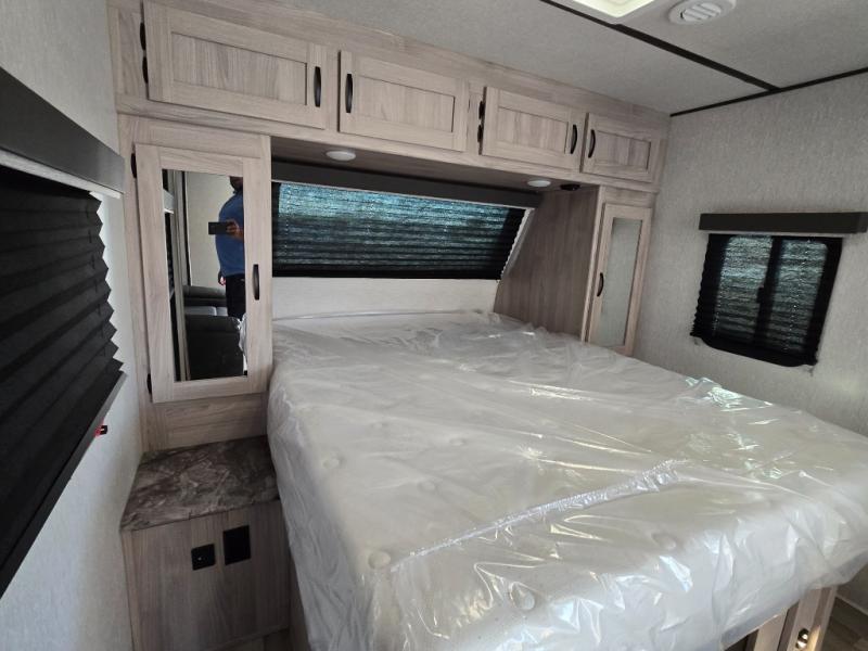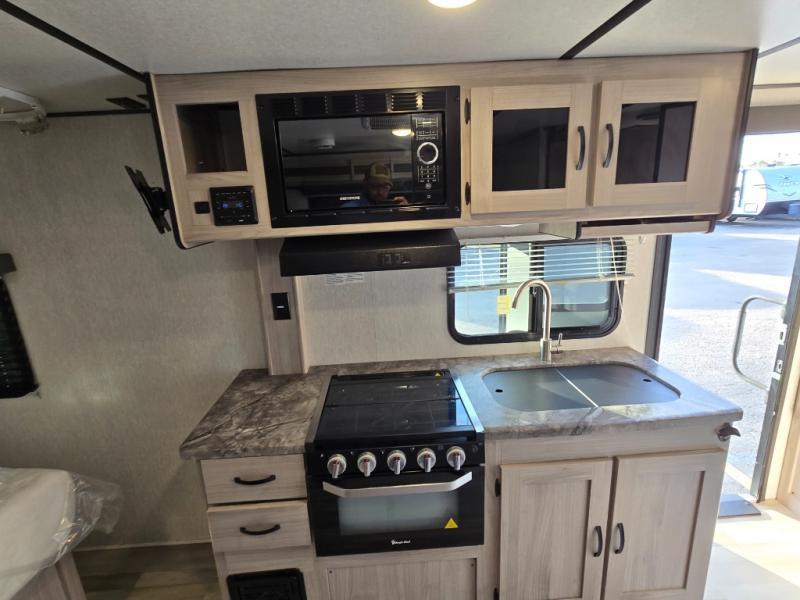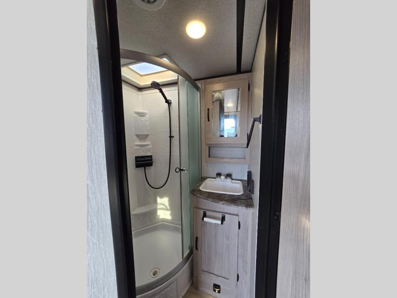 Easily hook up this lightweight travel trailer and head to your local state park for fun! The front bedroom includes a queen bed with Max Bed Storage, and dual bedroom wardrobes for all of your things. The free-standing table and sofa will provide a place to dine after lunch is prepared on the three burner cooktop. After a day outdoors you can clean up in the full bath that includes a radius shower, a linen closet, plus a shower skylight to let natural light in. This model also includes a two door refrigerator for your perishables, a hutch for more storage, plus an exterior pass-through storage for fishing poles!
