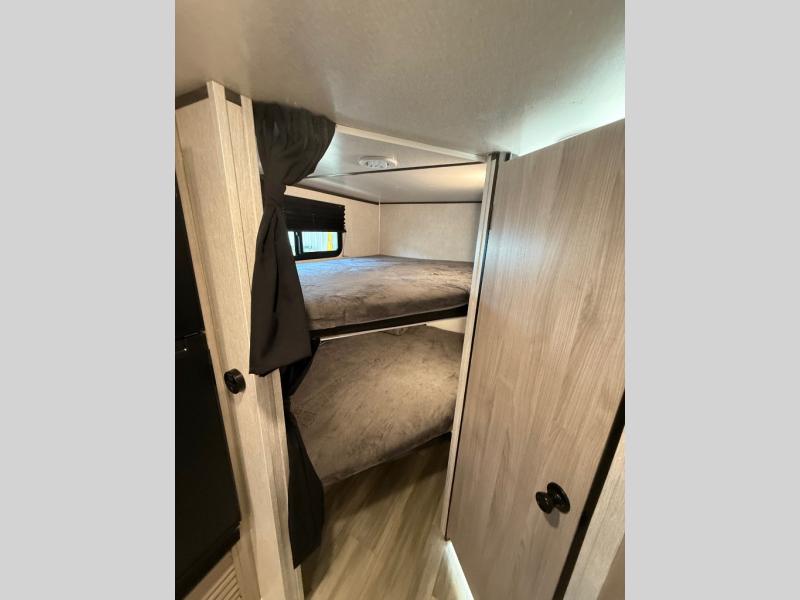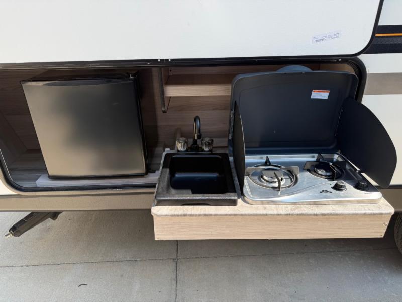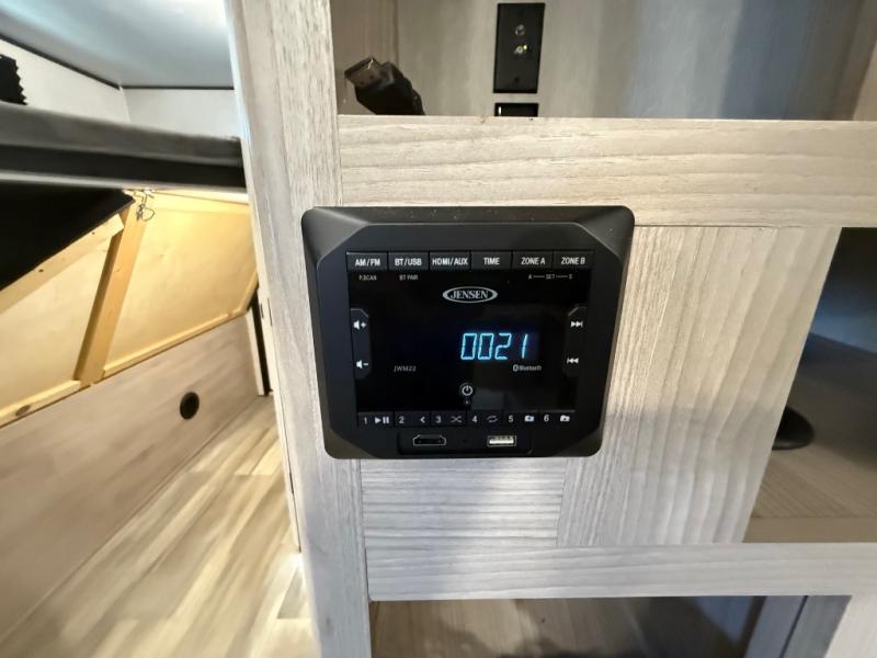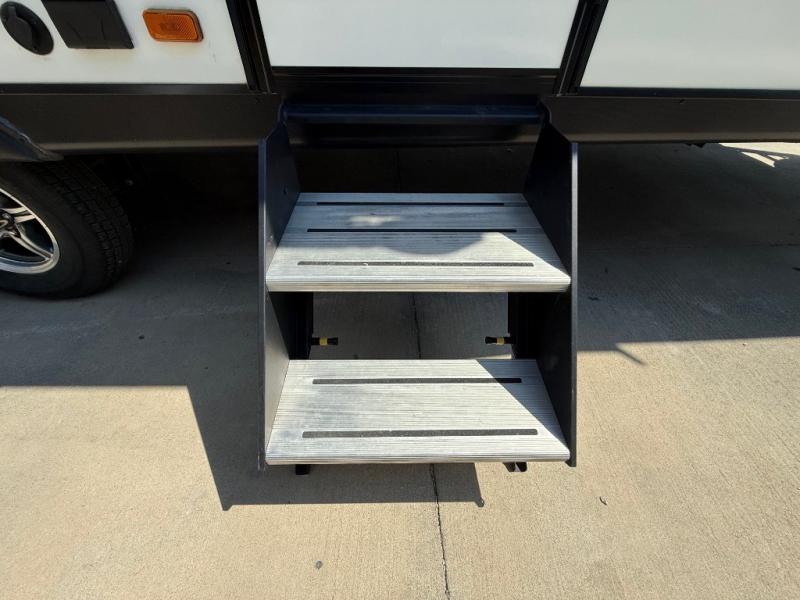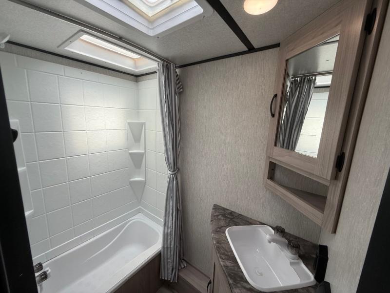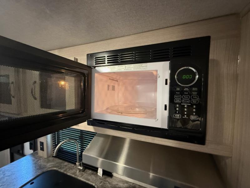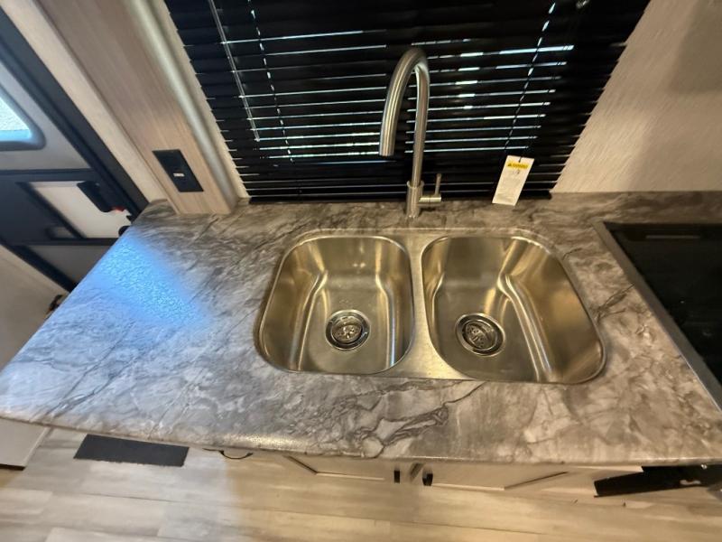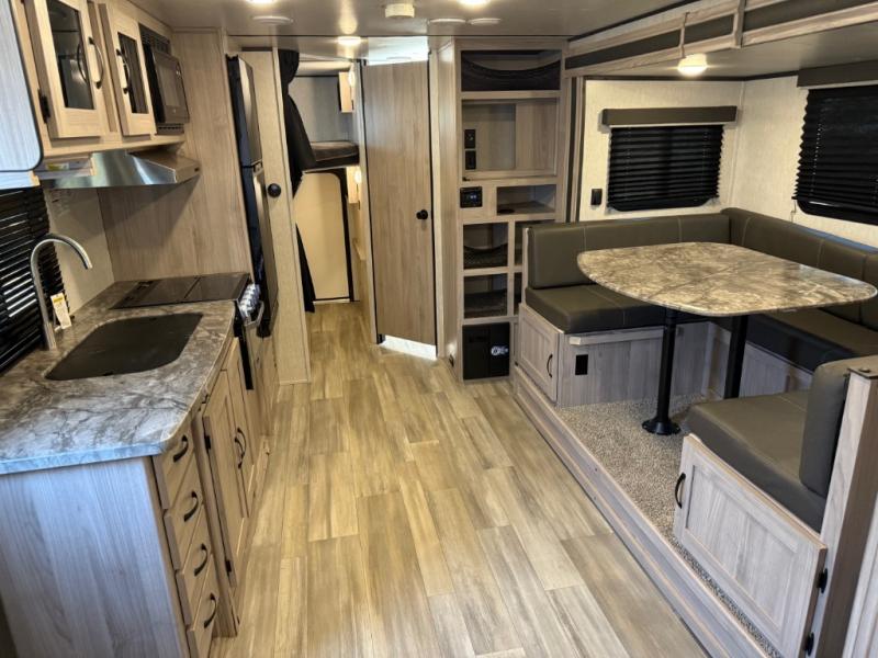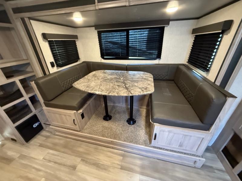 You can't go wrong with this travel trailer in tow! Once you arrive at the campground, set up the 20' power awning, then make a quick lunch on the exterior camp kitchen before heading out on a trail. There is a full bath inside that will allow you to clean up after your adventures, and sleeping space for eight between the double-size bunks, the queen bed, plus the U-shaded dinette within the slide out. After you've rested, you may want to watch a movie on the LED TV, and don't forget to grab your snacks from the pantry!