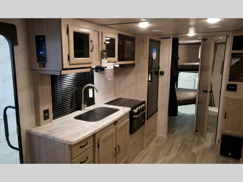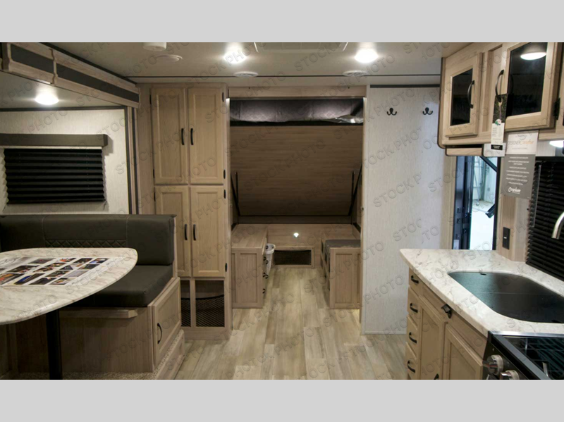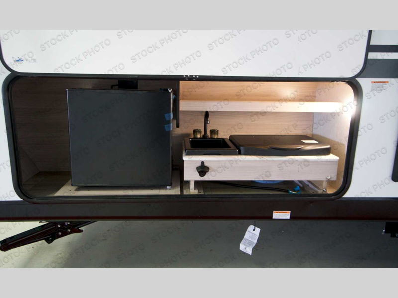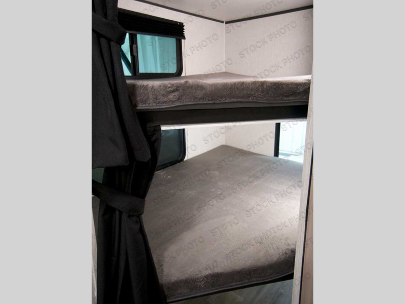 You can't go wrong with this travel trailer in tow! Once you arrive at the campground, set up the 20' power awning, then make a quick lunch on the exterior camp kitchen before heading out on a trail. There is a full bath inside that will allow you to clean up after your adventures, and sleeping space for eight between the double-size bunks, the queen bed, plus the U-shaded dinette within the slide out. After you've rested, you may want to watch a movie on the LED TV, and don't forget to grab your snacks from the pantry!