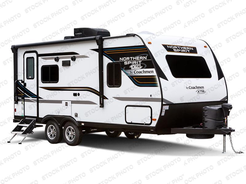 With any Northern Spirit XTR travel trailer by Coachmen you will enjoy years of use thanks to the solid construction that includes Azdel composite panels, a Tufflex PVC roof membrane, and laminated sidewalls. The panoramic front window will allow natural light in and make the area feel more open, and the "Twice Cool" dual ducted A/C unit will keep you cool during those summer camping months. Each model is pet friendly thanks to the exterior dog wash and dog leash clip, and the heated and enclosed underbelly will help extend your camping season. These travel trailers include ample storage space, including a pass-through storage with a motion activated light and Max Bed Storage on all models except 2146BHX that includes a versatile Murphy bed instead. Enjoy a little eXTRa with the Northern Spirit XTR travel trailers!
