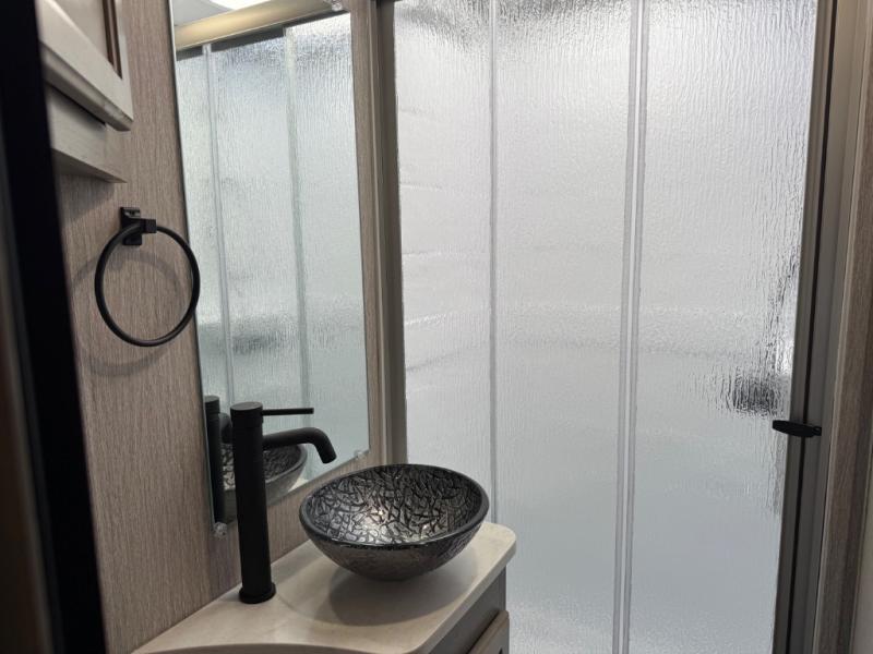 Looking for privacy when you sleep at night when the kids or your friends join you? This coach offers a private bedroom with a full bathroom, a slide out queen bed, and a wardrobe. The main living and kitchen space is spacious as well with a slide out booth dinette or choose the sofa or recliners option, a pantry, more storage, and full kitchen amenities including a countertop extension. The bunk over the cab is a great place to sleep, and the dinette offers extra sleeping space. You can watch TV inside or outside, and the armless awning gives you some protection from the elements.