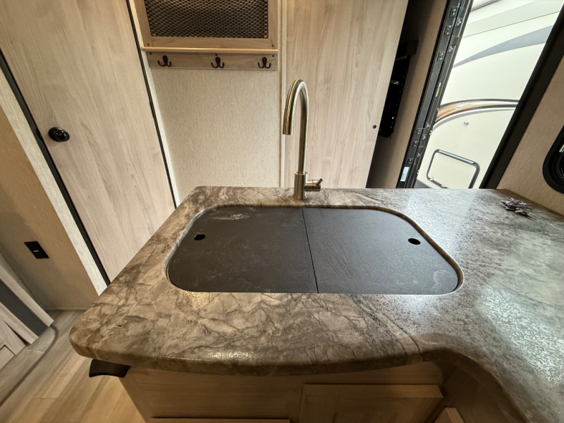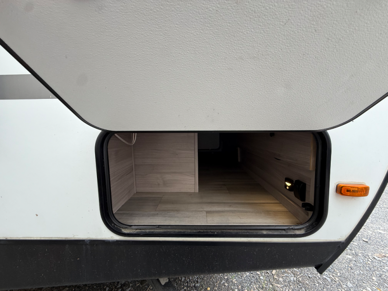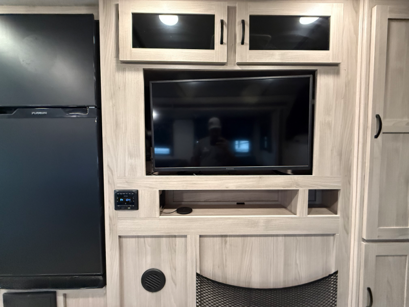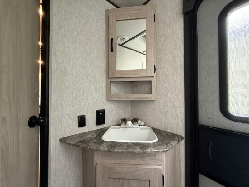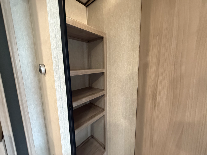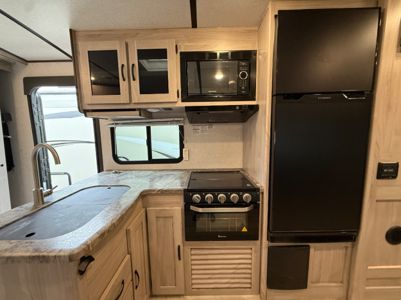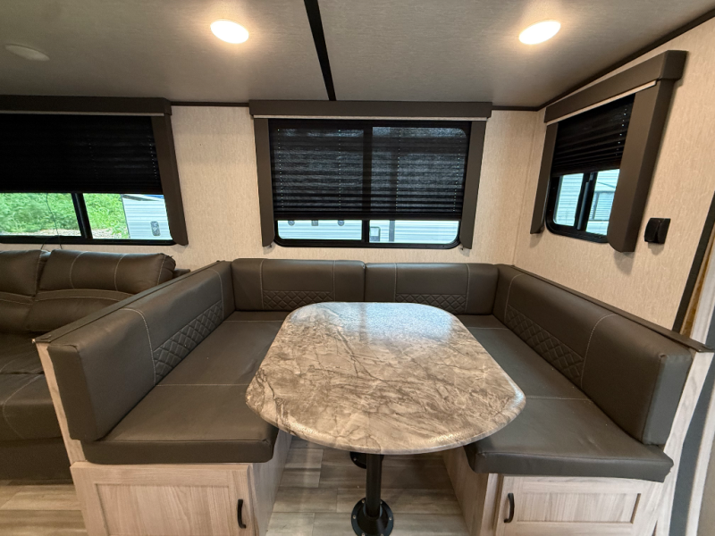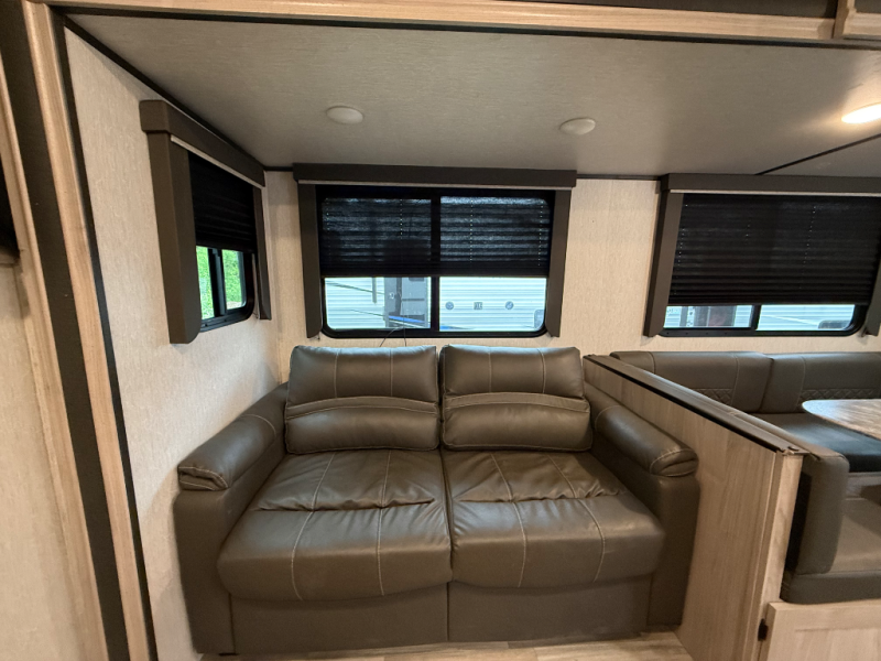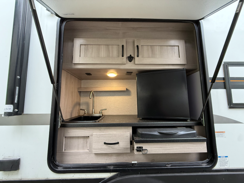 You'll be able to use this Spirit Ultra Lite travel trailer for all sorts of adventures, whether it's a weekend trip with friends, a month-long journey to see extended family, or everything else in between. There is a large slide that holds the sofa and U-shaped dinette, and the pet center is at the base of the dinette. The pantry will hold your favorite snacks while the 10-cubic foot refrigerator stores your juices and milk. The entertainment center with hutch is directly across from the sofa and dinette for easy viewing, and the full bathroom contains the second exterior entry door for quick access while outside cooking at the camp kitchen. When you enter through the main entry door, you'll find a tool center directly to your left.