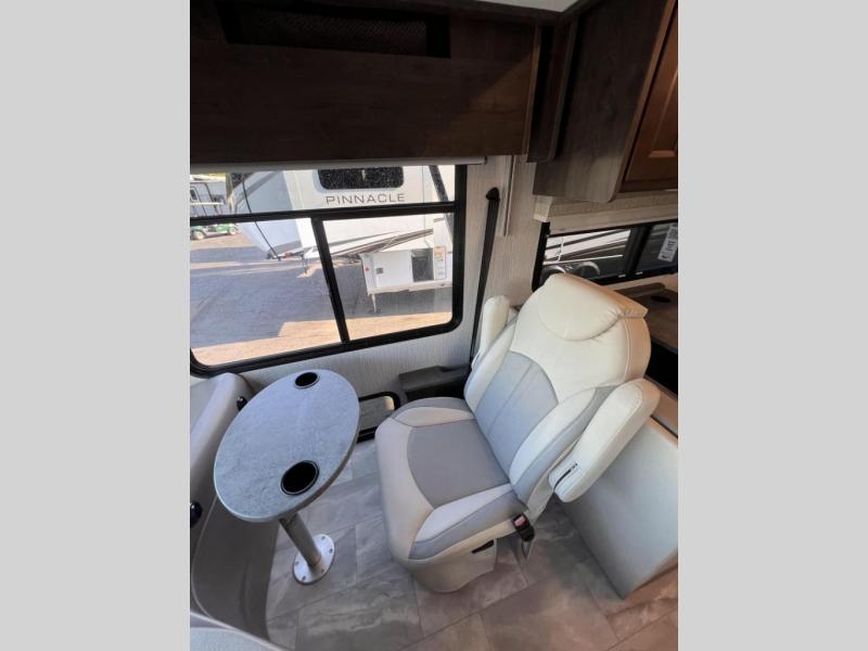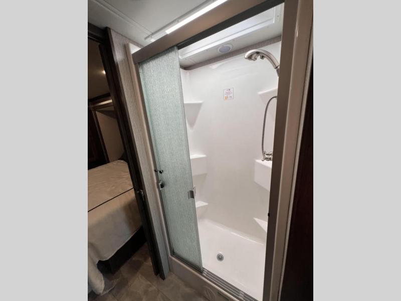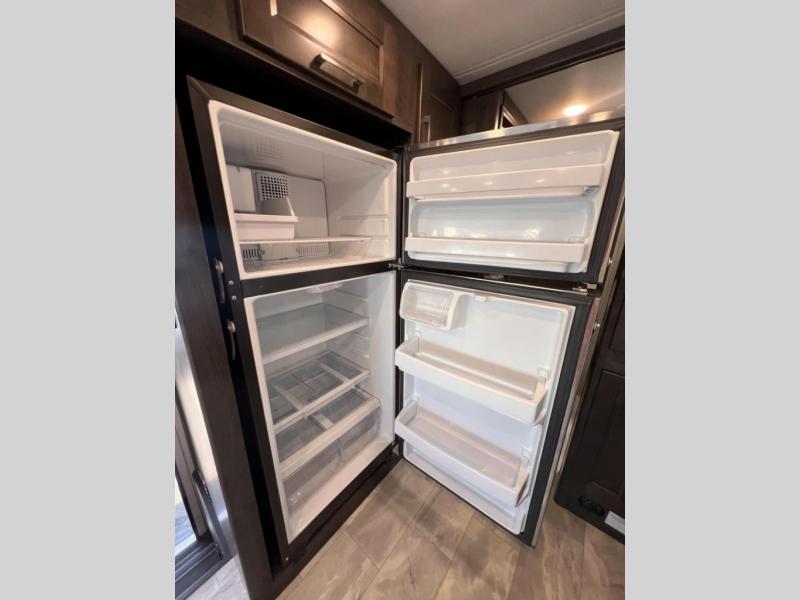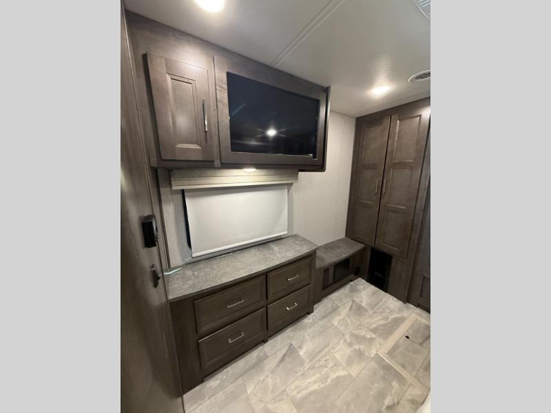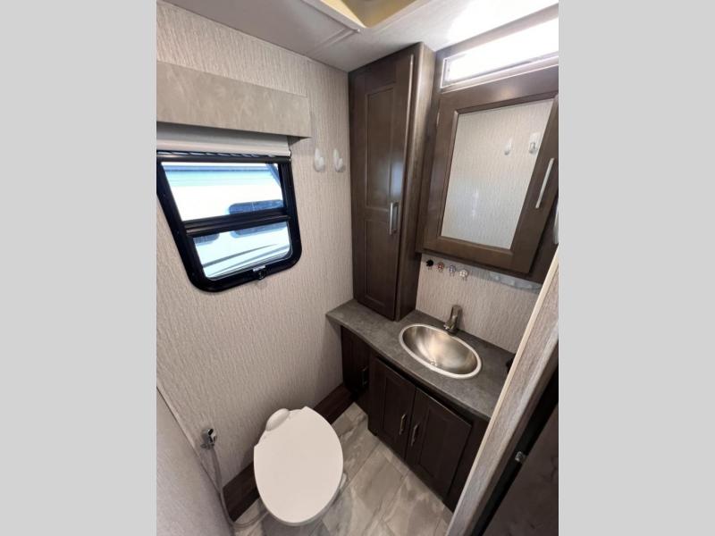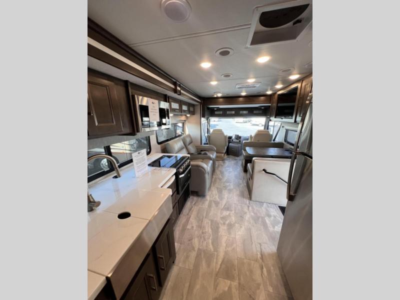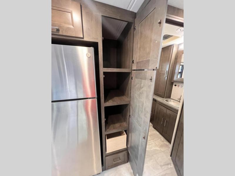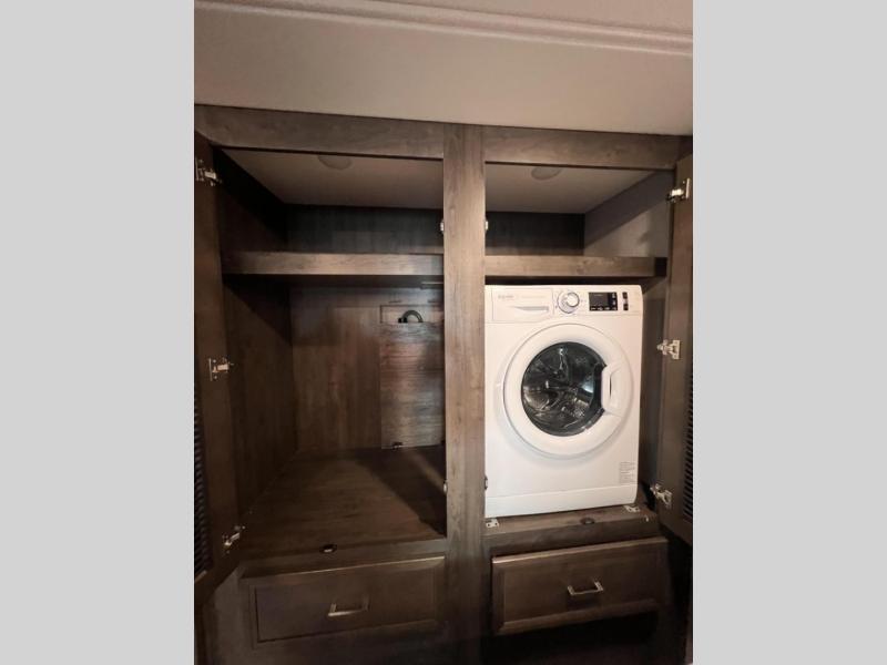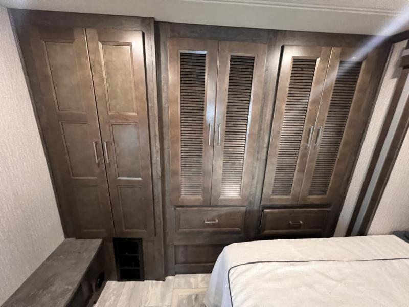 This double slide out coach is ready for adventure when you are! The oval cockpit table with cupholders will provide a place to enjoy your morning coffee at, and there is a booth dinette where you can dine together before you start your day. There is theatre seating directly across from the 40" LCD TV to watch your favorite shows, and you'll find plenty of overhead compartments for your valuables. The kitchen is packed with everything you need, including a three burner range, a 30" stainless steel over the range microwave, plus a stainless steel residential refrigerator. And take a look at the stylish farmhouse sink and two pantries! This model includes a private toilet and sink, with the shower across the hall so two people can freshen up at once. The rear private bedroom will feel just like home with its king bed slide out, two wardrobes, a 32" LCD TV, plus a convenient CPAP station. This coach is also washer and dryer ready, so plan to stay awhile!