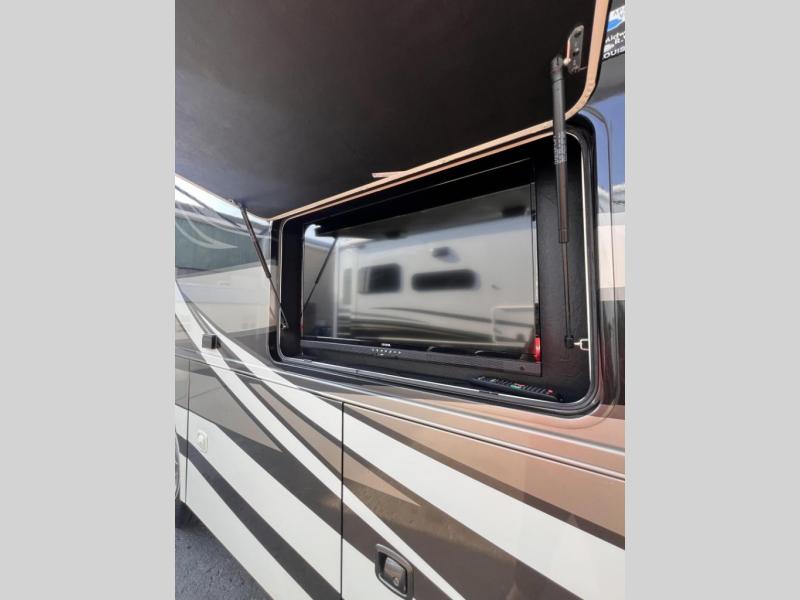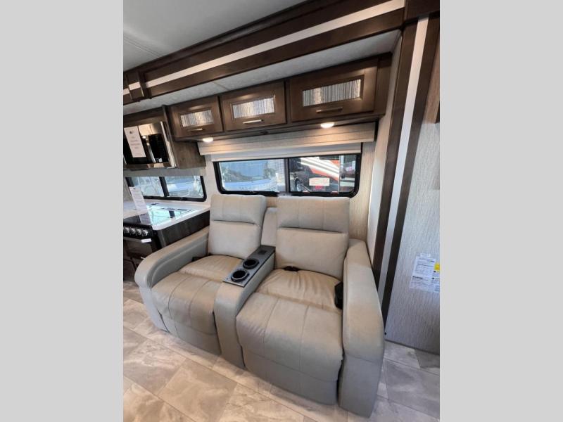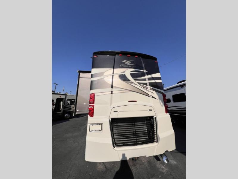 The Sportscoach SRS Class A diesel motorhome by Coachmen sits on a straight rail Freightliner chassis with a 340 HP ISB Cummings rear diesel engine that will deliver power to your excursions. Each coach features chassis air suspension and air brakes, an 8,000 lb. towing hitch, and an outside entertainment center with a 40" TV to watch the big game outdoors. Some of the electrical, heating, and AC amenities you will appreciate are the 6.0 kW diesel generator, the 100 watt solar panel with a controller, and the two 15,000 BTU A/C units. The galley features convenient pop-up recept with USB ports, stylish kitchen backsplash, and a stainless steel farmhouse style sink that will make clean-up easier than ever. Comfort will come easy with the upgraded mattress in the bedroom, along with a residential style headboard and a king bed. Affordable, powerful, and comfortable; what's not to love about the Sportscoach SRS Class A diesel coach!