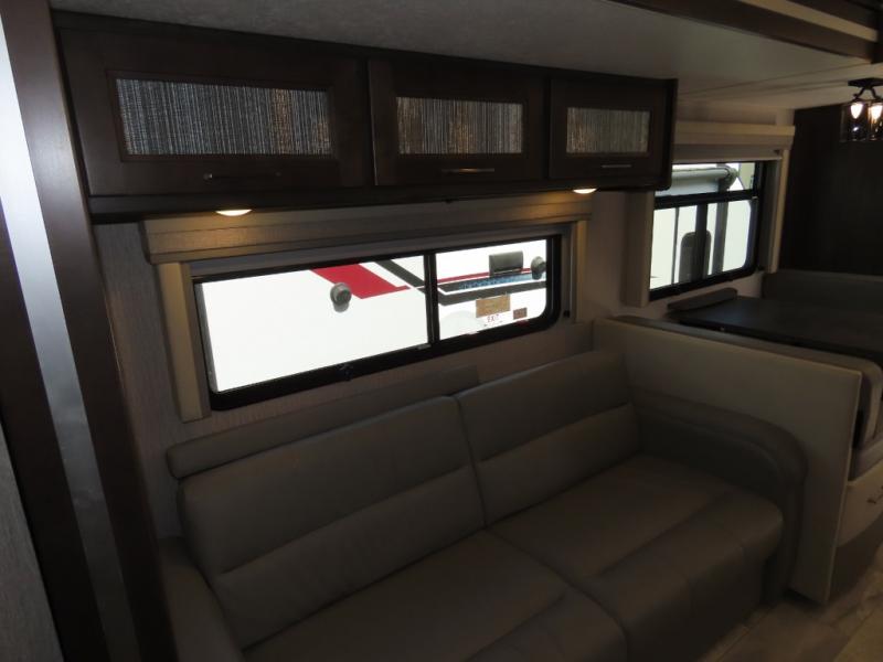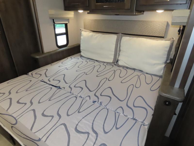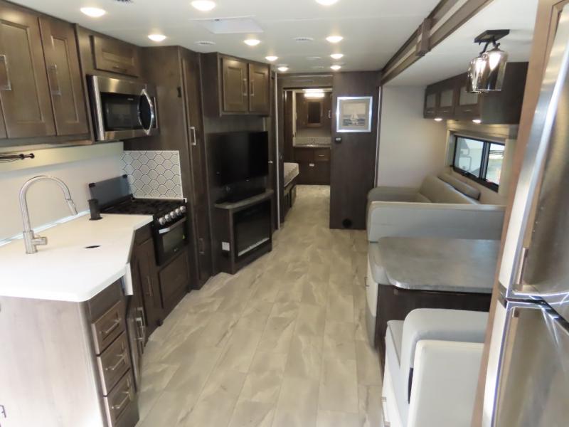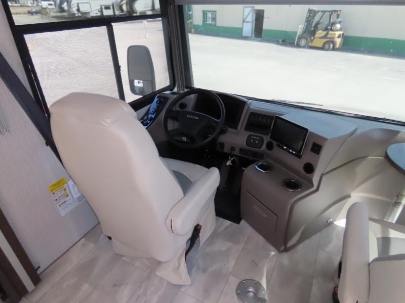 Wow! Check out this motorhome with a full rear bath, a convenient half bath, and sleeping space for six! There is a cockpit table with cupholders for your drinks, a booth dinette where you can dine together, and a 78" sofa bed across from the fireplace and 40" LCD TV. And the littles ones will love the drop-down overhead bunk. The chef of your group can prepare meals on the three burner range or in the stainless steel over the rang microwave. The master bedroom is comfortable with its king bed slide out and residential style headboard, plus there are USB ports on both sides of the bed and a CPAP station above the bed for convenience.