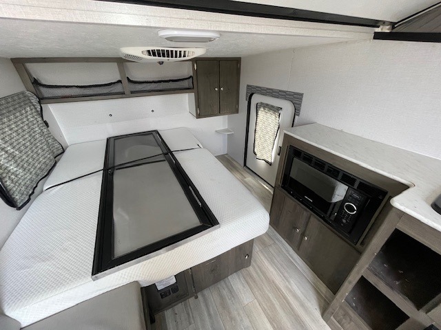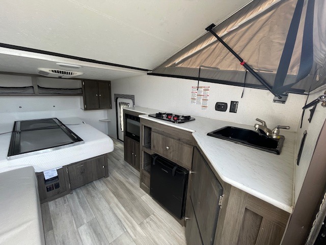 Enjoy the outdoors traveling to all of your favorite places with this V-Trec rear fold-down pop-top roof with rear entry access. There is also an exterior front side storage door that gives you easy access to your things when traveling, or easy access to items tucked under the front bed when camped. On the inside, you will enjoy being able to cook simple meals on the two burner range top, or in the microwave oven that is tucked beneath the counter. There is a front corner 54" x 74" bed as well as a gaucho sofa to the left of the rear entry door for seating which can also be used for extra sleeping space when needed by folding it down. You will also enjoy having access to an outdoor refrigerator for drinks and snacks while enjoying time spent outside. And, with the front 60" cargo deck for your gear and toys, you can easily take along bicycles, kayaks, dirt bikes, and/or any other fun gear or equipment you want for your adventures away from home.