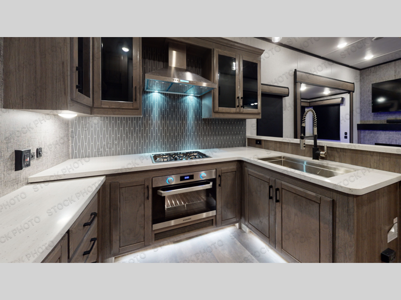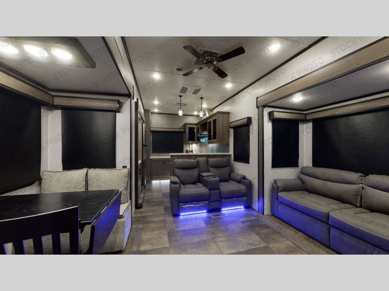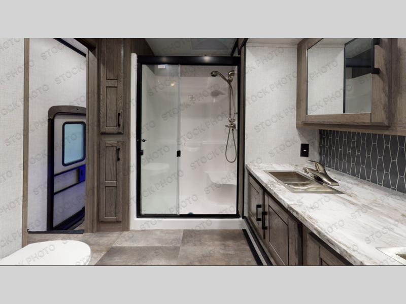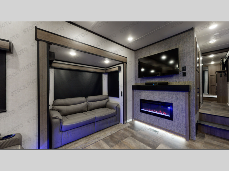 The chef will enjoy cooking in the rear kitchen of this fifth wheel! It features the Furrion kitchen collection, lots of countertop space to prepare their best meals, overhead cabinets to store all the cooking essentials, and even a microwave to pop a bag of popcorn for movie night in the middle living area. The living area has a tri-fold sofa slide, power theater seating across from an entertainment center with a fireplace, and a ceiling fan above it all for good air circulation. The dinette table slide creates more walking around space and is a comfortable place to eat meals. Freshen up in the dual entry bathroom with a 48" shower with a seat and a dual sink vanity then head directly into the front private bedroom. The bedroom has a king bed slide to lay your head at night, a dresser with fireplace and 39" TV for your entertainment, and a front closet with a shoe shelf and prepped to add an optional washer and dryer!
