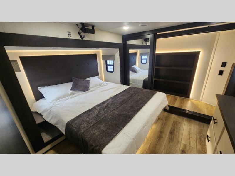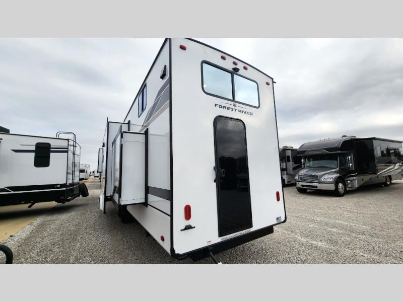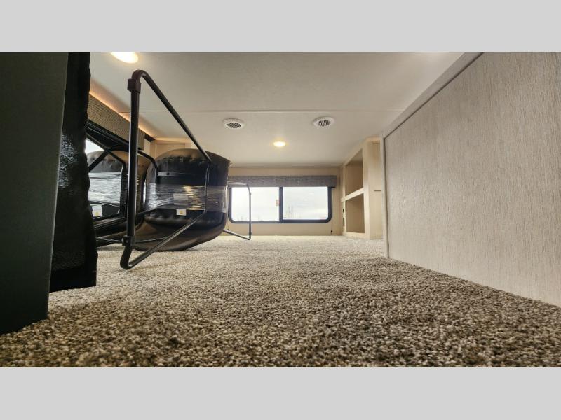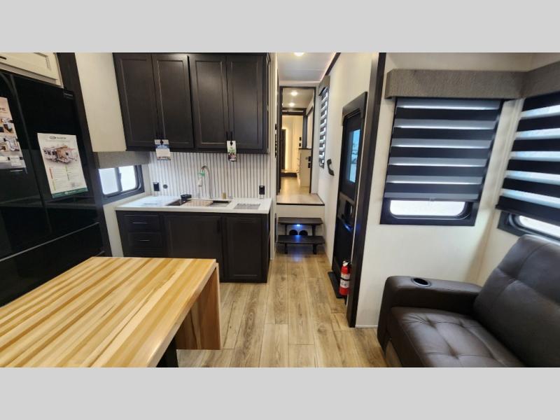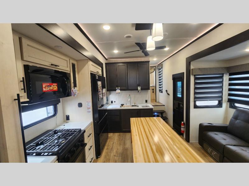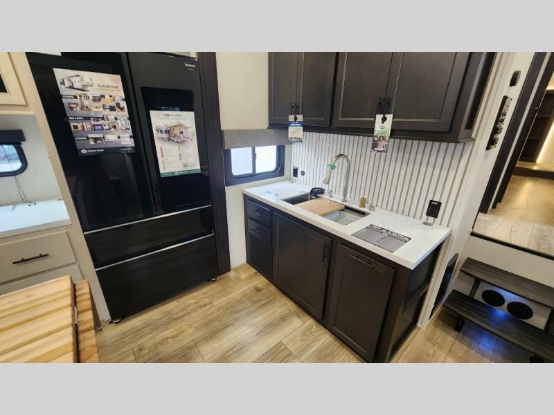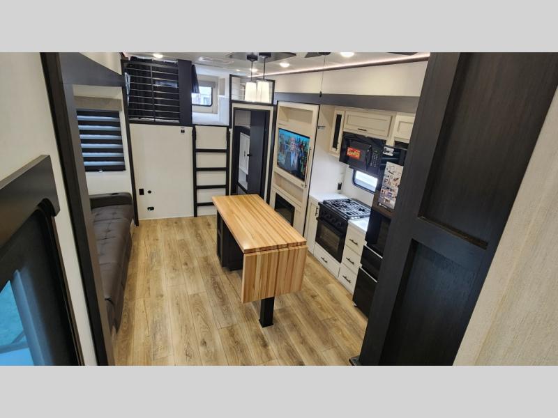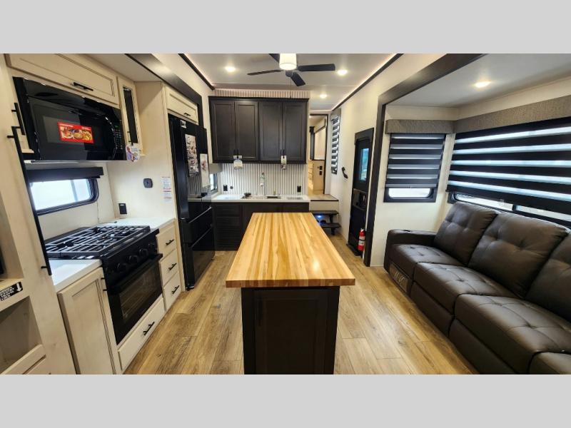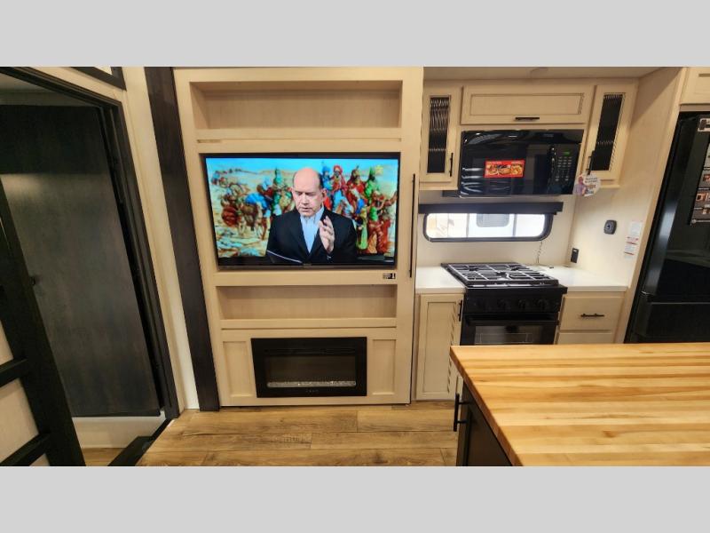 With dual entry doors, everyone can easily access this fifth wheel! One of the entrances leads directly into the half bathroom attached to the rear bedroom which has a tri-fold sofa slide and wardrobe below a 54" x 74" loft bunk matt. The chef can prepare their best home cooked meals either indoors with the Furrion kitchen collection and the kitchen island or at the outside kitchen with a refrigerator and griddle. Enjoy your meals together at the dinette with two chairs on one side and bench seating on the other side. The dual entry bathroom has a 48" shower with a seat to freshen up in each morning and a dual sink vanity for two to get ready at once, plus it enters into the front private bedroom. You will feel right at home in the bedroom with the king bed slide across from the dresser with a fireplace and 39" TV, and the front closet with a shoe shelf and an area prepped to add an optional washer and dryer!