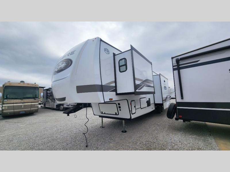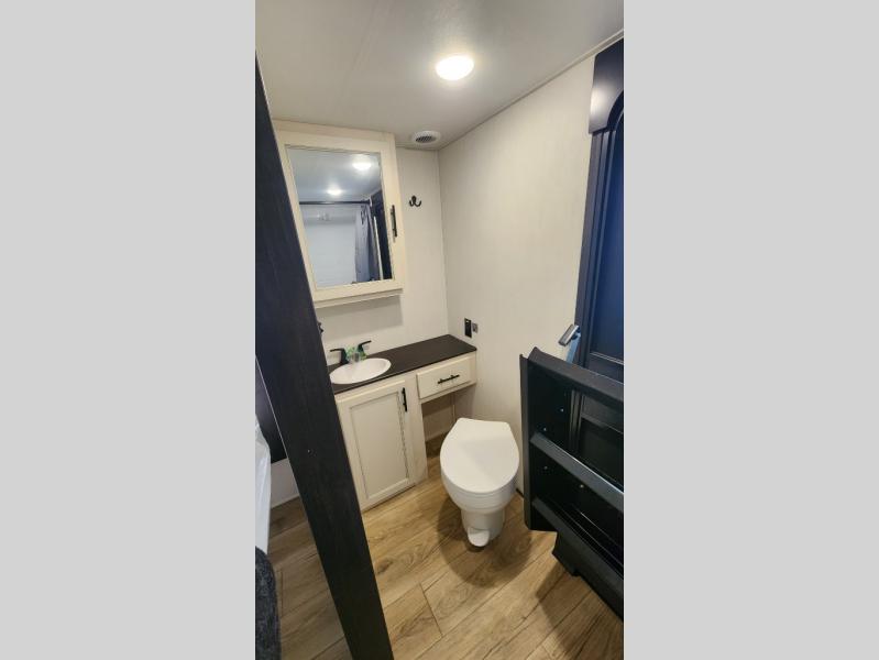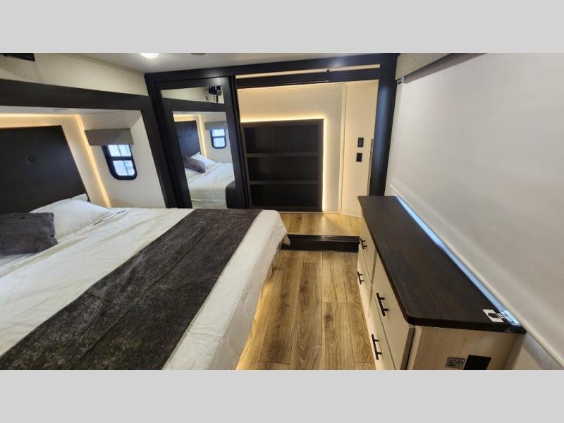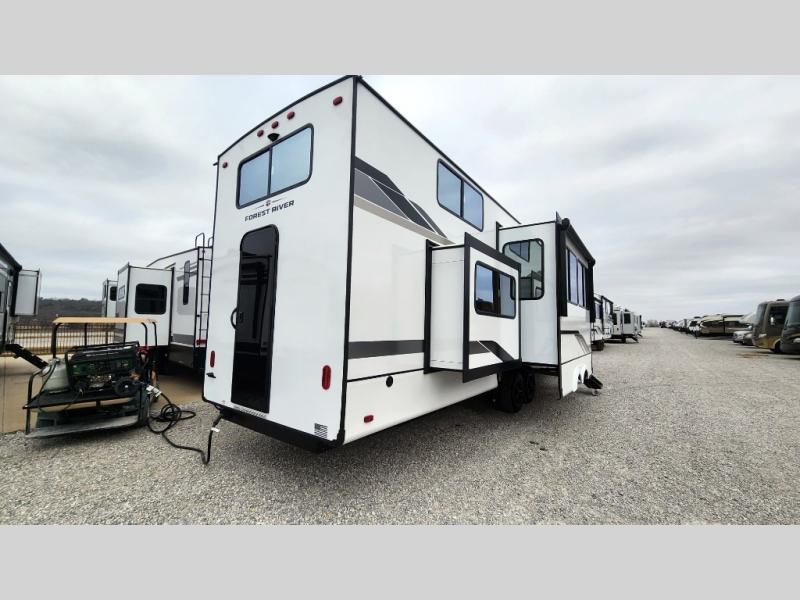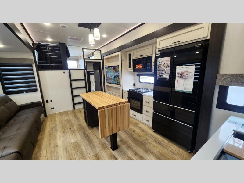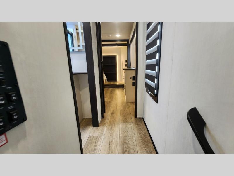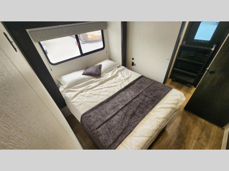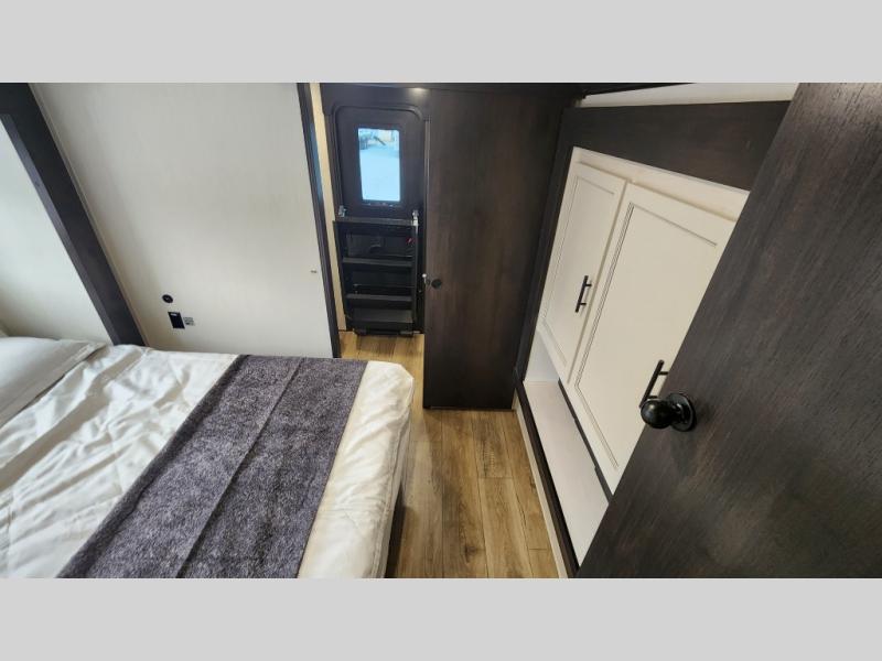 With dual entry doors, everyone can easily access this fifth wheel! One of the entrances leads directly into the half bathroom attached to the rear bedroom which has a tri-fold sofa slide and wardrobe below a 54" x 74" loft bunk matt. The chef can prepare their best home cooked meals either indoors with the Furrion kitchen collection and the kitchen island or at the outside kitchen with a refrigerator and griddle. Enjoy your meals together at the dinette with two chairs on one side and bench seating on the other side. The dual entry bathroom has a 48" shower with a seat to freshen up in each morning and a dual sink vanity for two to get ready at once, plus it enters into the front private bedroom. You will feel right at home in the bedroom with the king bed slide across from the dresser with a fireplace and 39" TV, and the front closet with a shoe shelf and an area prepped to add an optional washer and dryer!