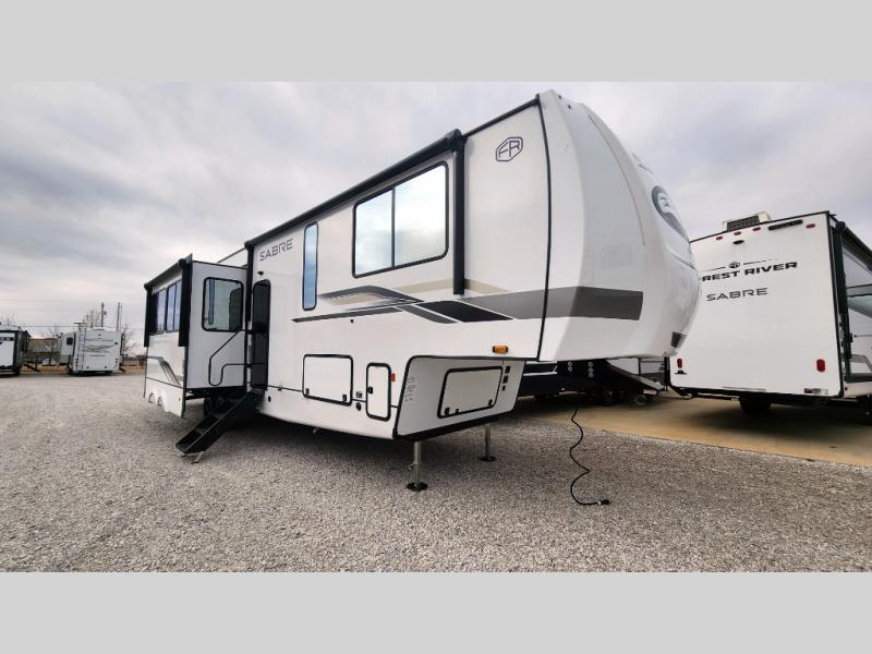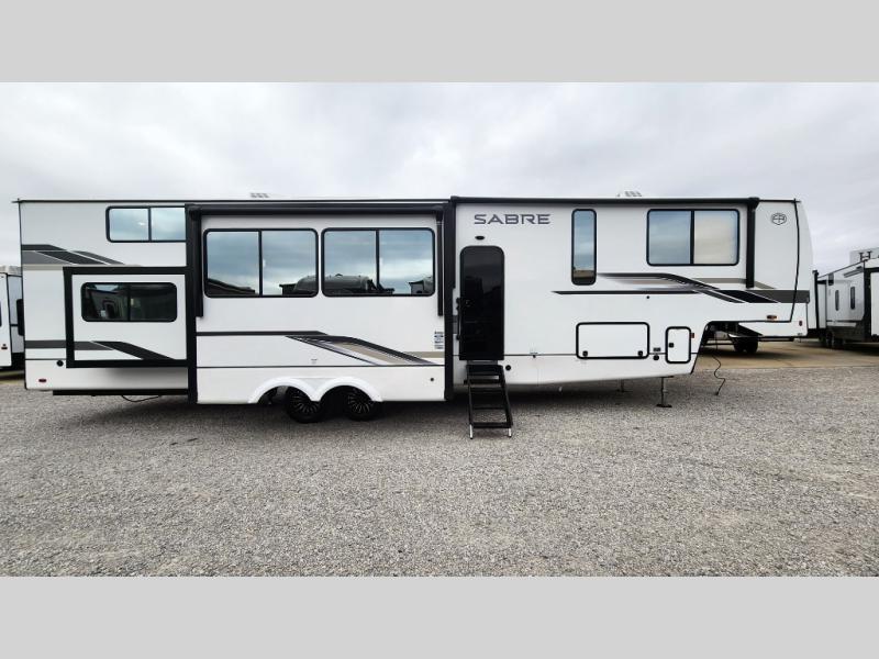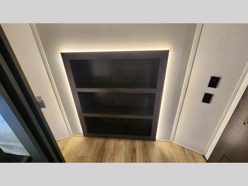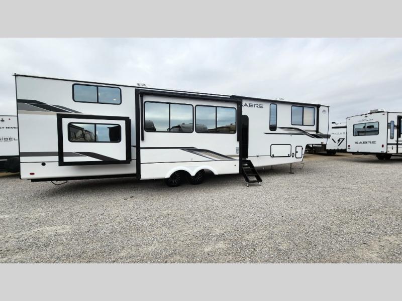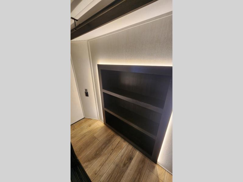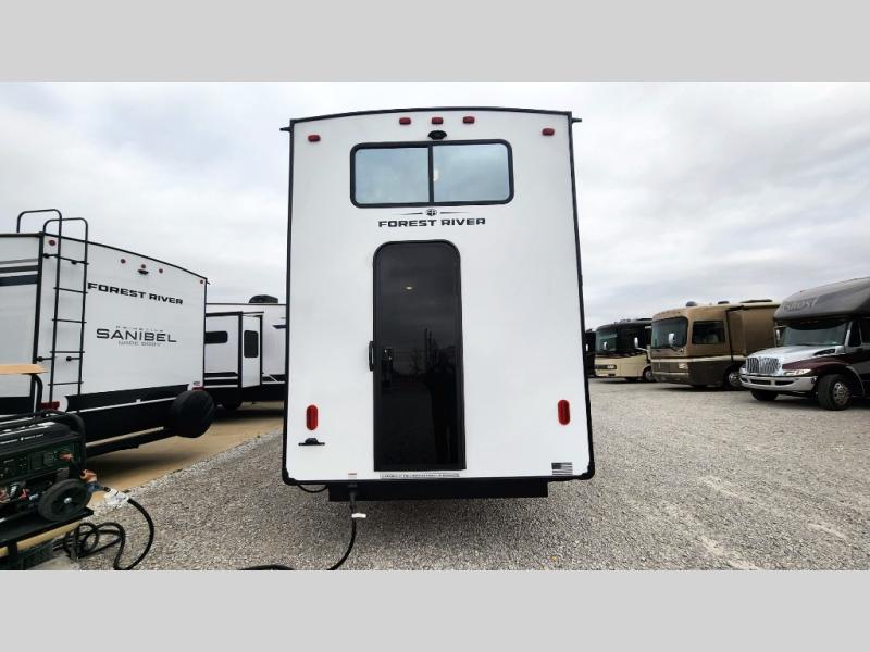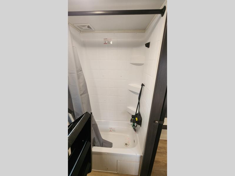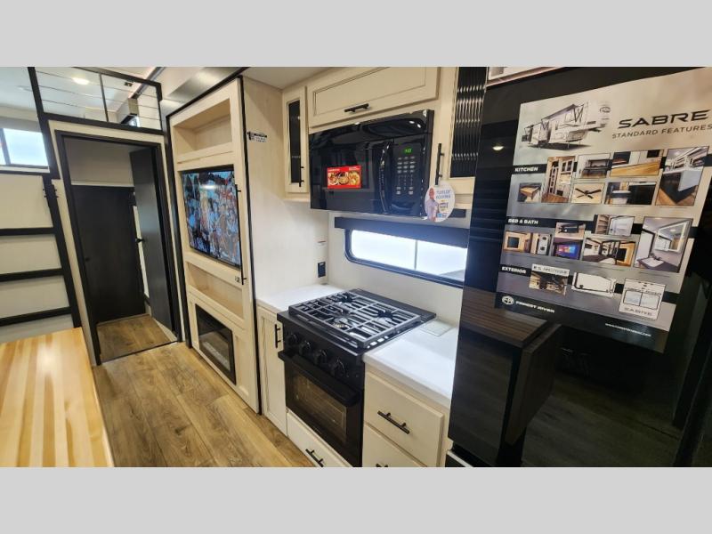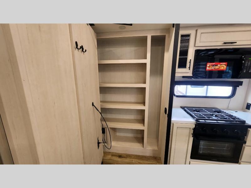 With dual entry doors, everyone can easily access this fifth wheel! One of the entrances leads directly into the half bathroom attached to the rear bedroom which has a tri-fold sofa slide and wardrobe below a 54" x 74" loft bunk matt. The chef can prepare their best home cooked meals either indoors with the Furrion kitchen collection and the kitchen island or at the outside kitchen with a refrigerator and griddle. Enjoy your meals together at the dinette with two chairs on one side and bench seating on the other side. The dual entry bathroom has a 48" shower with a seat to freshen up in each morning and a dual sink vanity for two to get ready at once, plus it enters into the front private bedroom. You will feel right at home in the bedroom with the king bed slide across from the dresser with a fireplace and 39" TV, and the front closet with a shoe shelf and an area prepped to add an optional washer and dryer!