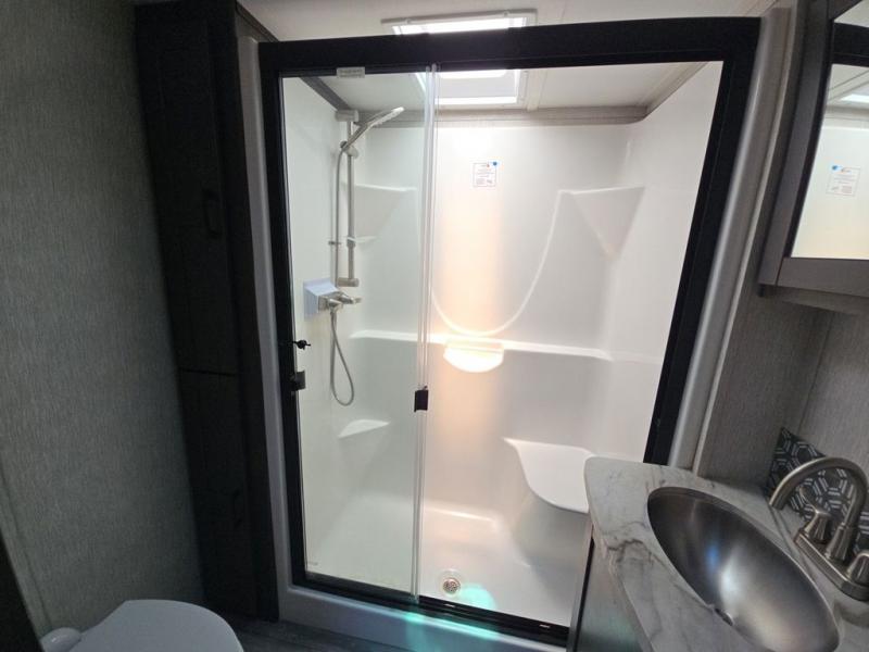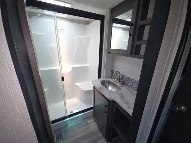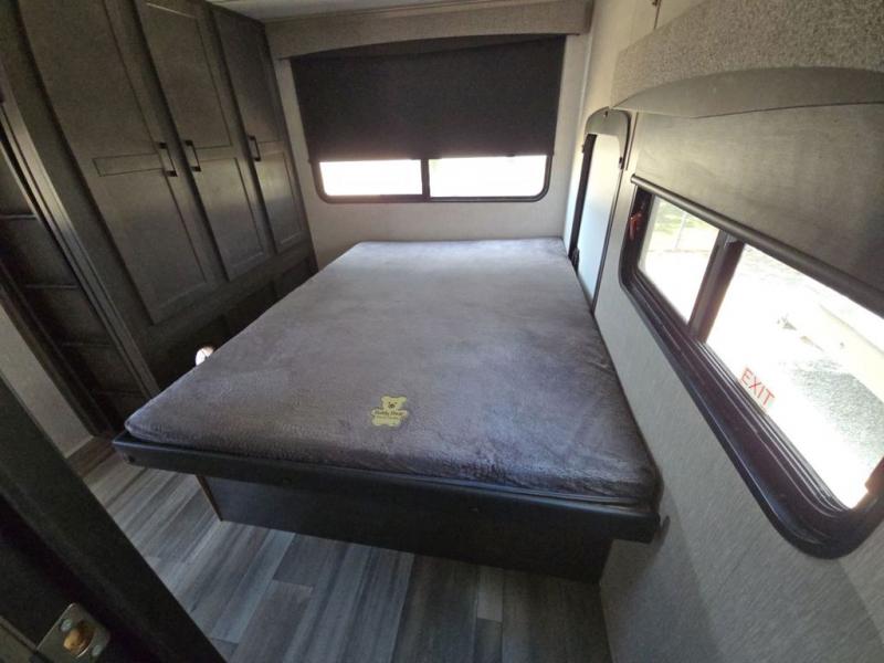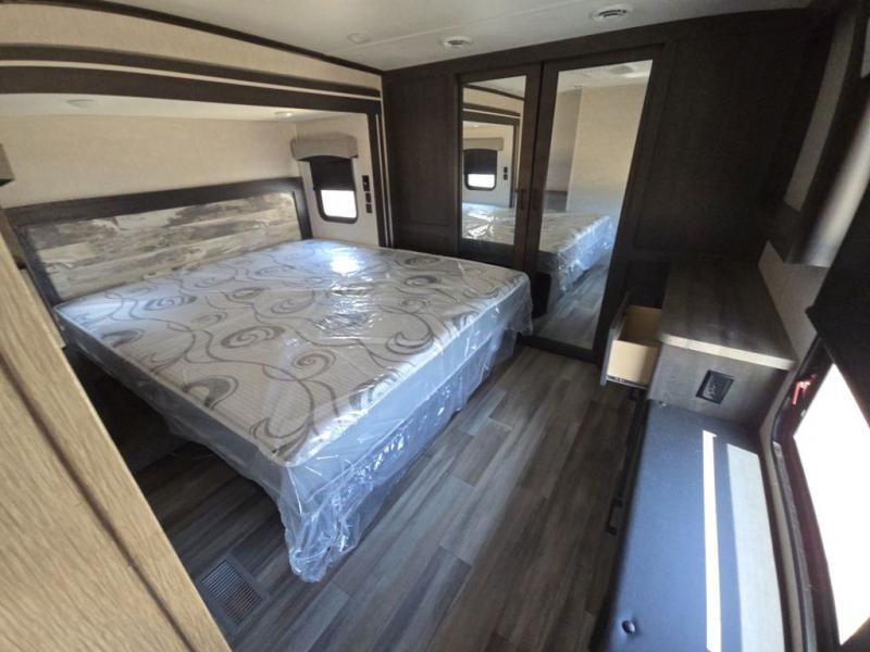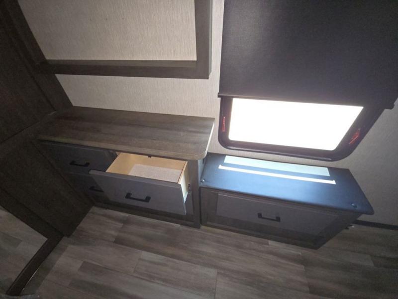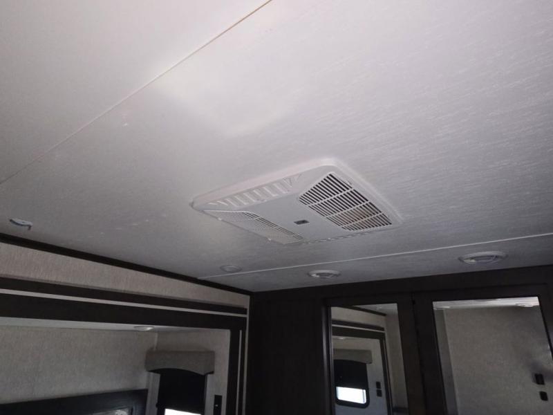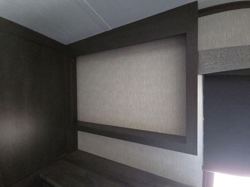 This award-winning Cruiser fifth wheel literally has it all! You will be completely impressed by the many fabulous features found all throughout this model, like the king bed slide in the front private bedroom, the rear bunkhouse suite that has its own half bath and second exterior entry door, and the comfortable living area with a free-standing table with chairs, 50" LED HDTV, and a fireplace. Since there are a set of opposing slides in the main living area, you'll have plenty of room to work around the kitchen island while you prepare dinner. If you are tired of remaining indoors, you can simply take your ingredients outside to use the outdoor kitchen.