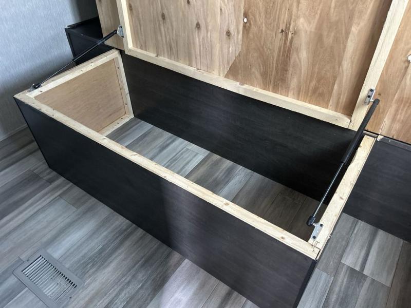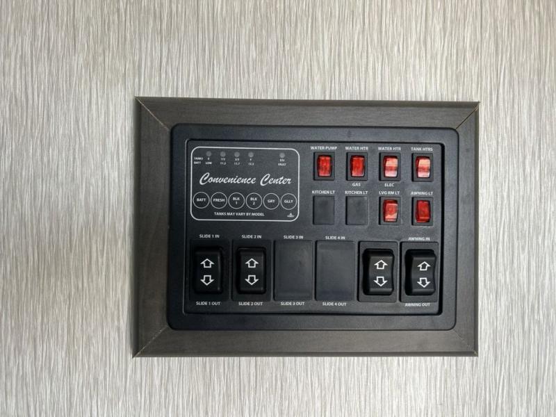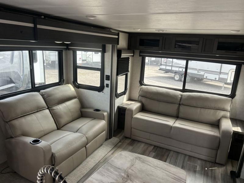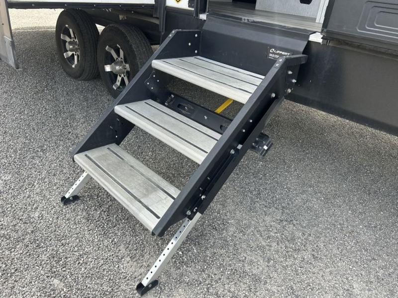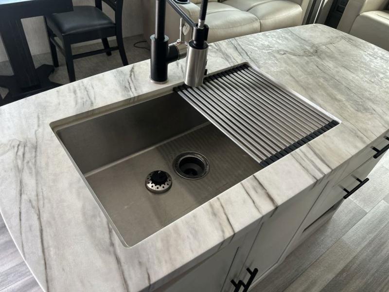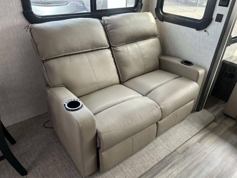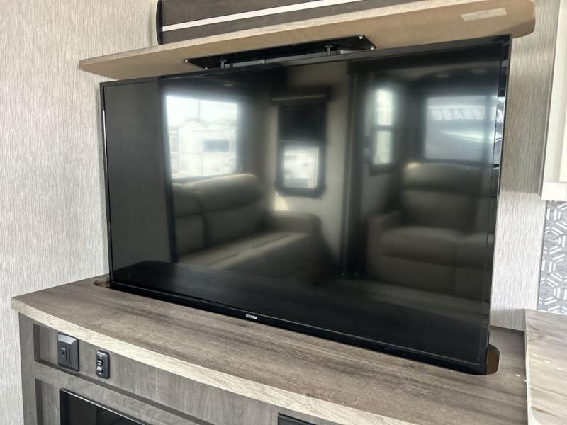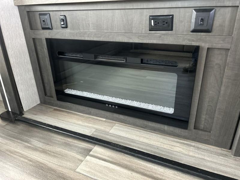 Enjoy the camping lifestyle as it should be; comfortable and convenient, with high-end features as a bonus touch! The dual opposing slides will create an open floorplan, and the kitchen island will bring the whole room together. Your crew will find seating space on the tri-fold sofa, the U-shaped dinette, and the theatre seats that have a great view of the 50" TV TV lift and fireplace. You will appreciate two pantries, with one pantry including space to add an optional washer and dryer to make wash day easier than ever. The full bath includes a 30" x 36" shower with a skylight for more standing space and natural light, and the front private bedroom will provide a great night's rest with its king bed!