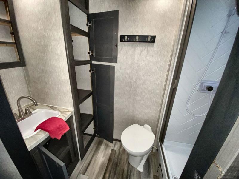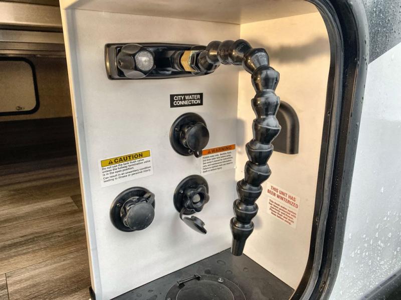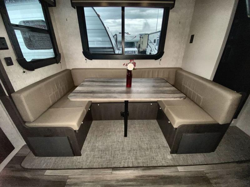Head to the lake for a fun weekend with this travel trailer in tow. Once you arrive at the campground, set up the power awning and grab a cold drink from the outside refrigerator. The large slide out in the main living area will give the dog space to nap on the floor, and the full rear bath is tucked away nicely for privacy. Once the chef of the family has prepared dinner, you can dine around the U-shaped dinette and enjoy a card game afterwards. If you have any overnight guests they can sleep here, and if you're not needing the additional sleeping space, you can choose the optional theater seats in place of the U-shaped dinette. You and your spouse will feel right at home in the front private bedroom that includes a king bed for maximum comfort and dual wardrobes for your clothes!