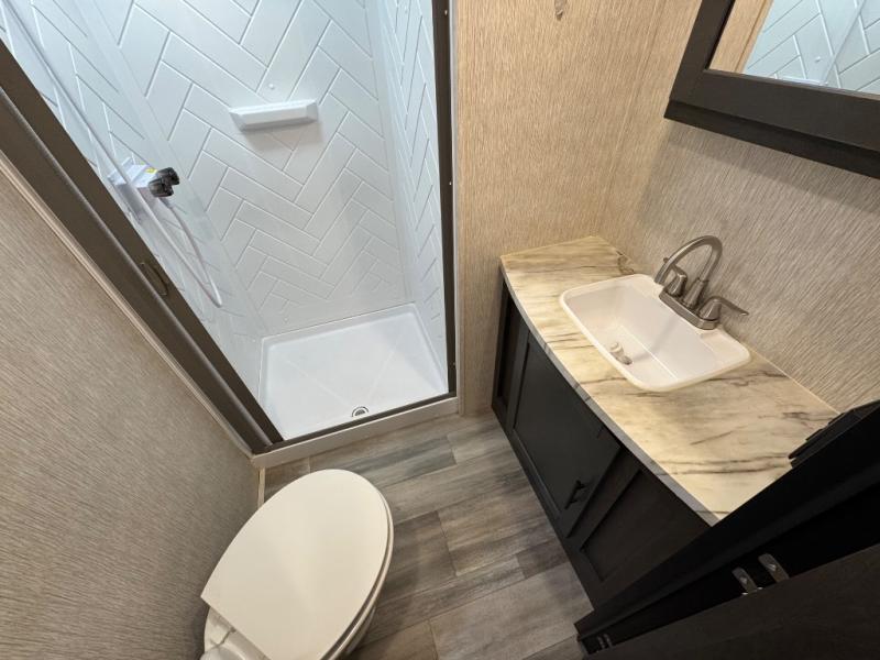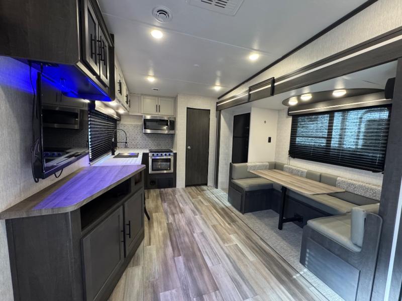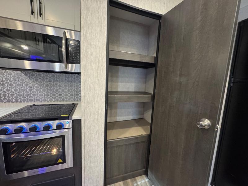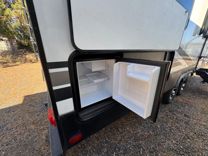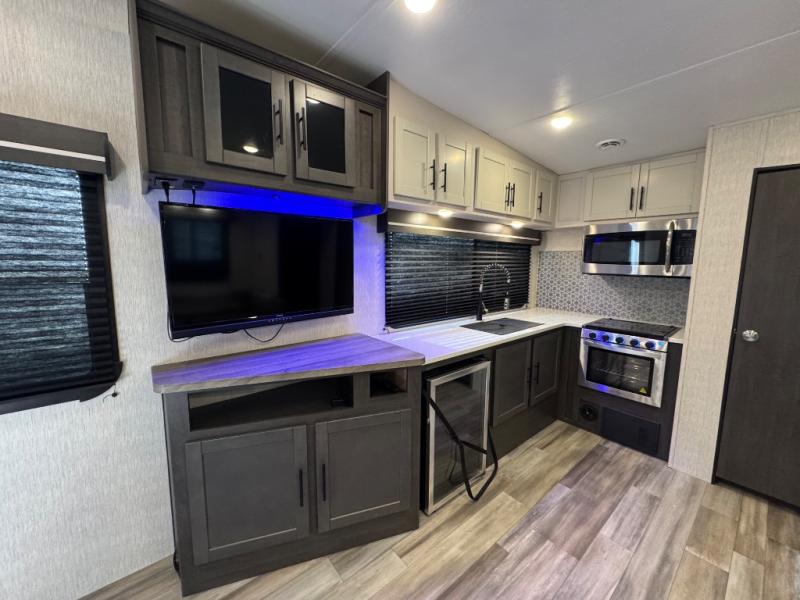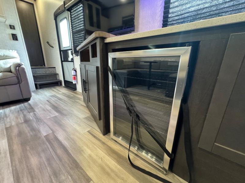 A spacious rear kitchen, plus an outdoor kitchen make this a fun fifth wheel to take to the campground. Make a cold drink from the wine fridge once you arrive at your destination, then head outside to relax under the power awning with LED lights. If the weather isn't coopering, you will find comfortable seating space inside on the tri-fold sofa and the table with chairs. You will appreciate the front private bedroom with a king bed, dual nightstands, and a wardrobe for your clothes!