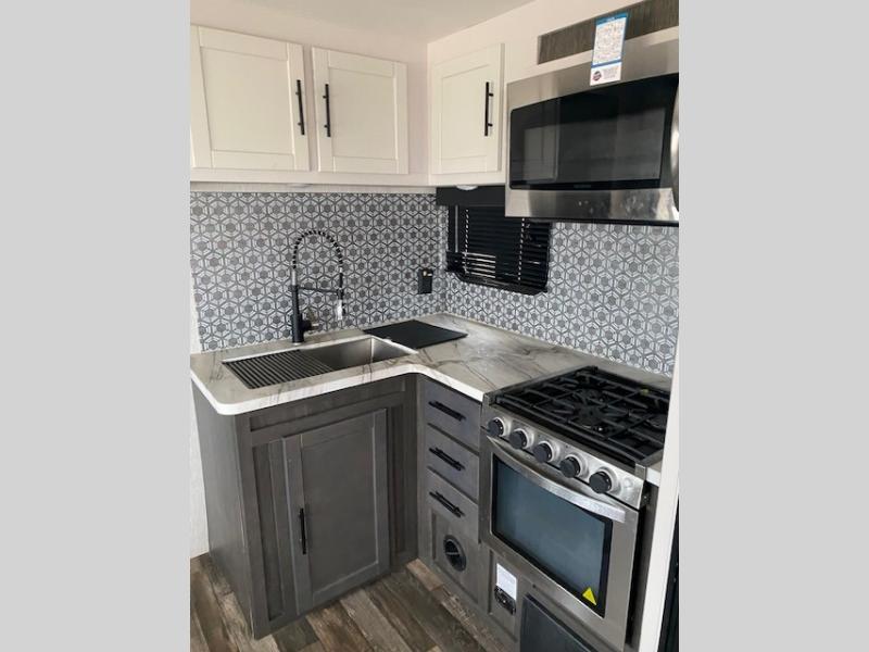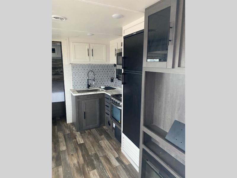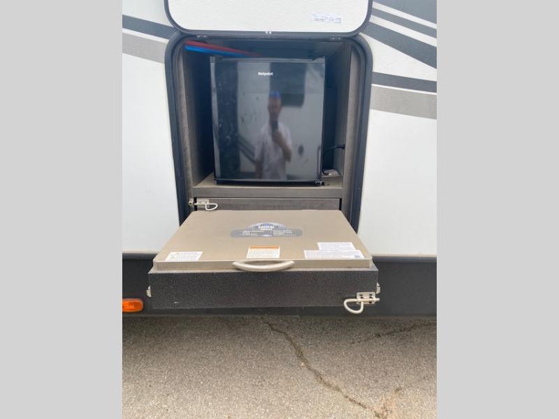 Your family or group of friends will love camping in this spacious travel trailer. The large slide out provides more space to let the dog nap on the floor, and the U-shaped dinette and tri-fold sofa here can double as their sleeping space at night. The chef of the family will have their choice to cook indoors, or outdoors on the outside kitchen, plus there is a power awning with LED lights to provide protection from the elements. Everyone can easily clean up in the spacious full rear bath that includes plenty of counter space and a closet that has been prepped to add an optional washer and dryer for convenience.