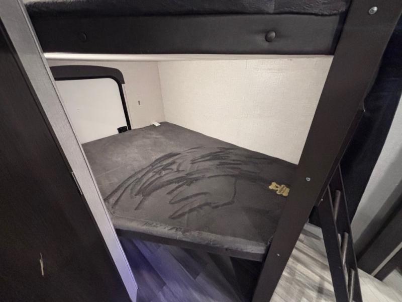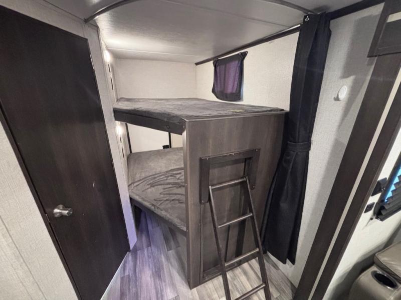 The kids or friends will be begging to go camping every other weekend in this travel trailer that includes double-size bunks. You'll appreciate the door by the bunks and the bottom hinge that will allow you to easily load luggage, coolers, or lawn chairs. Set up the power awning once you arrive at your destination, then prepare lunch on the outside kitchen. You can dine outside on the picnic table, or sit around the U-shaped dinette inside the unit. Mom and dad will love the front private bedroom that includes a king bed for all-around comfort, plus their own exterior entry door for convenience!